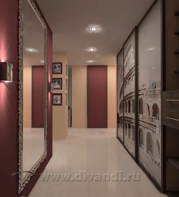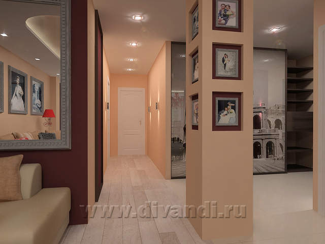 Дизайн проект выполнен в современном стиле, но мы видим сочетание современных материалов и традиционного классического декора. Квартира для молодой семейной пары. Гостиная и кухня объединены в одно помещение-студию. Стойка-стена для для ТВ функционально разделяет кухню и гостиную и, в то же время ее высота, недоходящая до потолка, сохраняет единое пространство и не приглушает естественное освещение. Площадь кухни-гостиной была увеличина за счет присоединения двух лоджий с утеплением наружных стен и установкой дополонительного остекления. Полученную площадь мы использовали для создания рабочей и обеденной зоны. На несущих колоннах, которые остались от демонтированных стен, разместились рамки с фотографиями и декоративные фарфоровые тарелки. Спальня выполнена в шоколадной цветовой гамме и большим количеством золота. Использовано много линейной подсветки, дающей мягкий, рассеянный контурный свет. Для ТВ зоны из гипсокартона возведена монументальная рама, оформленная шелковыми текстильными