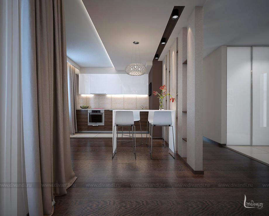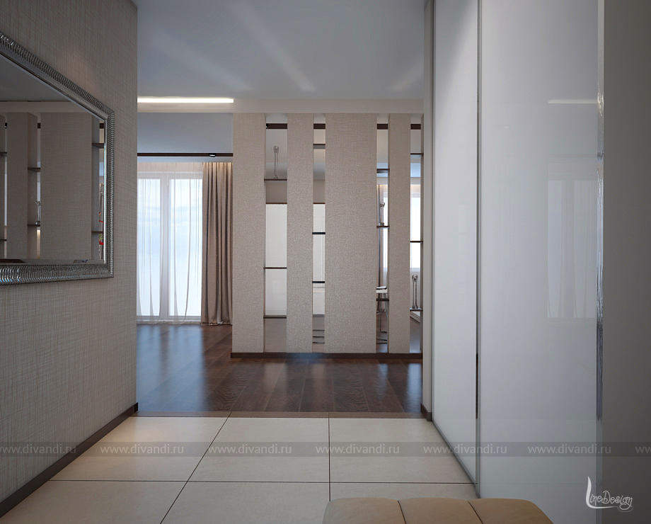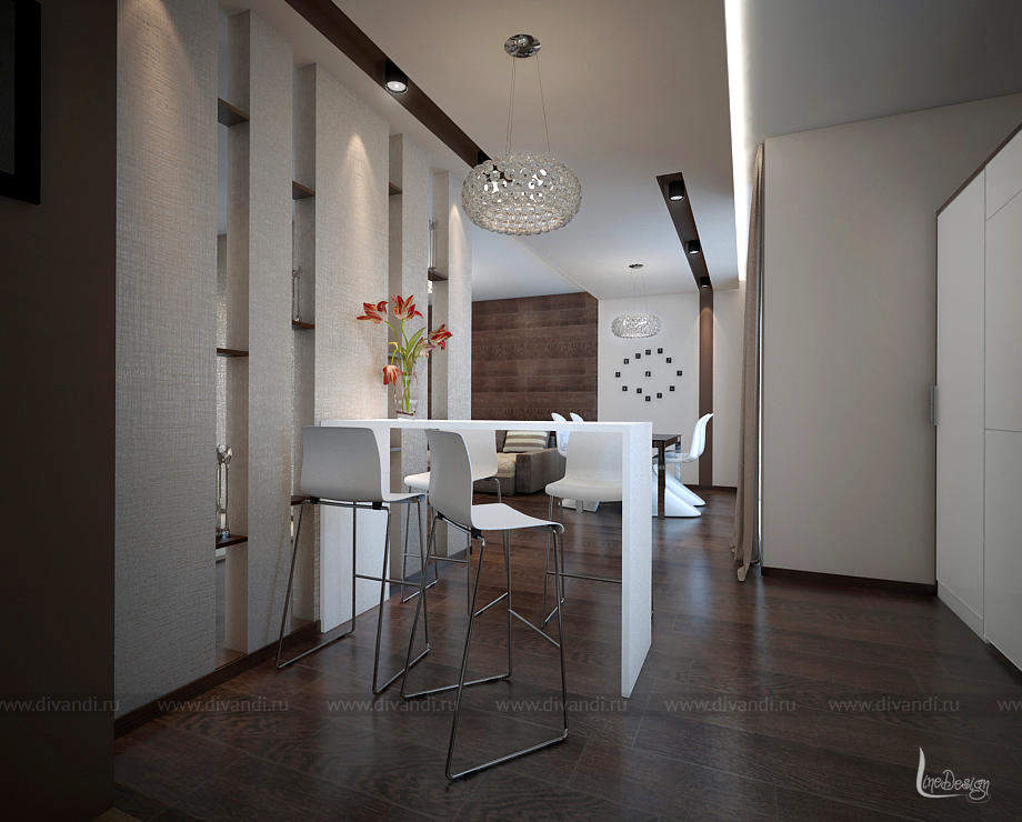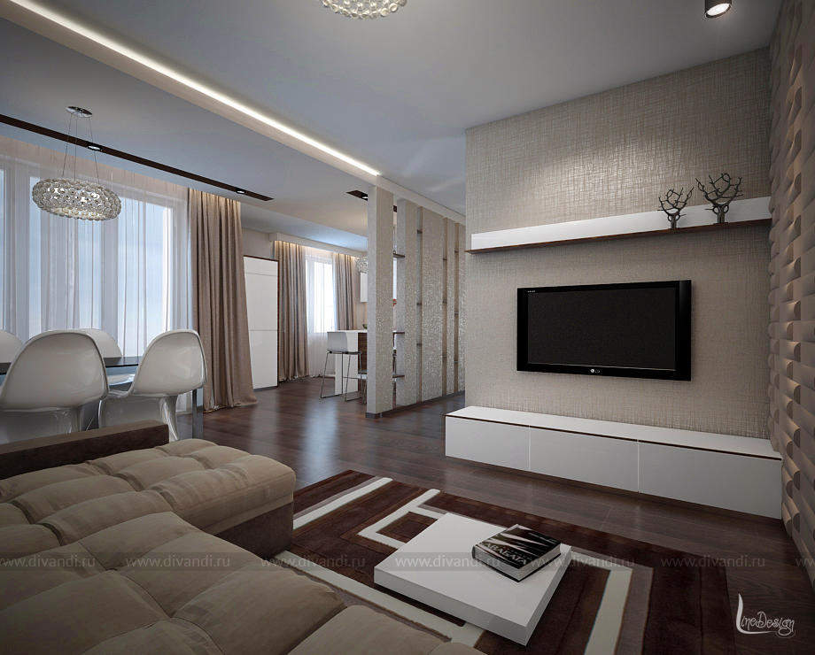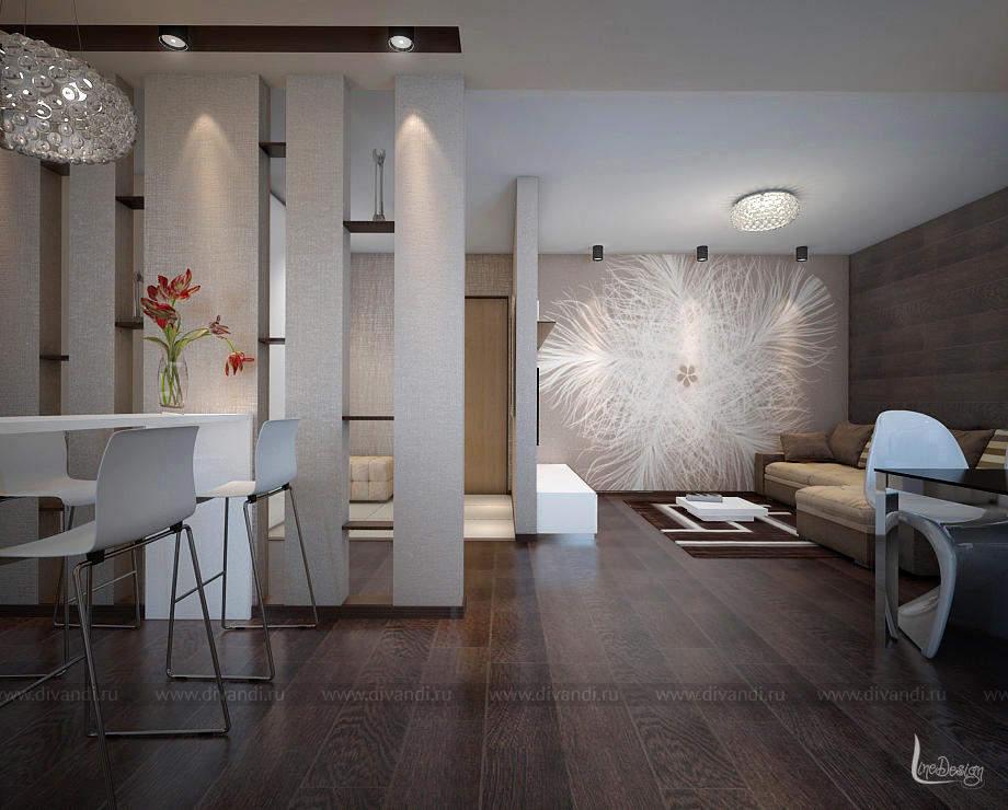 Гостиная выполнена в монохромном цветовом решении, основным декоративным элементом является конструктивное решение перегородки между кухней и прихожей, выполненной с промежутками, создающими эффект "жалюзи" при дневном освещении.