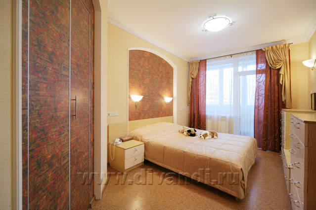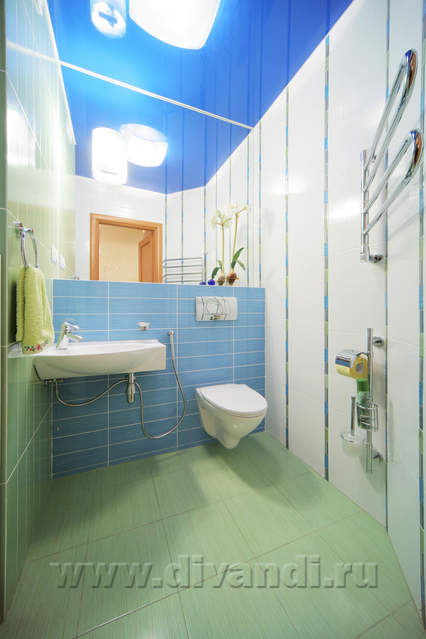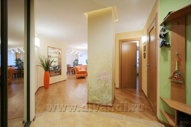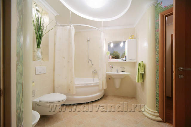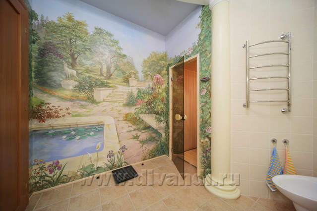 Изюминкой интерьера стало дизайнерское решение ванной комнаты, одна из частей которой выполнена в форме ротонды, заходя в нее по дорожке из булыжника, мы попадаем прямо в летний сад, умело созданный росписью художника.