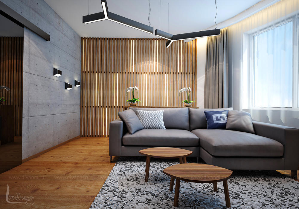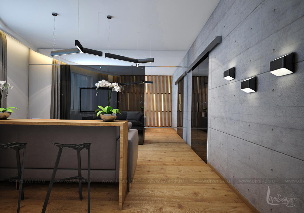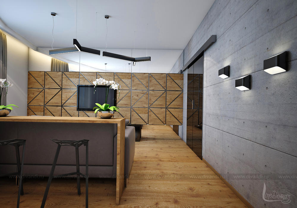 Интерьер построен на контрасте природных и урбанистических материалов. Каждый материал подчеркивает богатую текстуру и изысканную глубину материала «соседа». Освещение усиливает это взаимодействие.