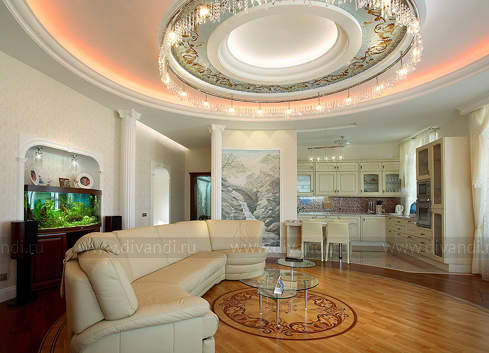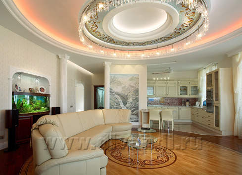 В прямоугольном объеме дизайнер создала радиальную гостиную. Круг рисунка паркета с узором в центре композиционно связан с кругом потолочной конструкции, центром которого стала великолепная люстра с витражами, выполненная на заказ. Уютный полукруглый кожаный диван молочного цвета мягко огибает изящный столик с круглыми стеклянными столешницами. Стройные колонны и настенная роспись превращают гостиную в торжественный холл, который выглядит уютно и современно благодаря лаконичности форм стульев и обеденного стола. Хотя гостиная и кухня находятся в одном объеме, разделенные радиальной стойкой, они представляют собой совершенно самостоятельные помещения. Четко зонируют пространство на гостиную и кухню разные напольные материалы: паркет в зоне гостиной и керамогранитная плитка – в кухне.