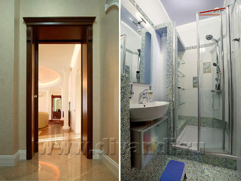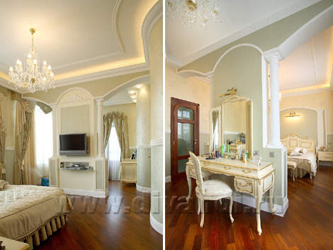Интерьер спальни восхищает роскошью дворцового стиля. Белоснежные колонны, арки, пилястры, роскошная белая мебель с позолотой, изысканный текстиль и парадными люстрами – великолепная спальня достойна коронованных особ. Торжественная атмосфера с нотой вальяжности создана специально для хозяйки квартиры. Королевский стиль присущ и интерьеру ванной комнаты.