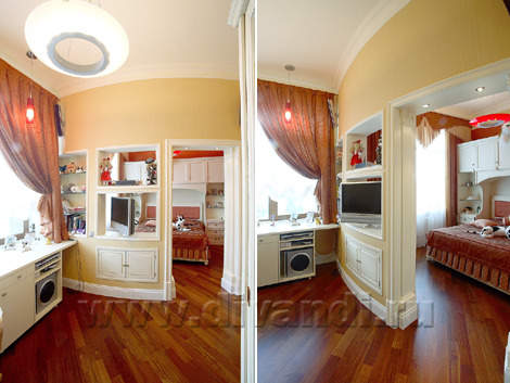 Комната дочери, девочки-подростка, – покои принцессы. Белоснежная классическая мебель наполняет интерьер светом. Нежный кремовый оттенок настенной штукатурки гармонично сочетается со сдержанным кирпичным оттенком текстиля и отделки стен в зоне спальни. Рабочая и спальная зоны разделены радиальной перегородкой с прорезными нишами, в одной из которых размещена телевизионная панель. Ее можно поворачивать и смотреть телевизор, лежа на кровати или сидя за рабочим столом.