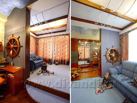 Комната сына – мечта любого настоящего моряка. Эта комната разделена на две зоны, причем спальная зона была поднята на подиум, превратившись в верхнюю палубу корабля. Морская тема поддержана конструктивно-декоративными элементами: прорезной нишей в форме корабельного штурвала и конструкциями на потолке, имитирующими такелаж. В рабочей зоне волнообразный потолок одновременно и небо и море, и в этом нет ничего удивительного, ведь на горизонте граница между ними стирается.