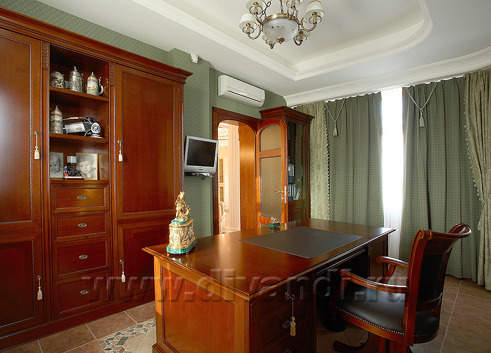 Солидность и высокий статус своего владельца подчеркивает интерьер кабинета. Строгость классических форм массивной и основательной мебели: письменного стола и шкафов, сочетается с роскошными текстильными композициями, закрывающими выходы на балконы.