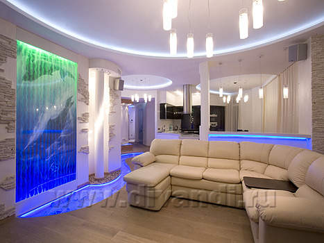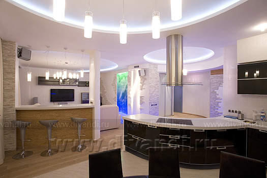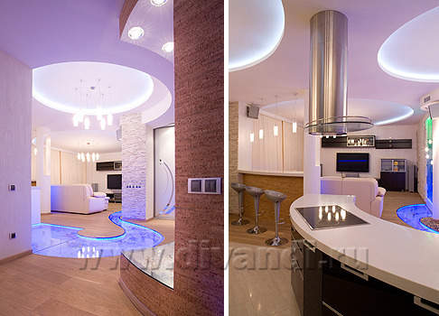 В основу концепции легли плавные радиусные линии, объединившие большое гостевое пространство – стеклянная дорожка на полу, гнутые стены из гипсокартона, отделанные шпоном светлого дерева, кухня Scavolini из черного стекла, радиусная перегородка, цветная светодиодная подсветка, темно-синие стеклянные двери в алюминиевой коробке – все это сделало эту квартиру оригинальной, соответствующей духу хозяев – целеустремленным и динамичным молодым людям.