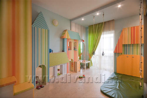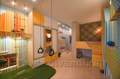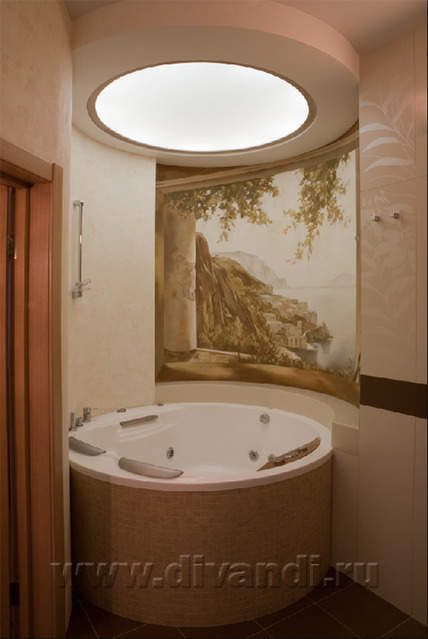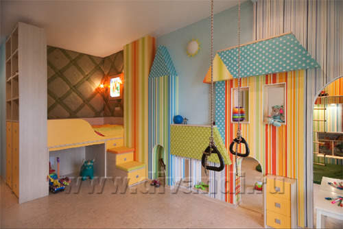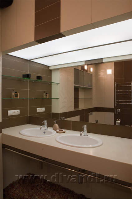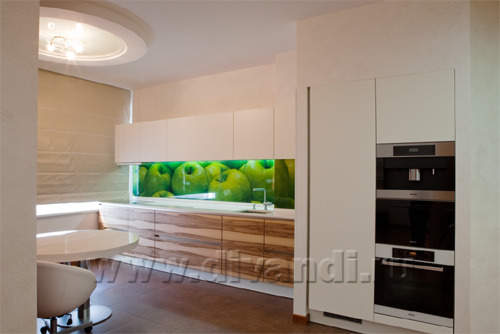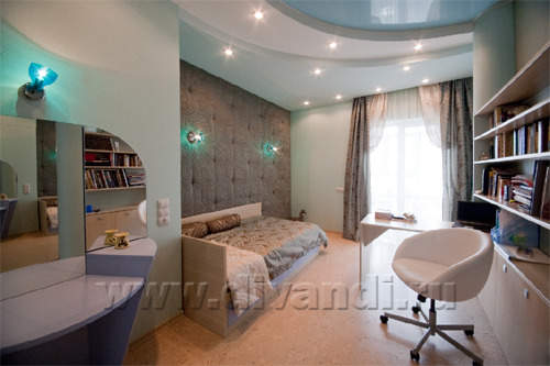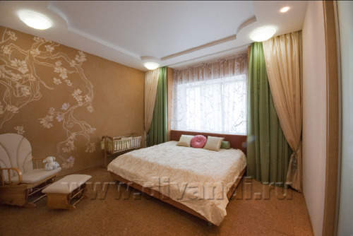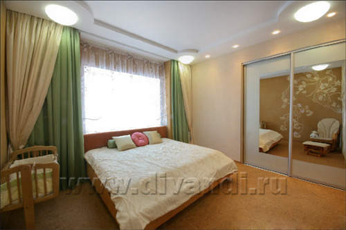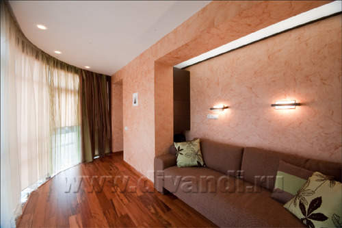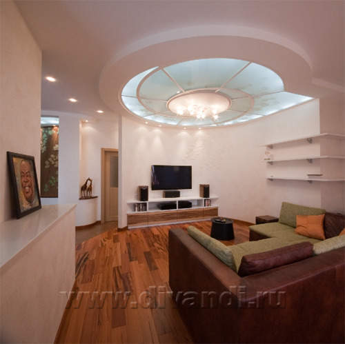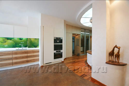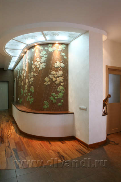 В данной квартире была сделана серьёзная перепланировка, которая задала динамику помещениям. Вихрь листьев в световом фонаре потолка, создаёт впечатление лёгкости и радости.