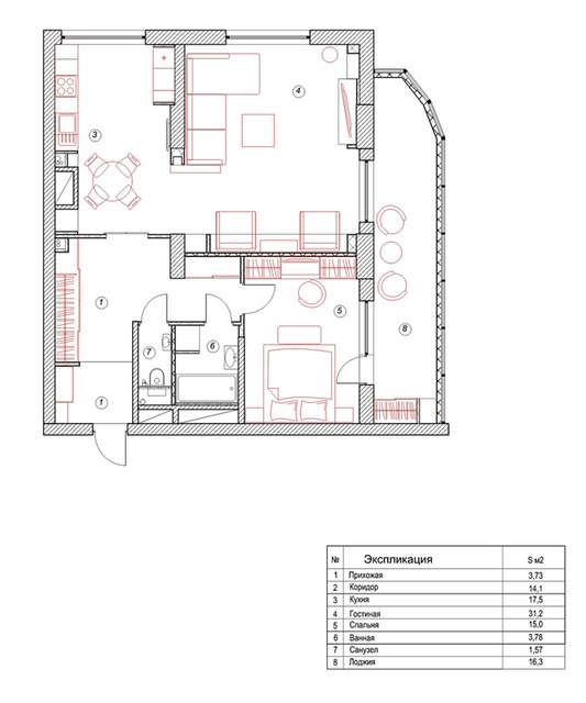 За счет коридора были увеличены площади ванны и санузла. Заделан дополнительный проем в гостиную, что позволило выделить место для устройства дополнительного шкафа купе.