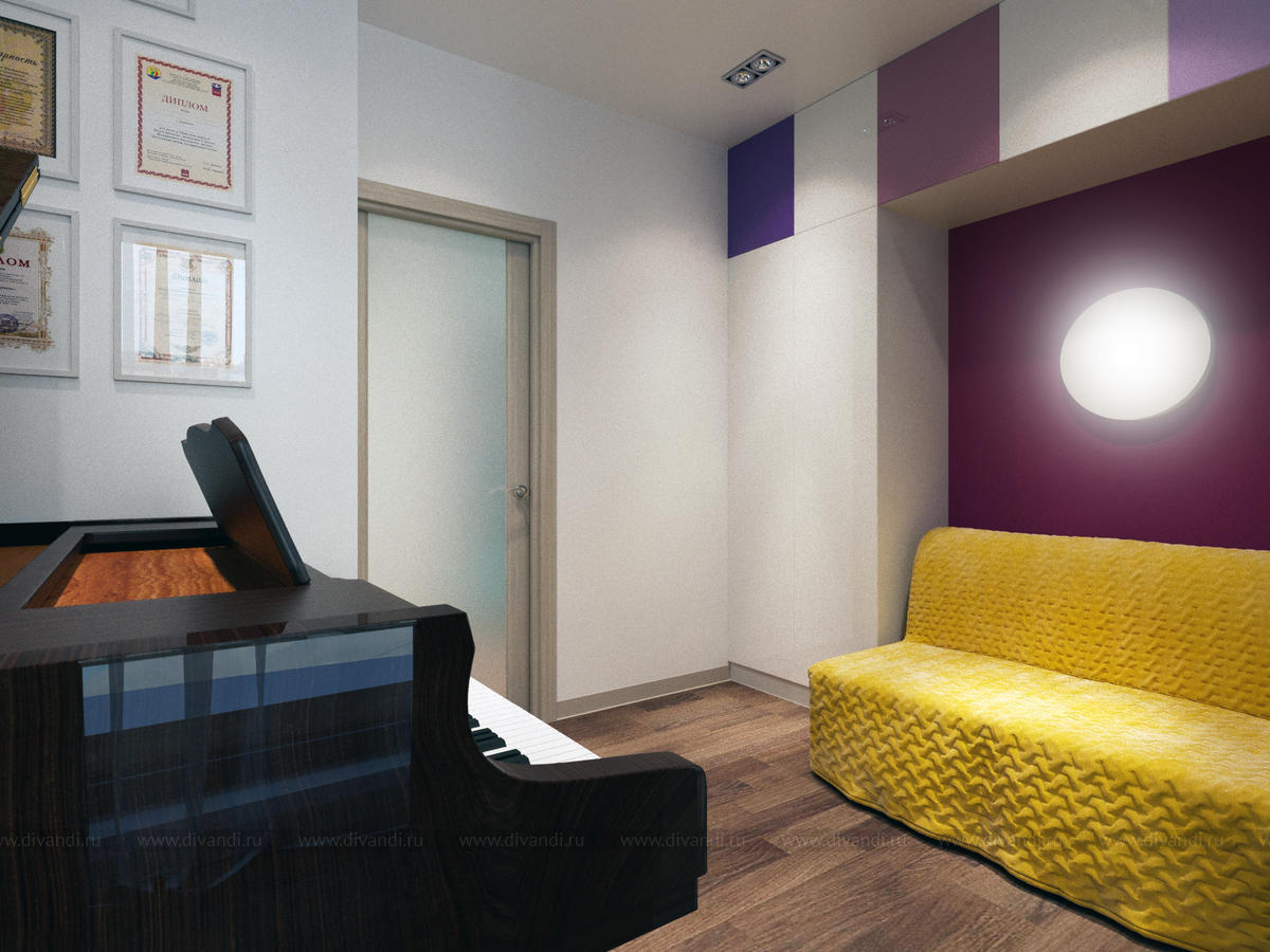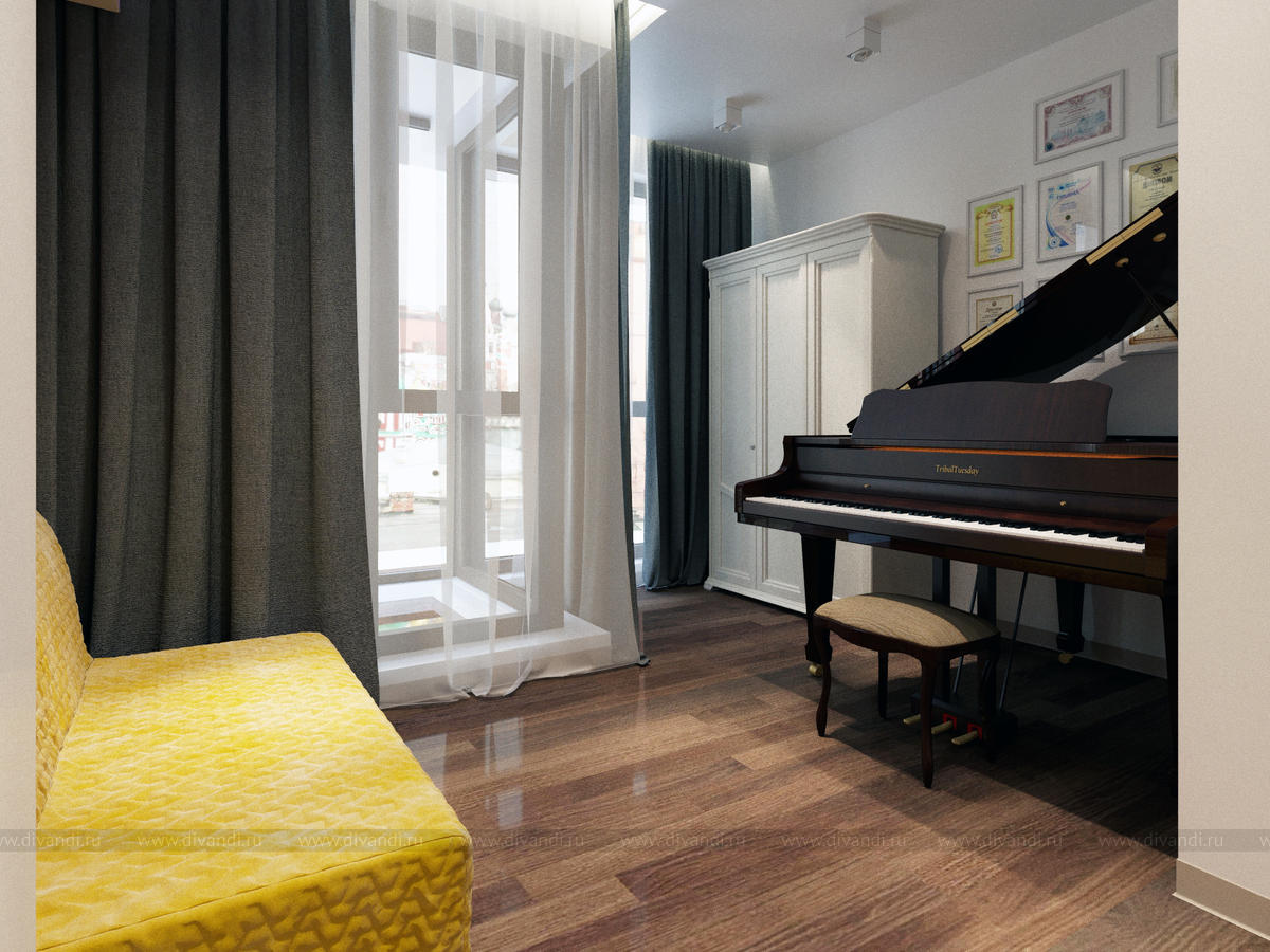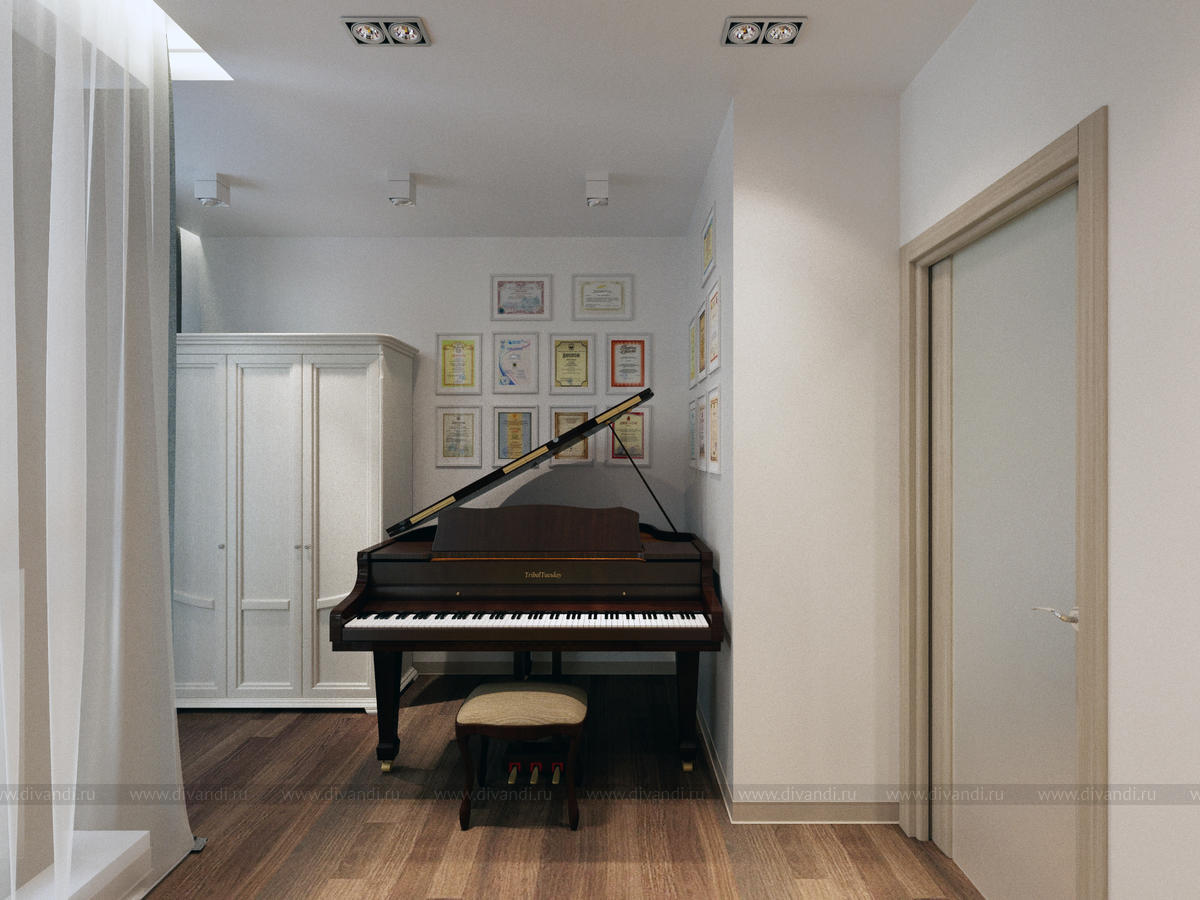 Главным требованием было наличие большого рояля, который удачно вписали в нишу.