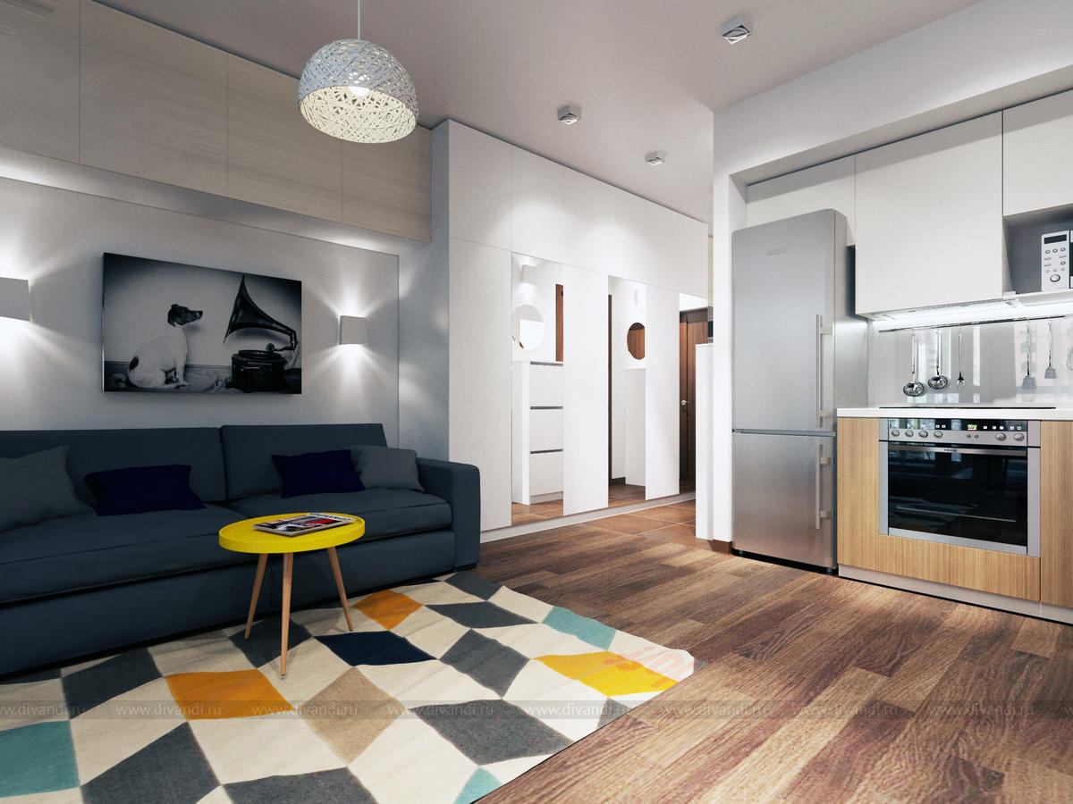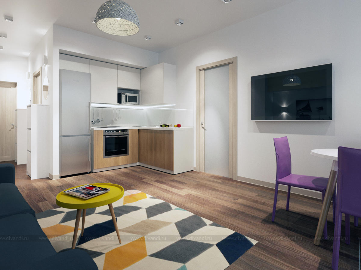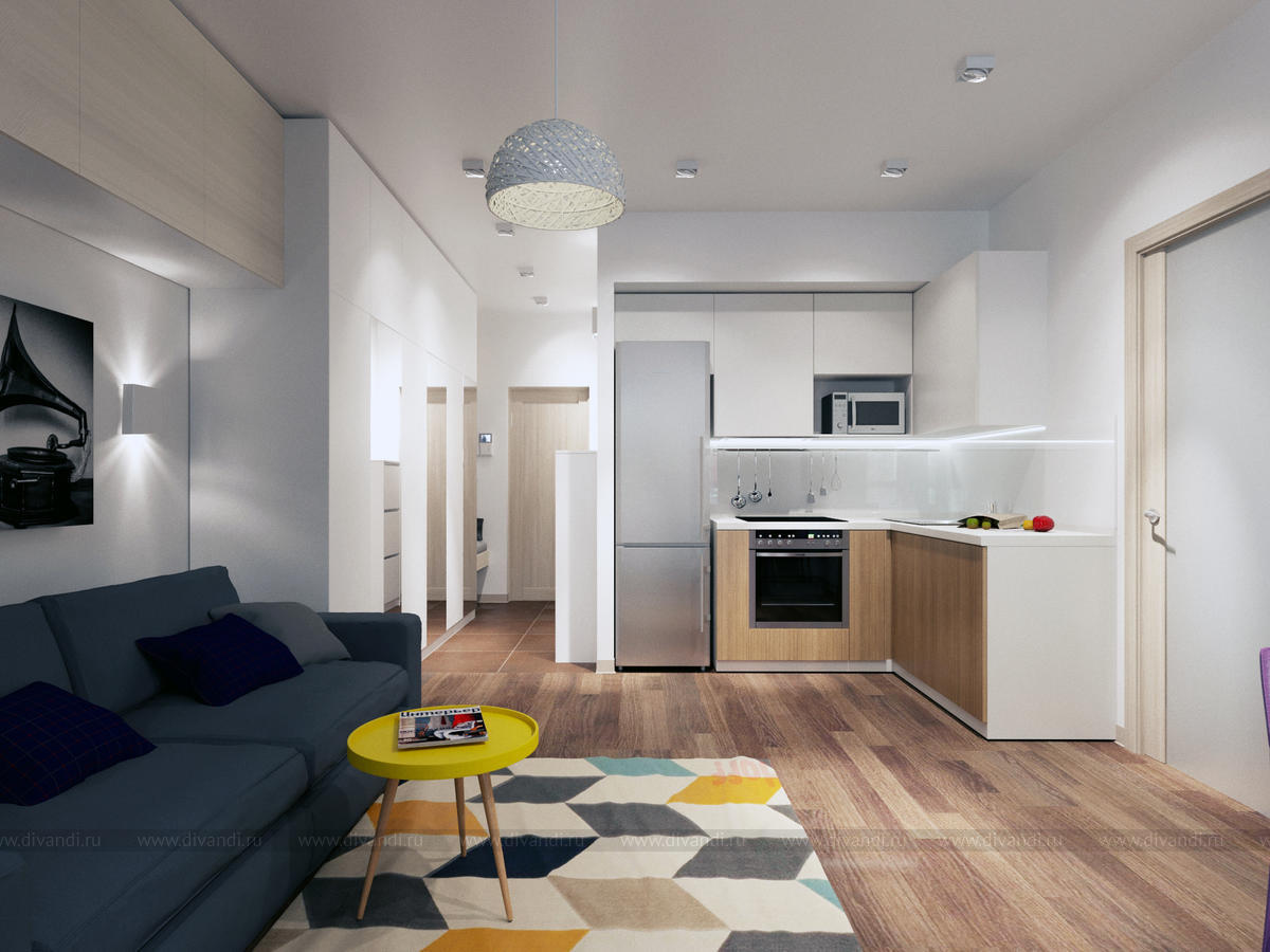 Квартира для семьи с 2 детьми. Кухня, совмещенная с гостиной и детская,разделенная на 2 комнаты-для мальчика и для девочки.