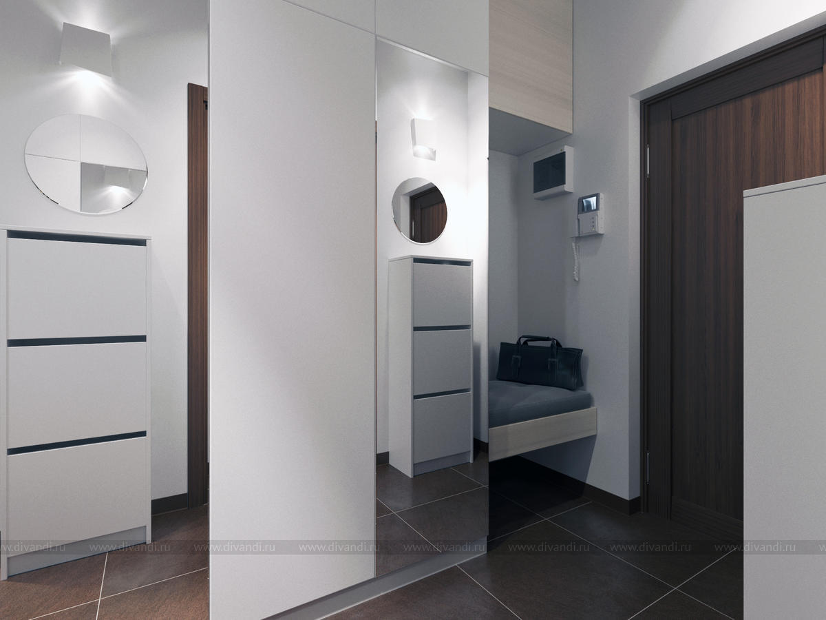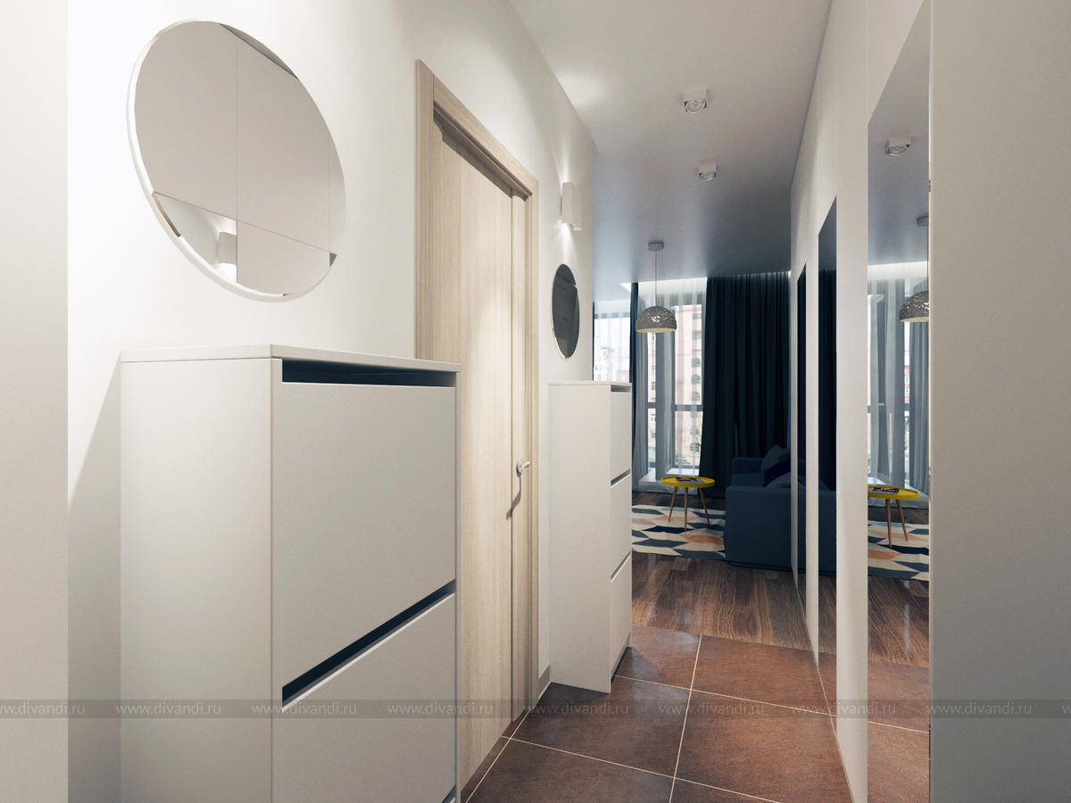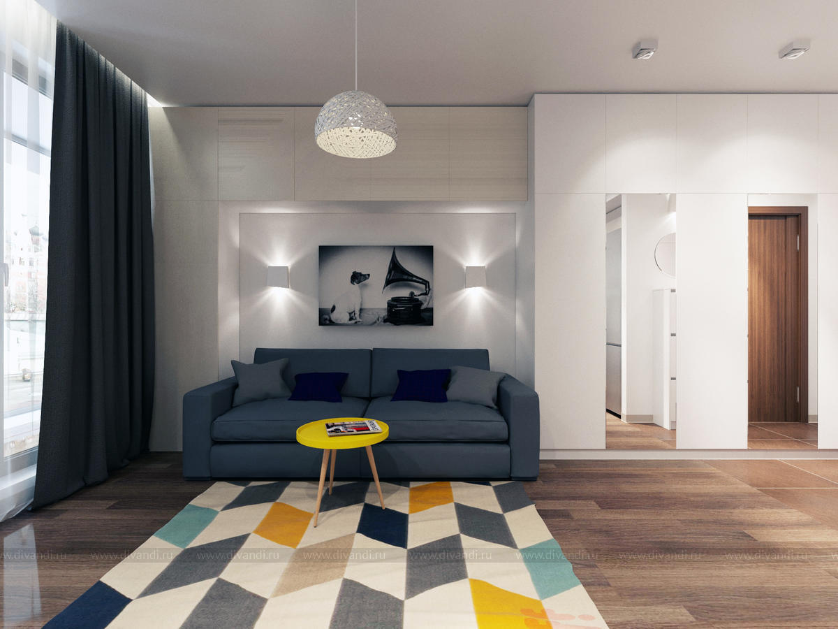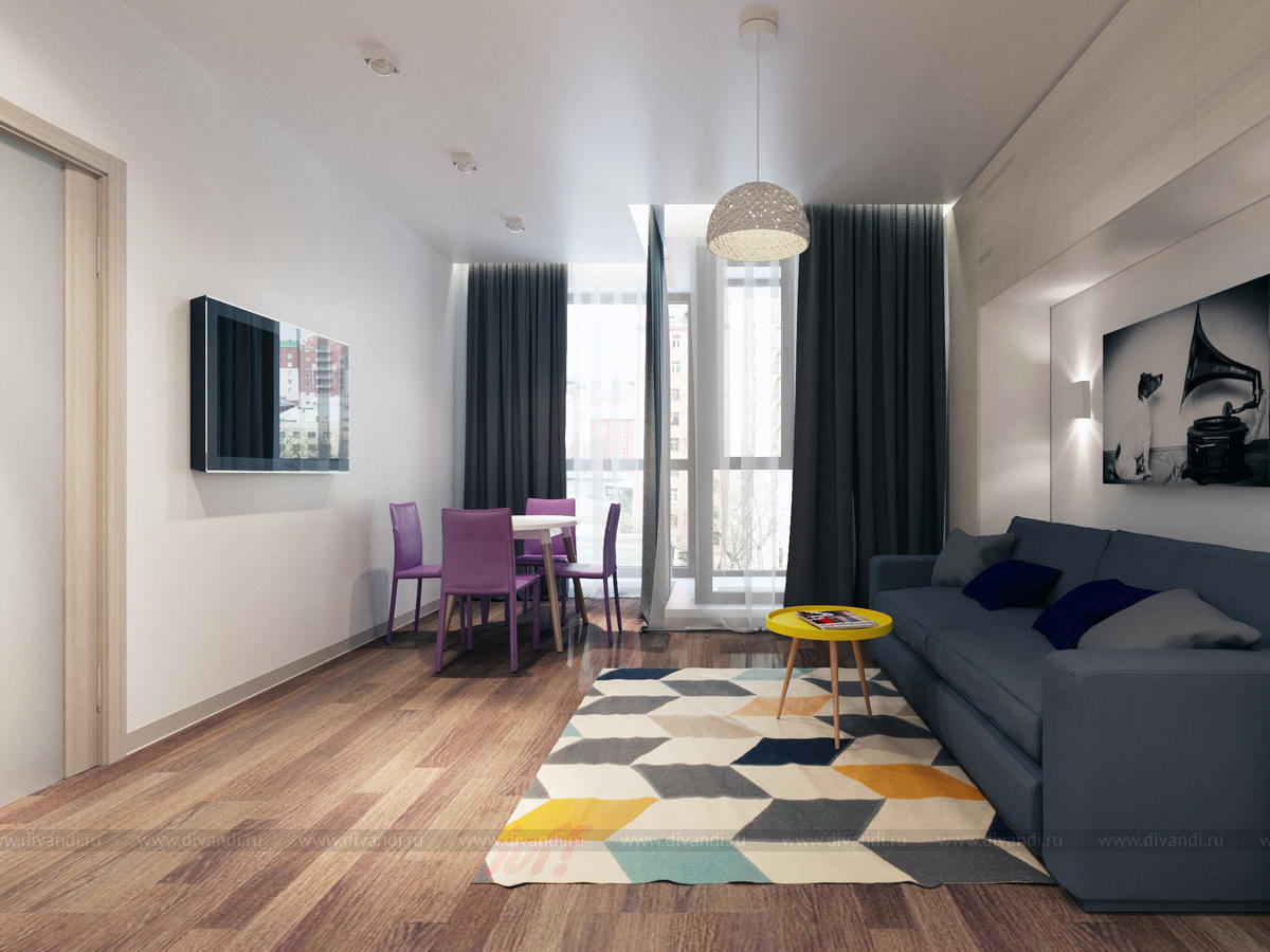 Квартира для семьи с 2 детьми. Кухня, совмещенная с гостиной и детская,разделенная на 2 комнаты-для мальчика и для девочки.