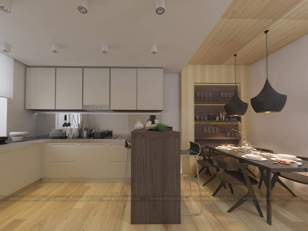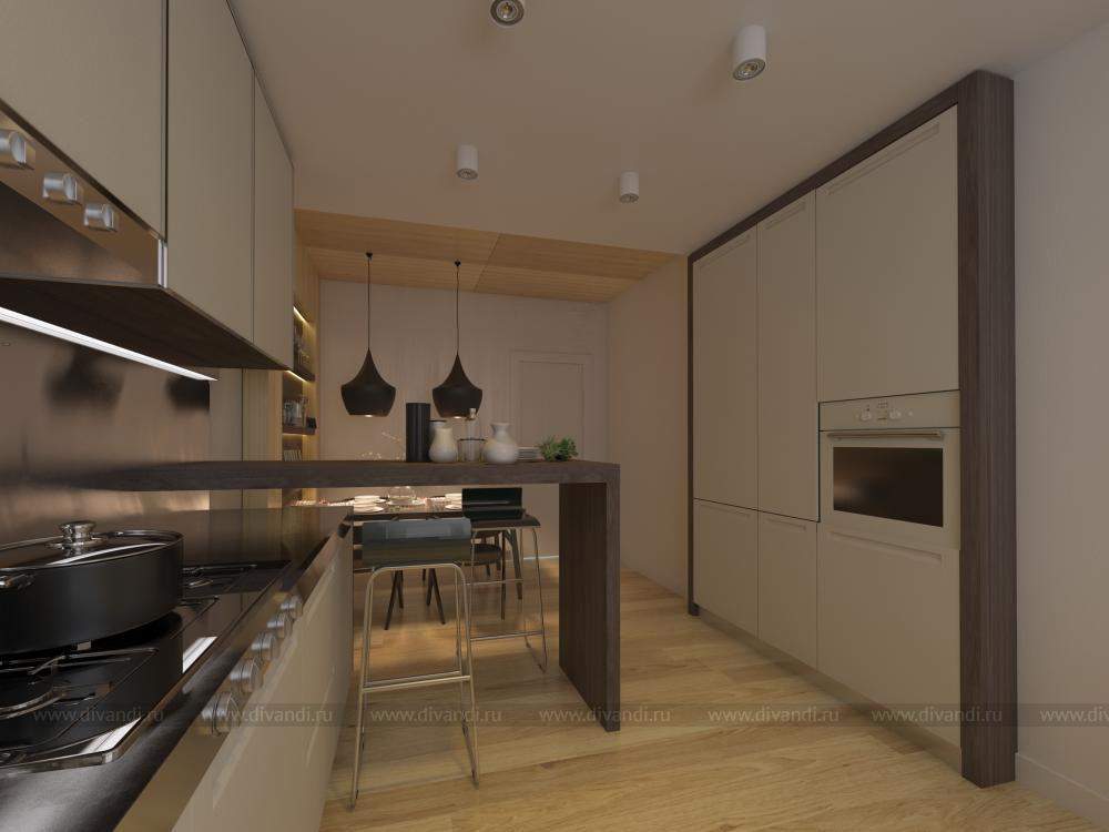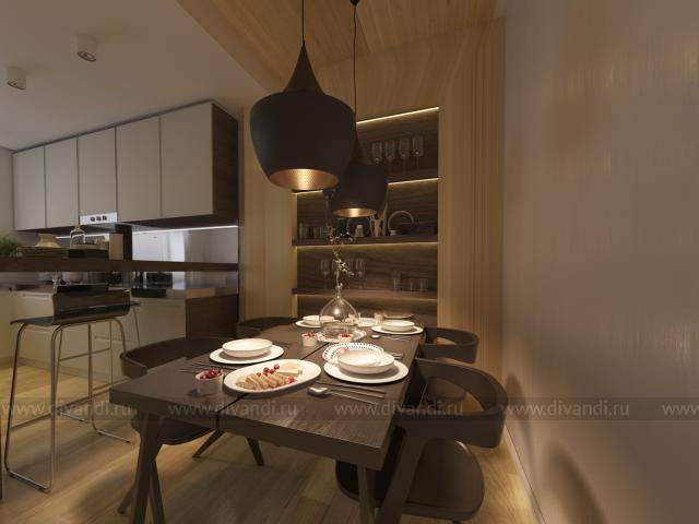 Главный акцент в кухне - это дерево в материалах стен, потолка и мебели, что выигрышно смотрится на фоне светлой отделки помещения. Кроме того дерево дарит тепло и уют. Данные решения сделали квартиру более интересной и функциональной.