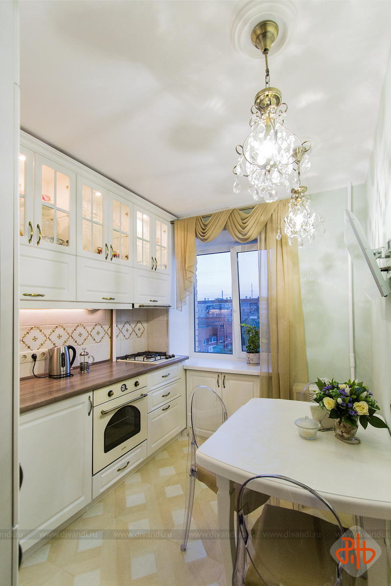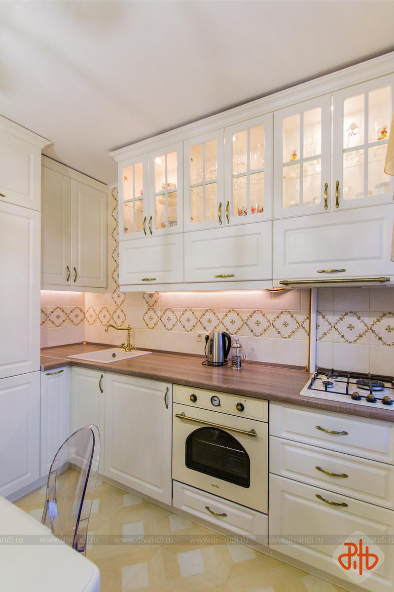 Реализованный проект кухни 7 м2, выполненный в легкой классике.