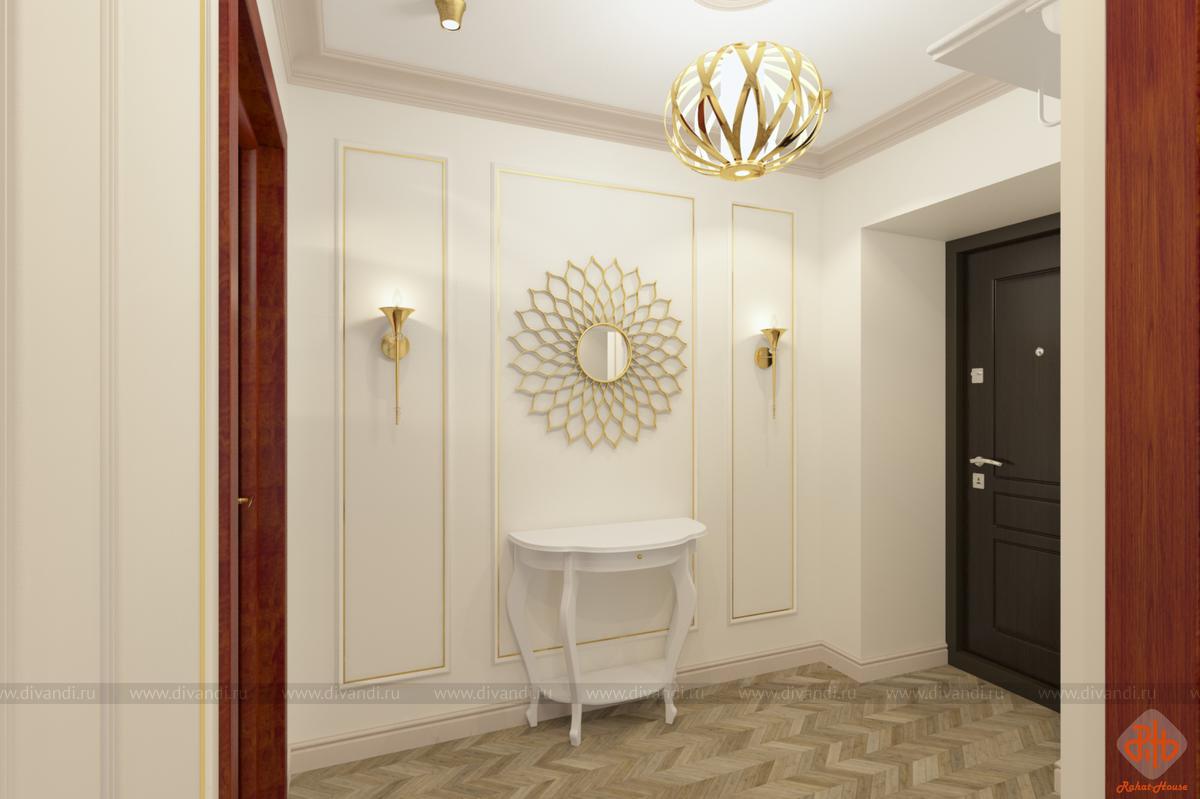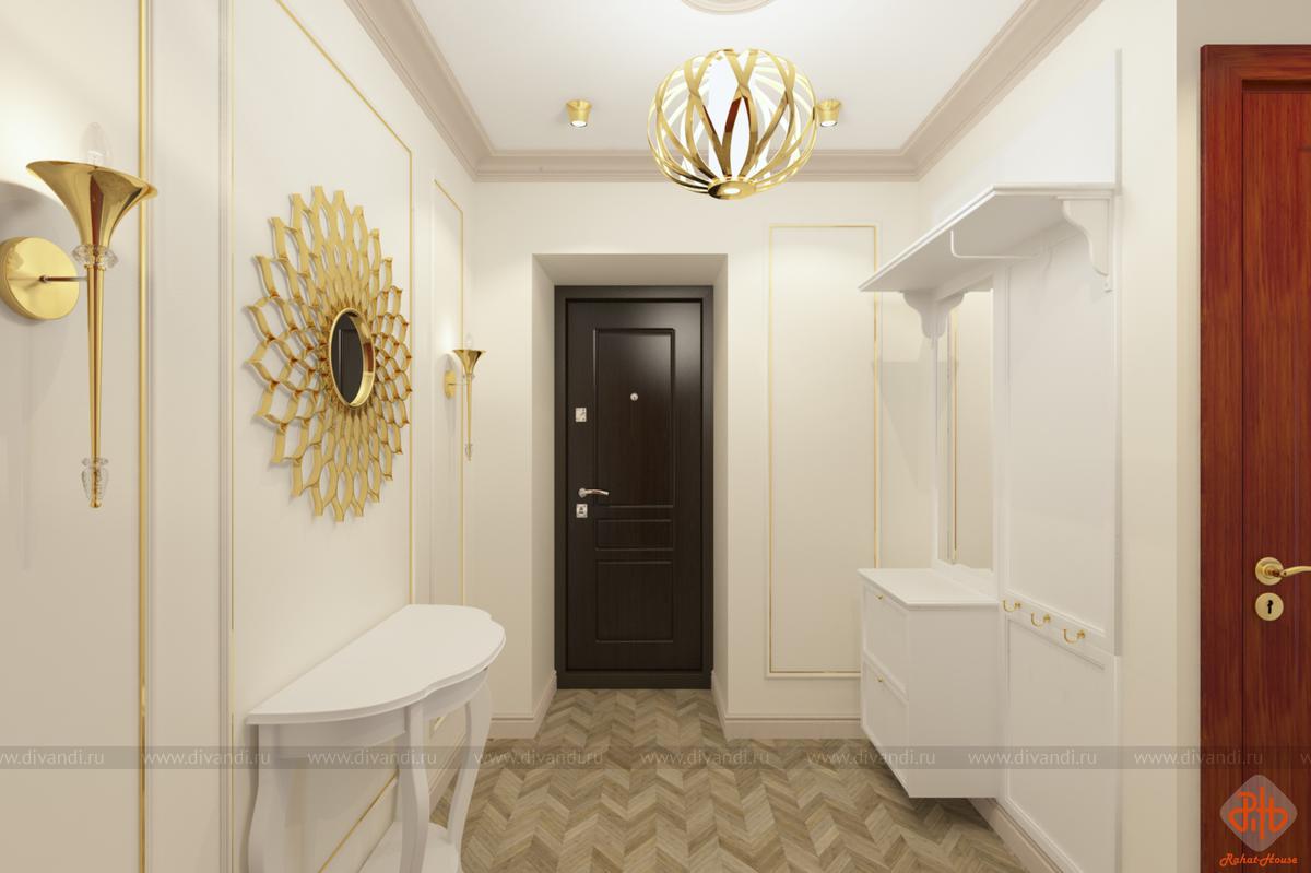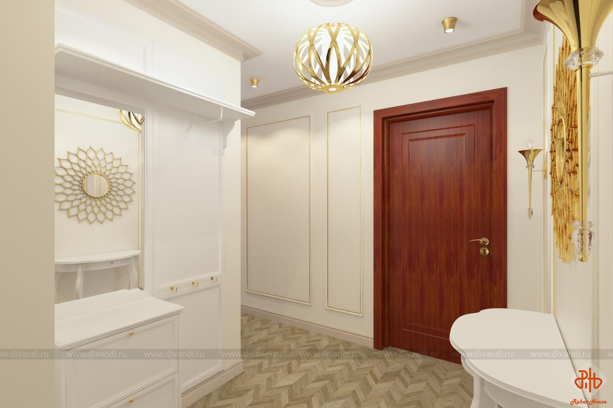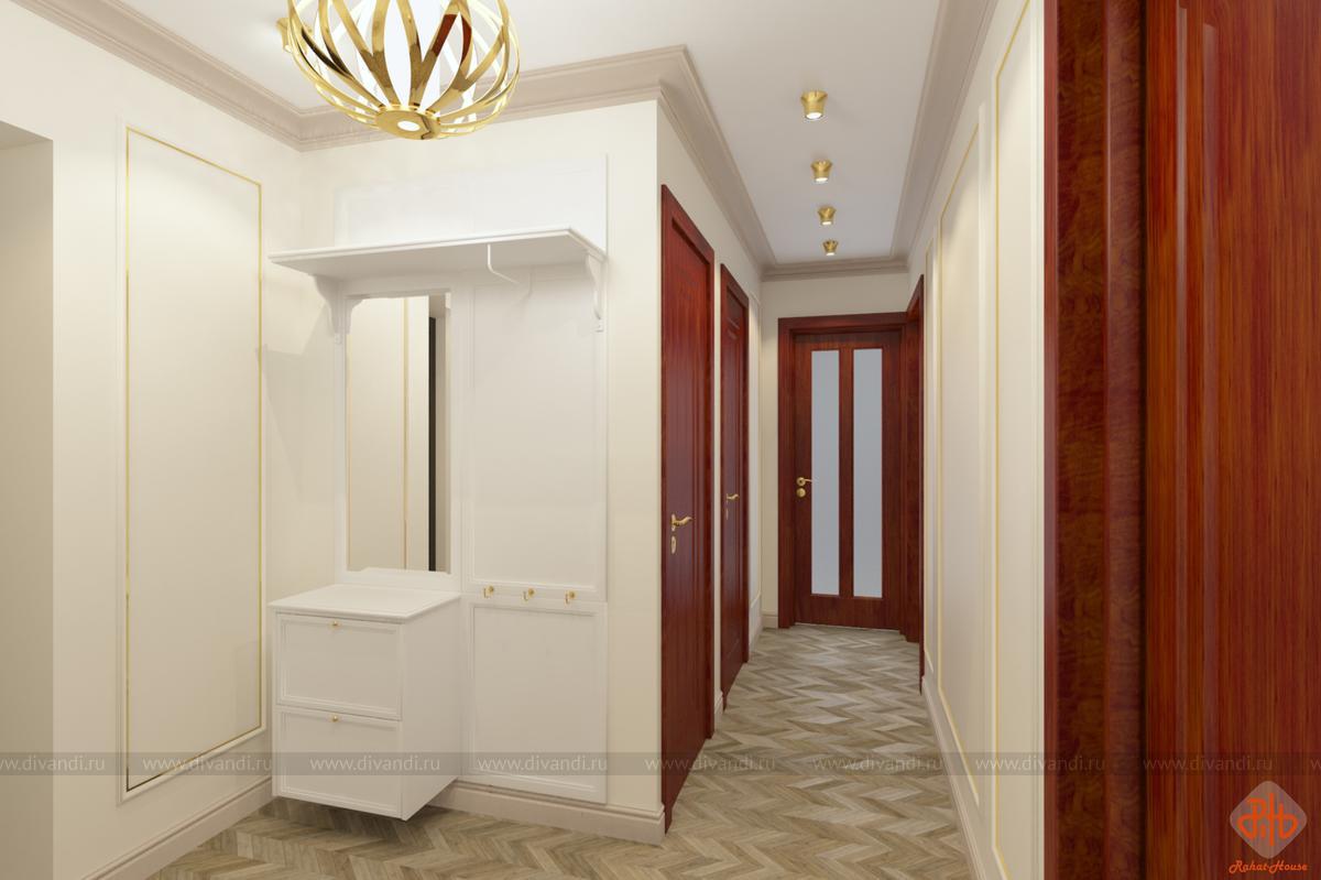 Эскизы прихожей-коридора в современной классике. Хранение несезонной одежды и обуви предусмотрено в гардеробной в комнатах.