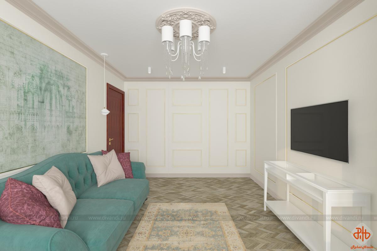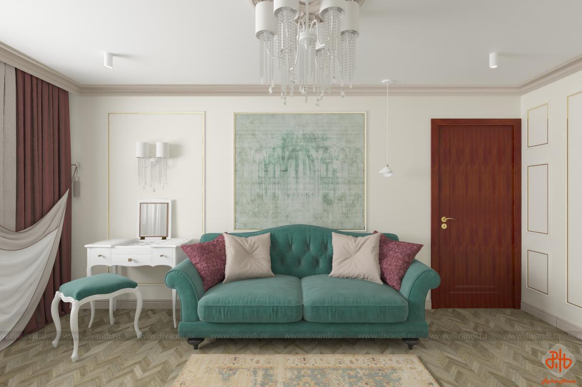 Эскизы гостиной-спальни с раскладным диваном. Т.к. кухня в квартире очень мала, родительская спальня предусмотрена с раскладным диваном, для возможности проводить время в остальную часть дня. Вместительный шкаф-гардеробная, замаскированный отделкой.