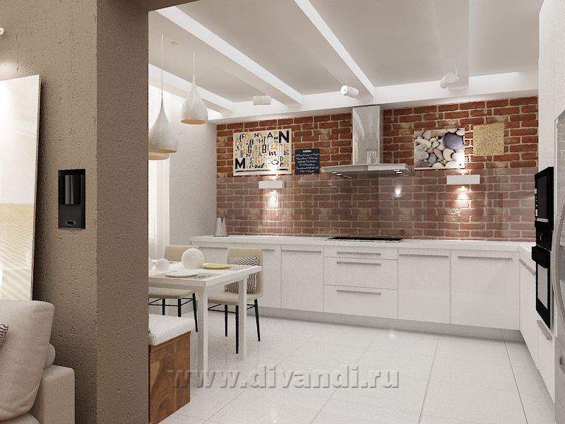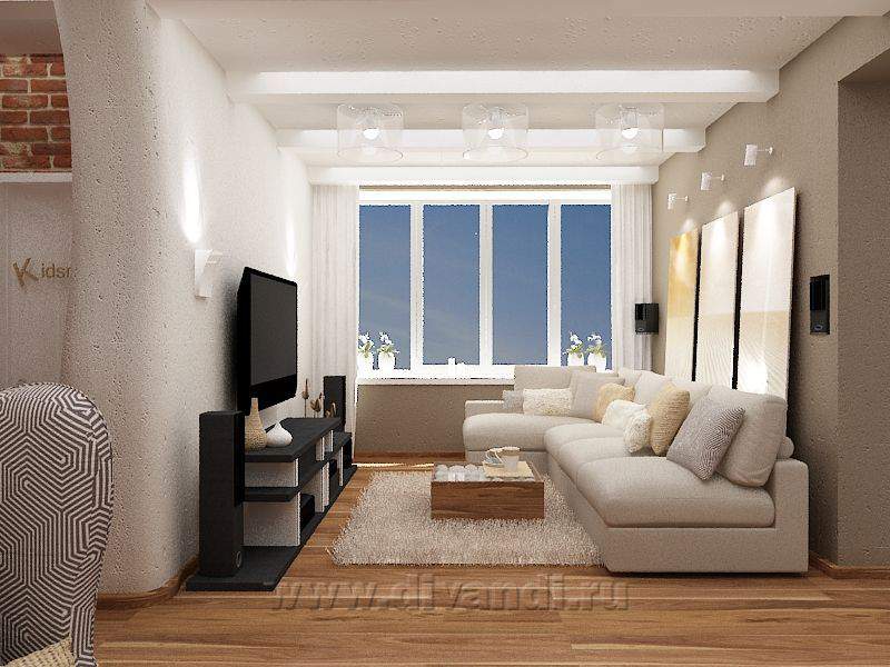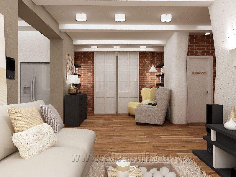 Балки на потолке, кирпич, искусственно деформированные стены с грубой текстурой камня. При этом много деталей, которые придают помещению уют, - это мягкий диван с подушками, кресла, картины, сундук, натуральная галька.