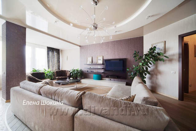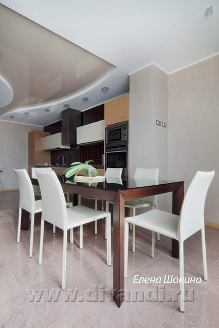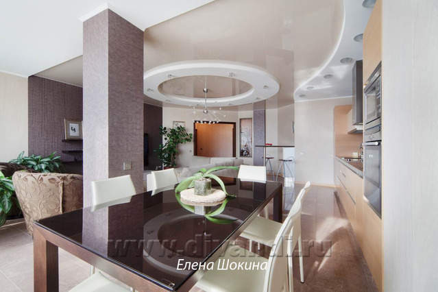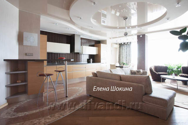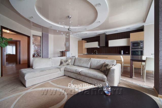 Ядро композиции составляет единое пространство кухни-гостиной, границы которого были раздвинуты за счет включения лоджии в жилую зону. Глянцевый натяжной потолок визуально увеличивает объем помещения. Эту же функцию выполняют разнообразные источники света. Рисунок потолка структурирует пространство, в частности, двойное кольцо с подвесным светильником акцентирует внимание на центральном элементе гостиной - большом уютном диване.