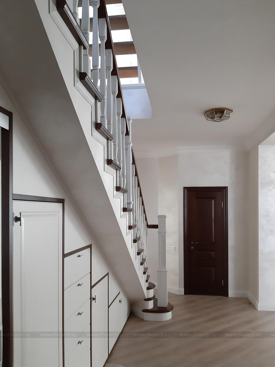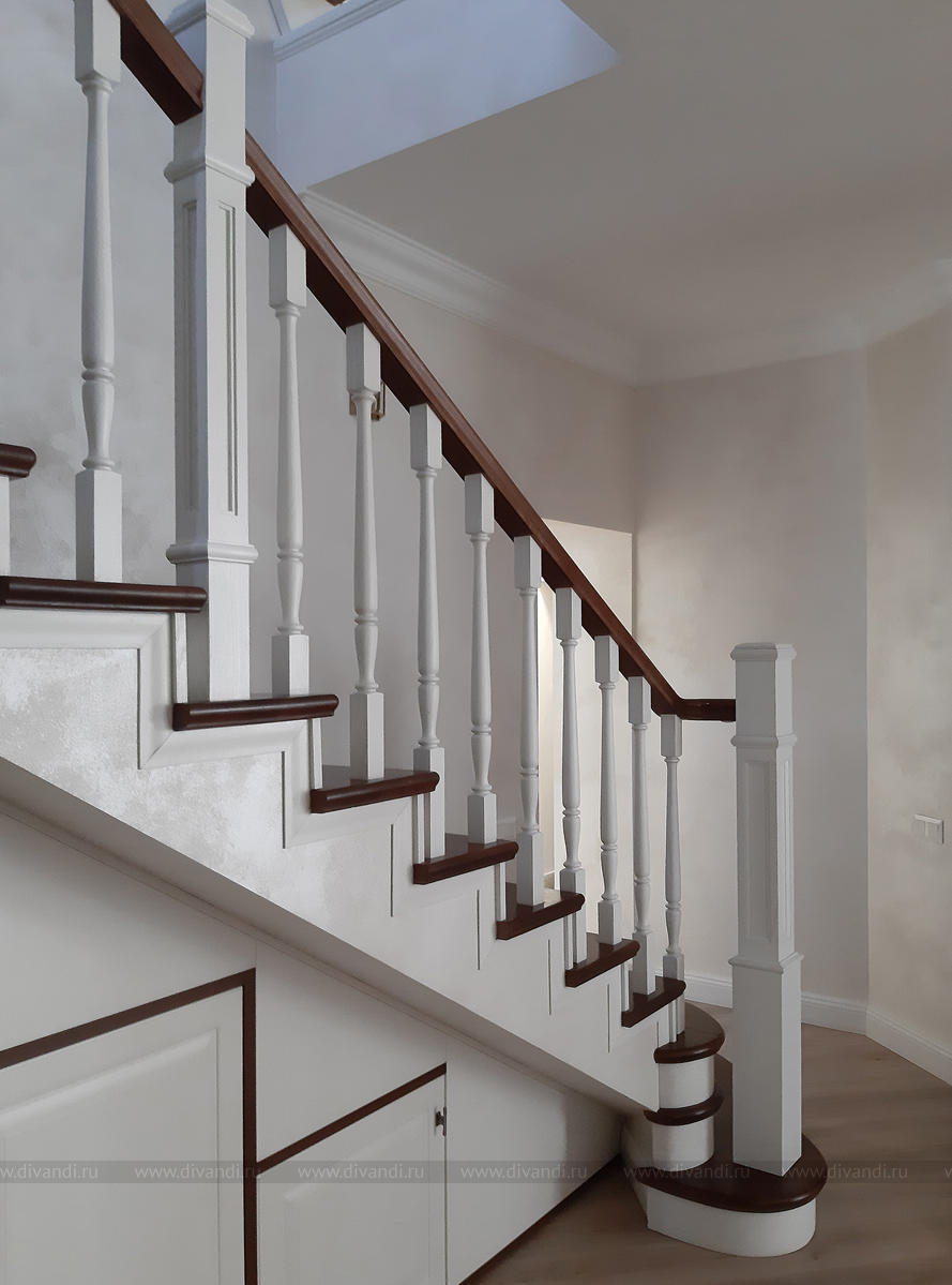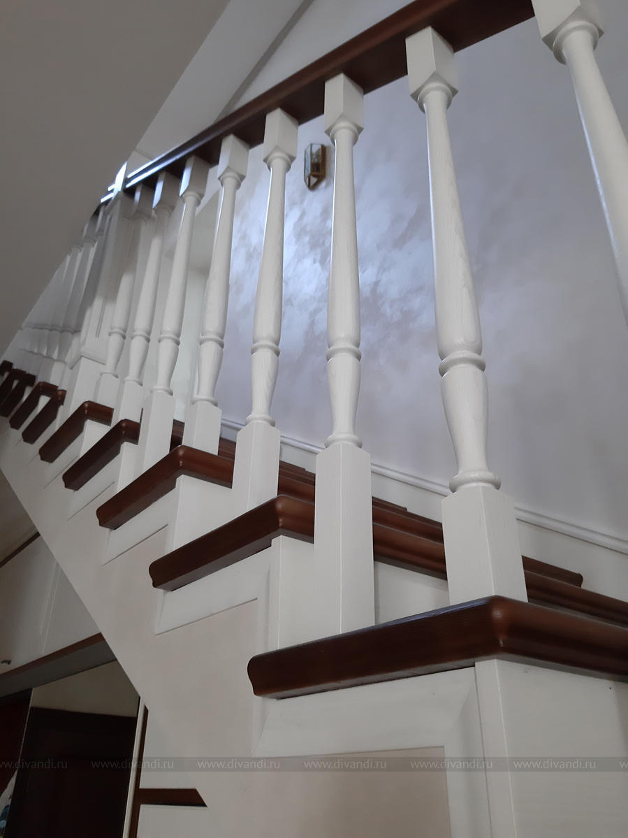 Лестница из проекта в стиле хюгге. Полностью завершенный вид. Массив ясеня под лаком в двух цветах.