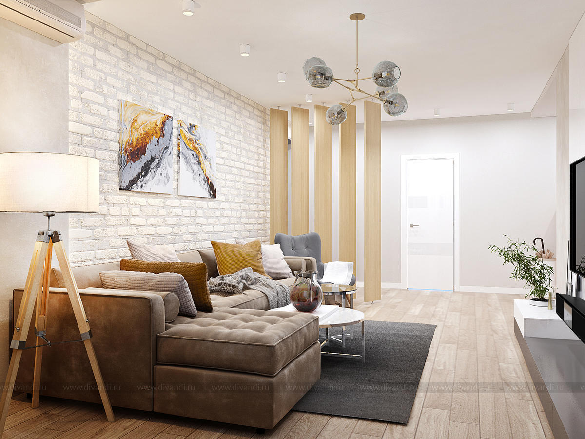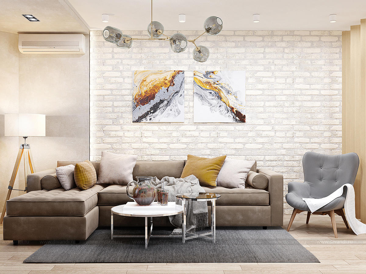 Современный жилой интерьер является актуальным концептом нашей сегодняшней жизни. В интерьерном решении преобладают светлые пастельные и успокаивающие, располагающие к отдыху, неброские тона в сочетании с яркими и сочными акцентами. Сочетание однородных крупных элементов уравновешиваются насыщенными деталями: текстурой кирпича, геометричными узорами, стеклянными люстрами, красочными картинами.
