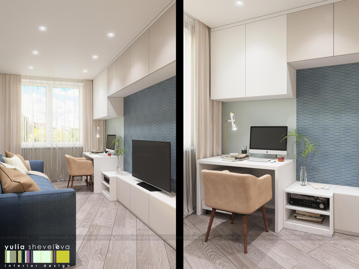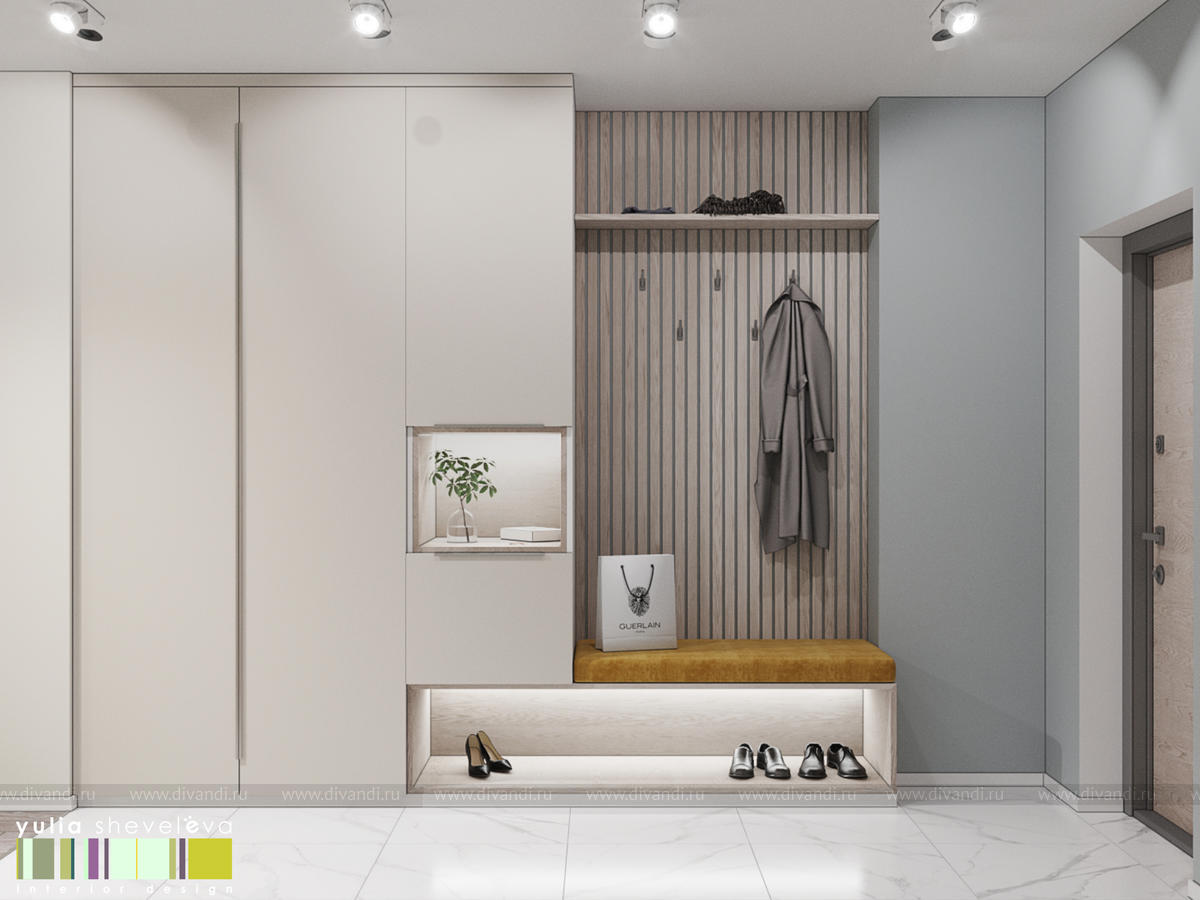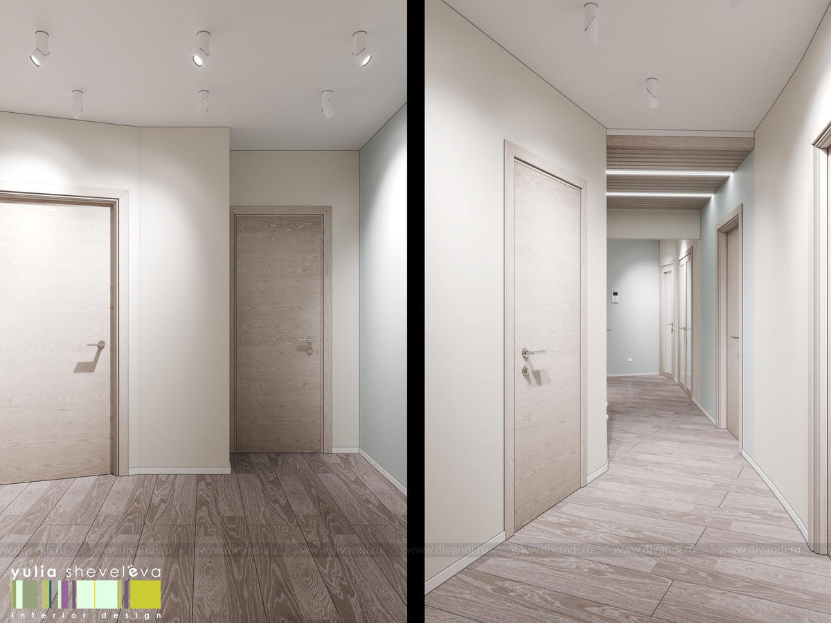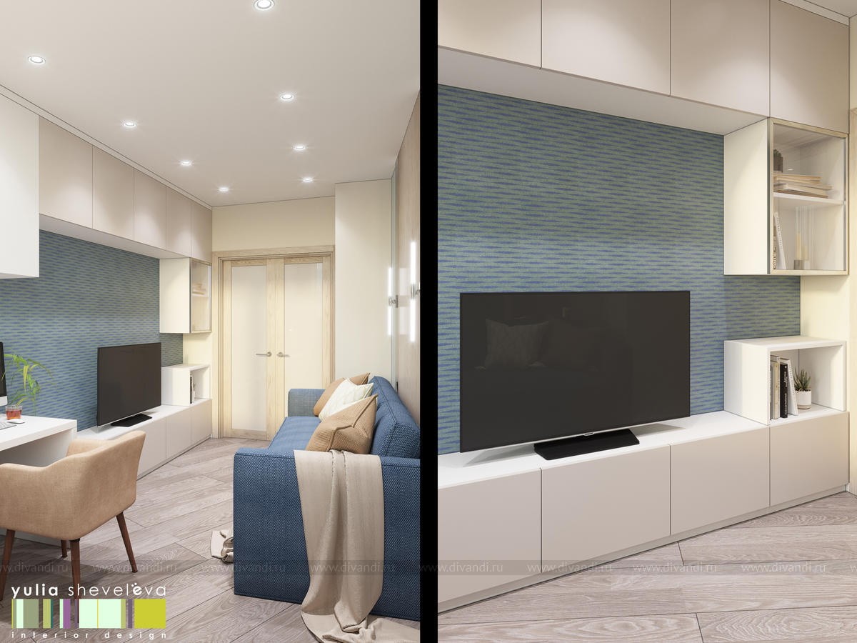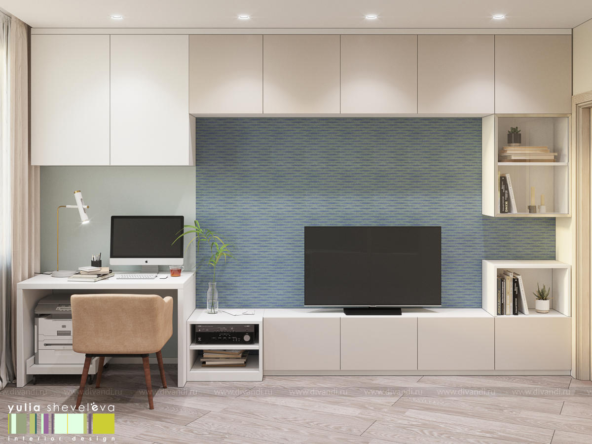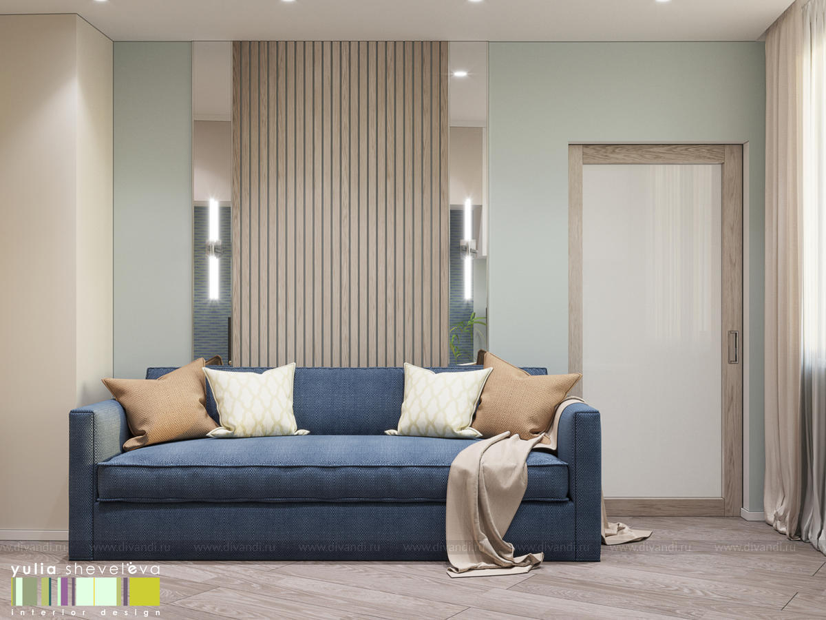 Стиль для интерьера выбрали современный, в воздушной цветовой гамме с небольшими акцентами. В интерьере преобладают преимущественно холодная цветовая палитра, в качестве дополнения - теплые тона дерева в мебели, рейках, цвете пола