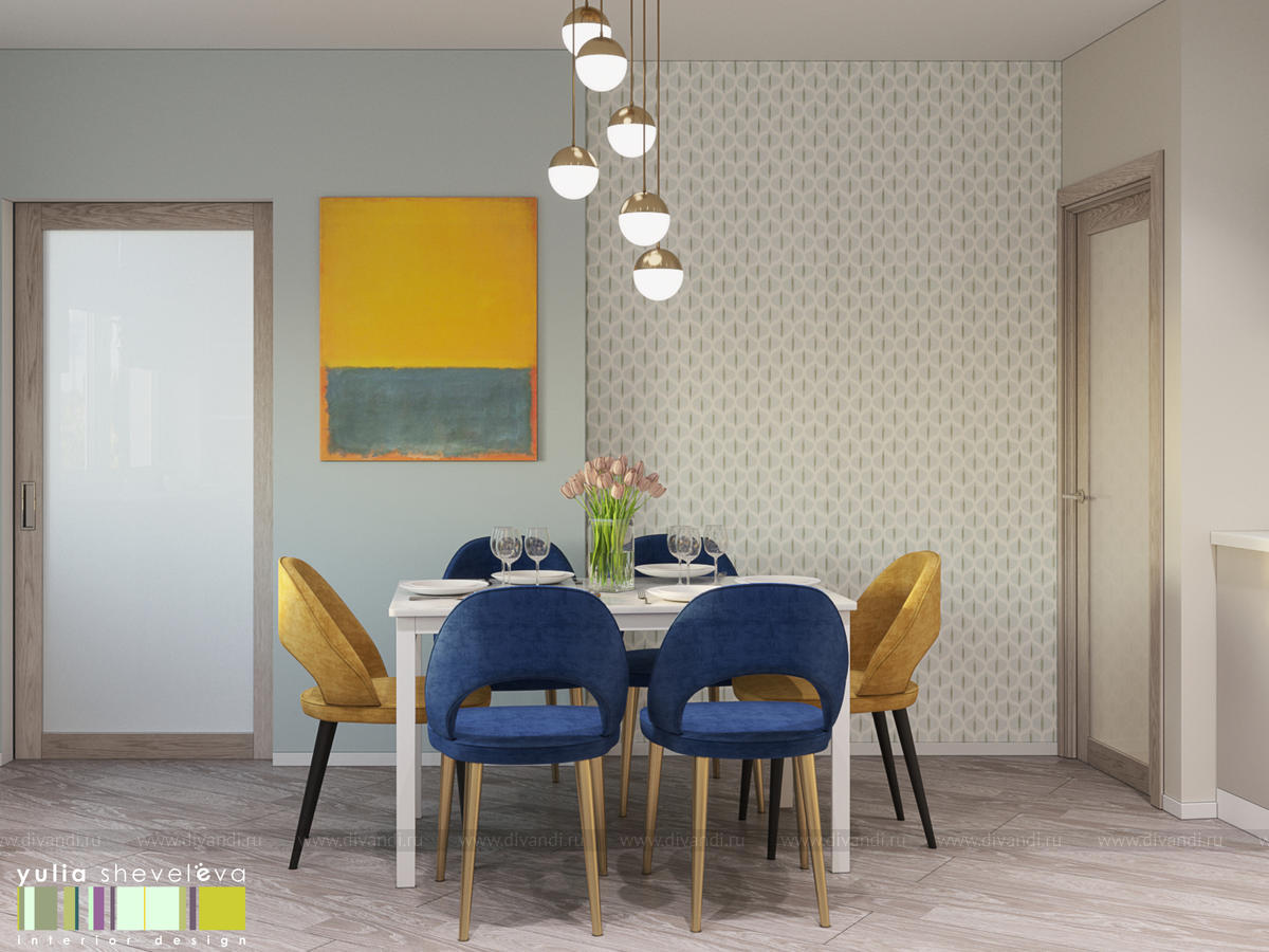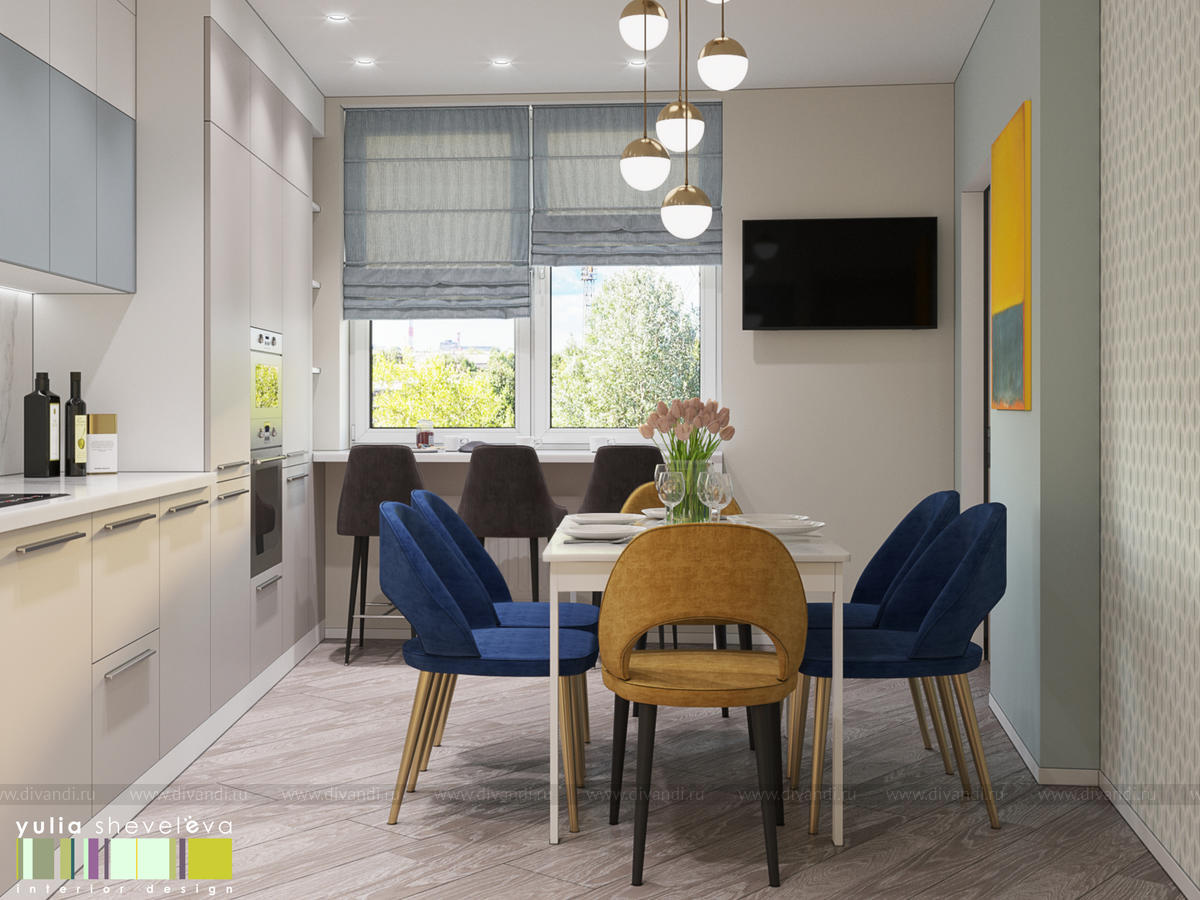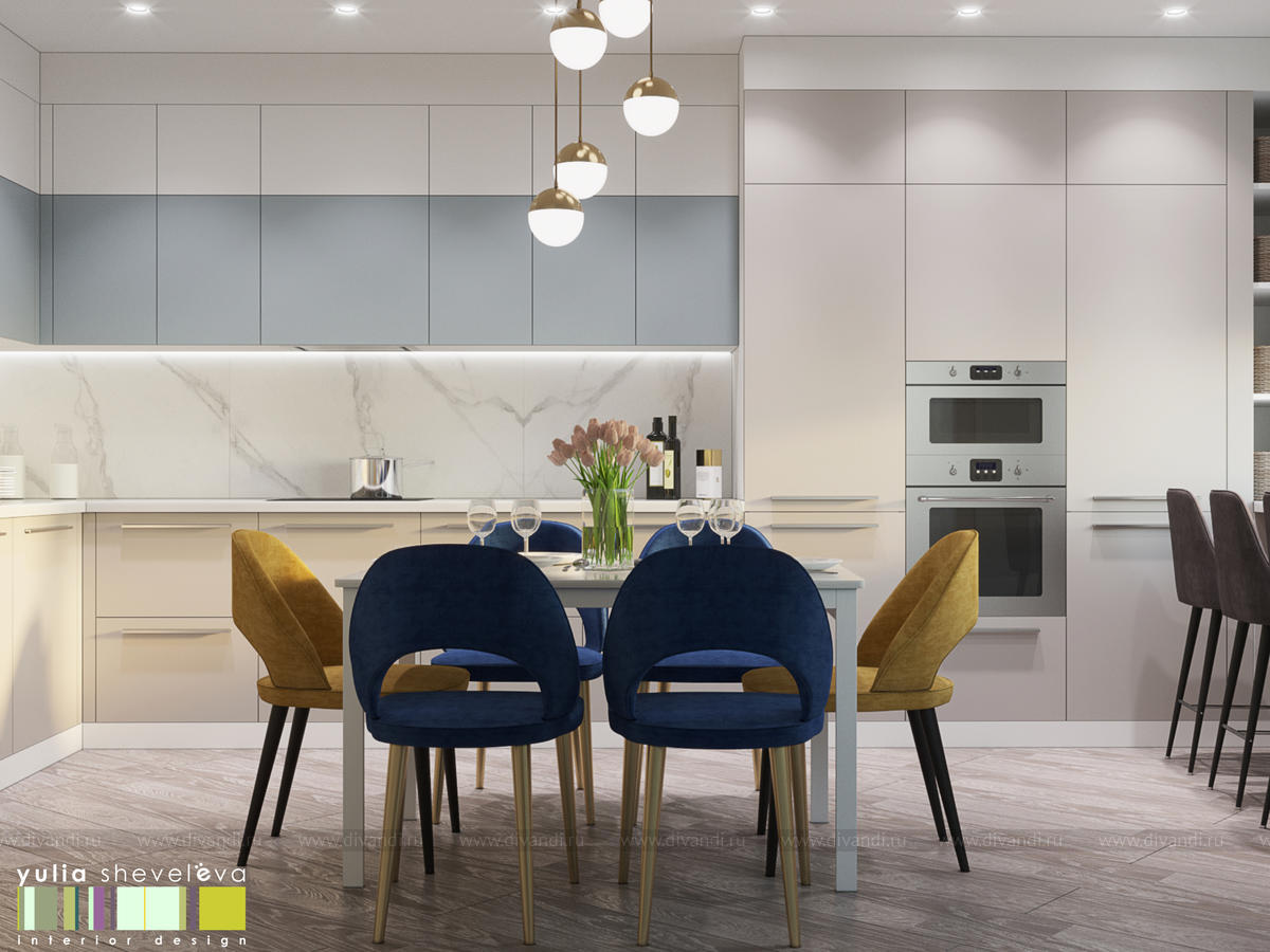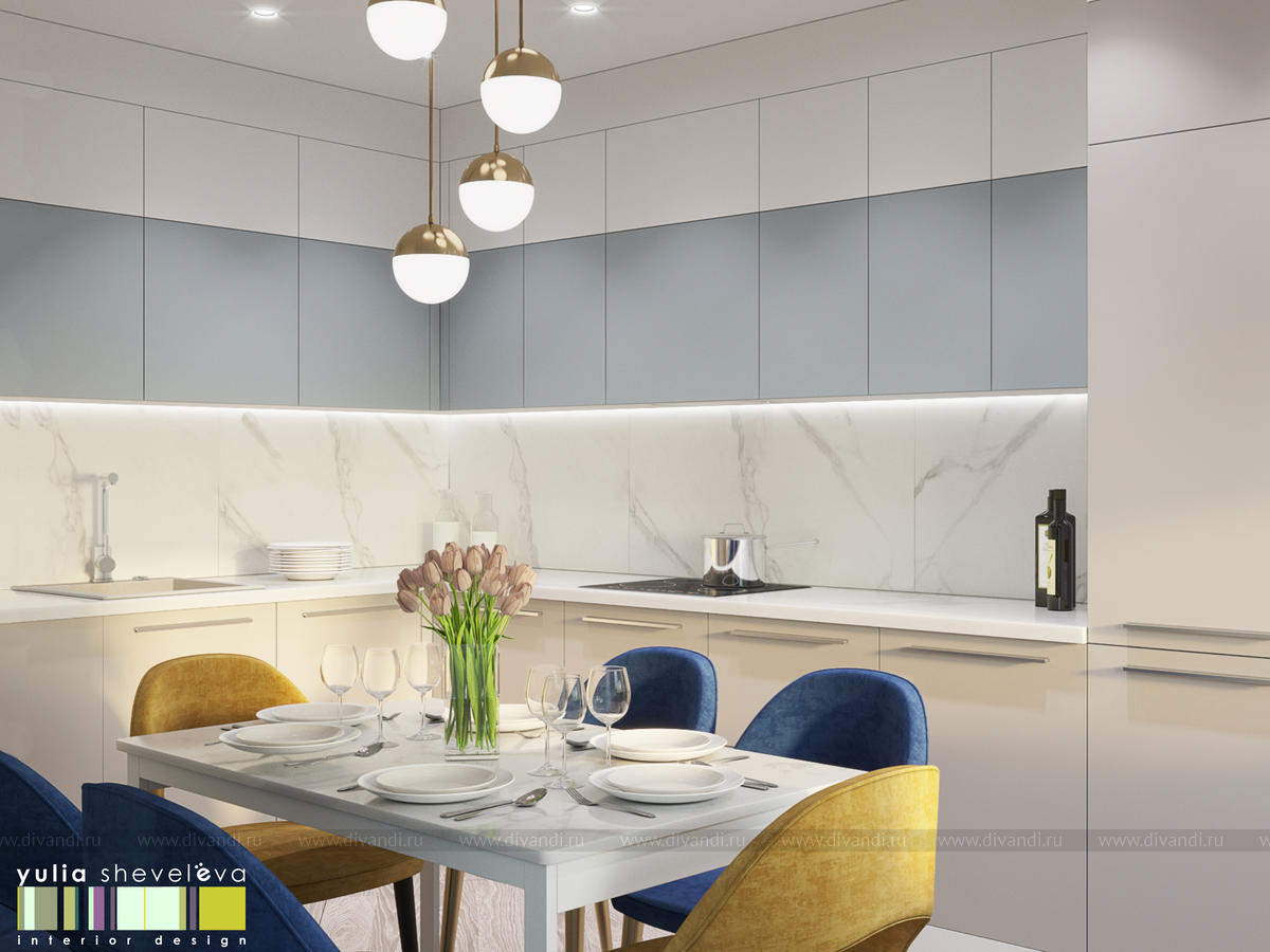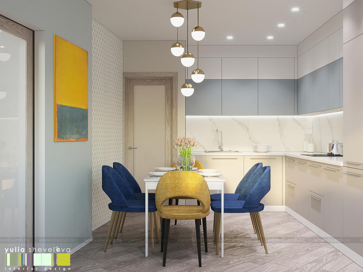 Стиль для интерьера выбрали современный, в воздушной цветовой гамме с небольшими акцентами. В интерьере преобладают преимущественно холодная цветовая палитра, в качестве дополнения - теплые тона дерева в мебели, рейках, цвете пола