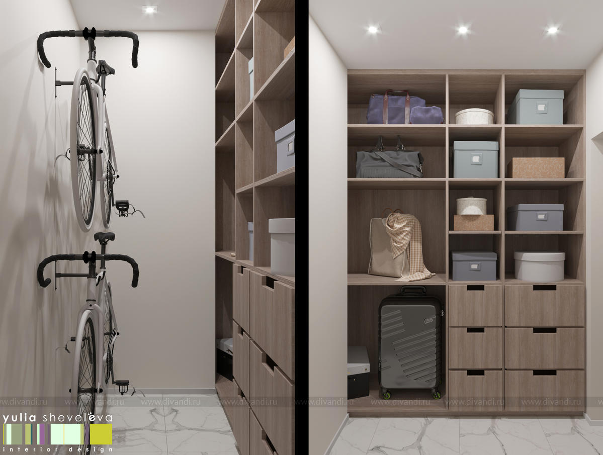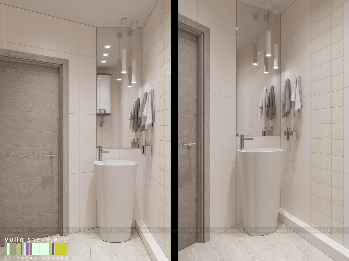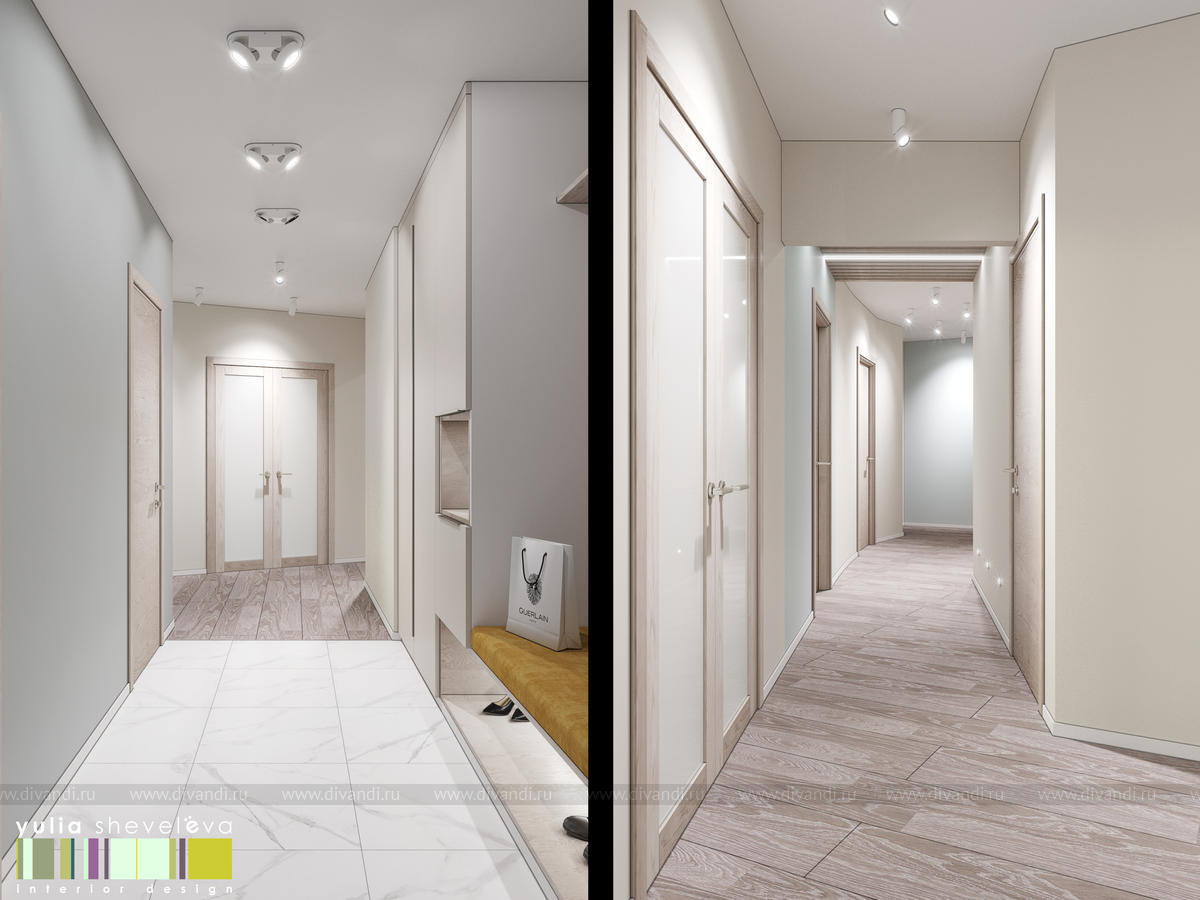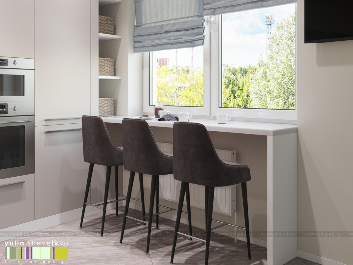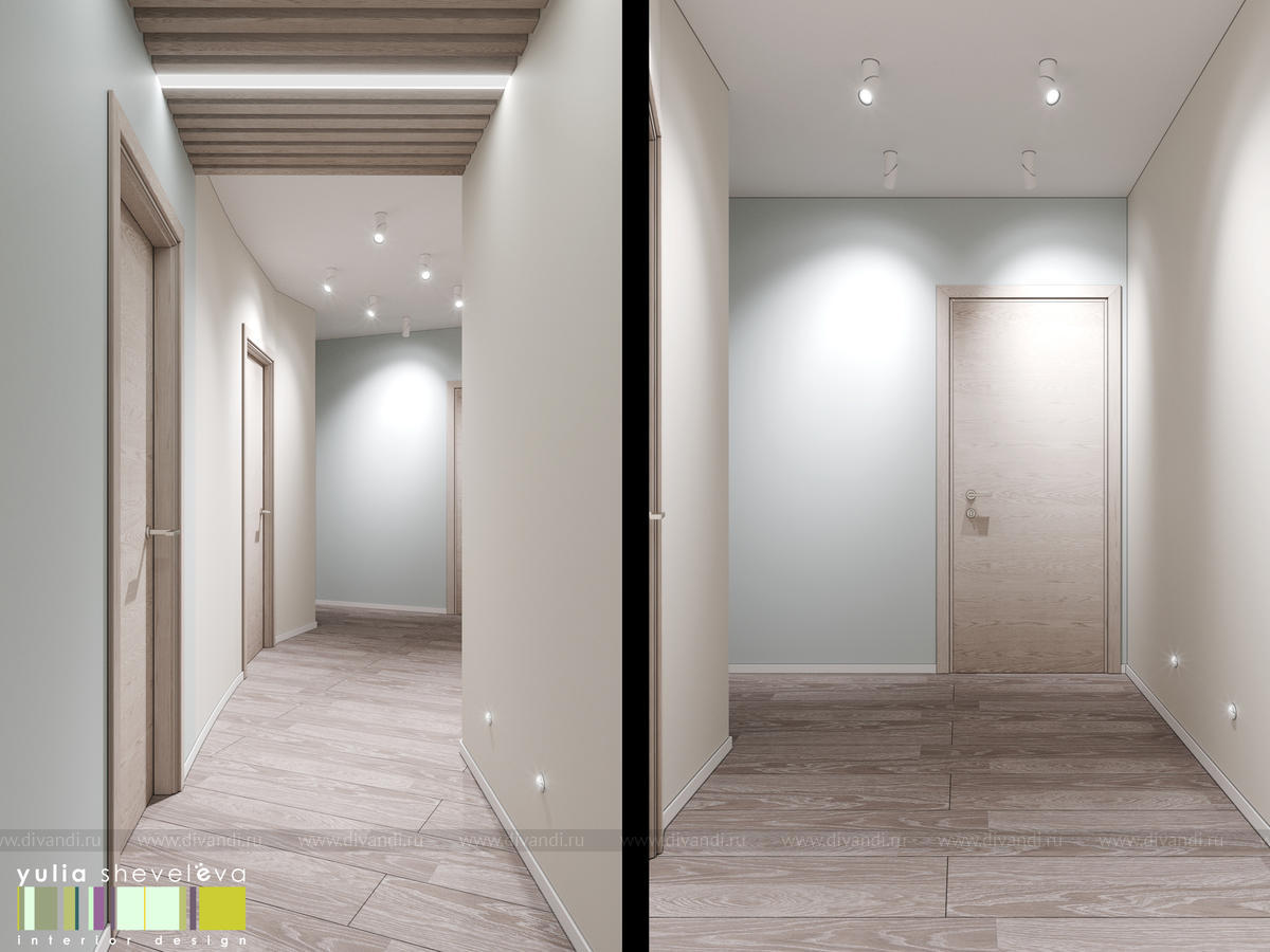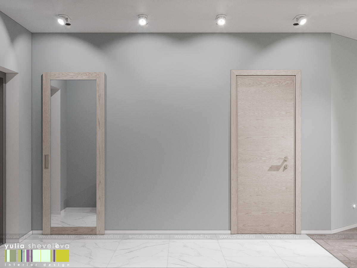Стиль для интерьера выбрали современный, в воздушной цветовой гамме с небольшими акцентами. В интерьере преобладают преимущественно холодная цветовая палитра, в качестве дополнения - теплые тона дерева в мебели, рейках, цвете пола