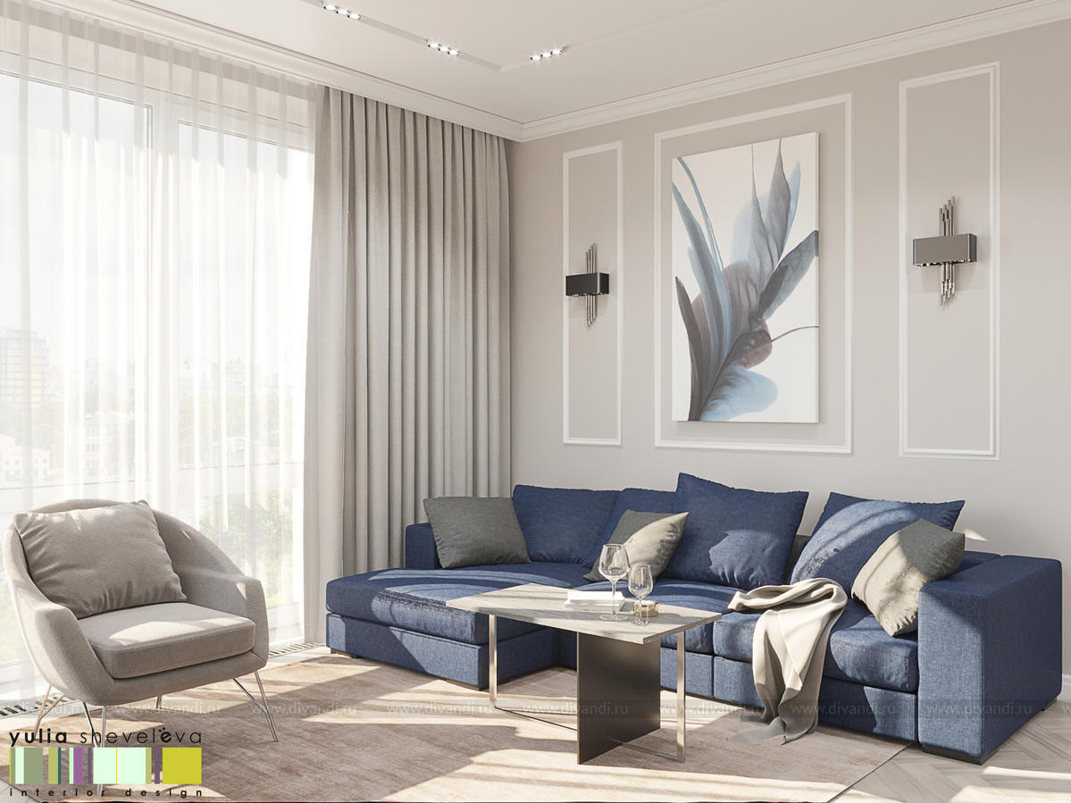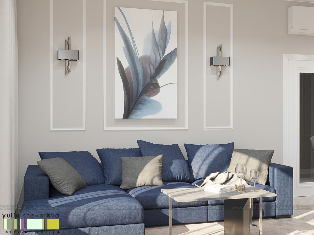 Стилистика данного интерьера - уютная современная классика. Благодаря тому, что квартира выходит на солнечную сторону и в планировке предусмотрены панорамные окна, интерьер наполнен светом, теплом и уютом. Светлые теплые тона дополнены акцентами глубокого синего и голубого оттенка.