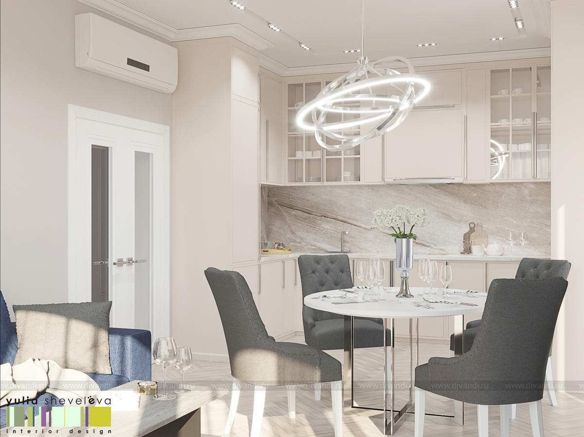 Открывая двойные распашные двери, которые создают ощущение легкости и пропускают свет, мы попадаем в уютное пространство объединяющее гостиную и кухню. Интерьер выполнен в теплой цветовой гамме. Окрашенные стены декорированы белоснежными молдингами, а на полу паркетная доска. Главное место в зоне гостиной занимает современный и удобный модульный диван, насыщенного синего оттенка. Стильный журнальный столик, кресло с металлическими ножками у окна, красивая консоль под телевизор. Все это создает комфортное место, где хочется собираться всей семьей и принимать гостей. В зоне кухни-столовой в каждой детали переплетается классический и современный стиль. Здесь соединились фасады с филенками, фартук из мрамора, современная бытовая техника, уютные стулья, стильный стол, над которым современная люстра от Eichholtz. Все эти детали придают интерьеру неповторимый стиль и характер.