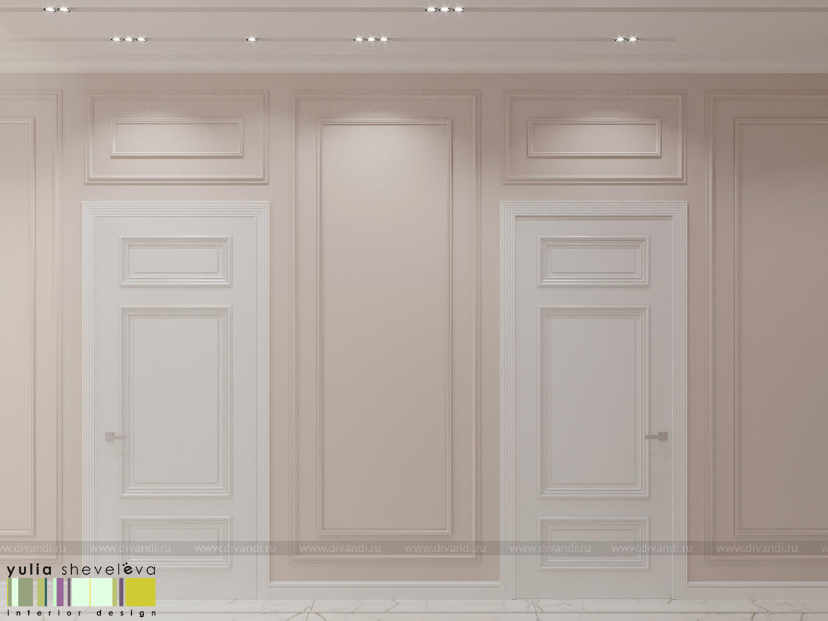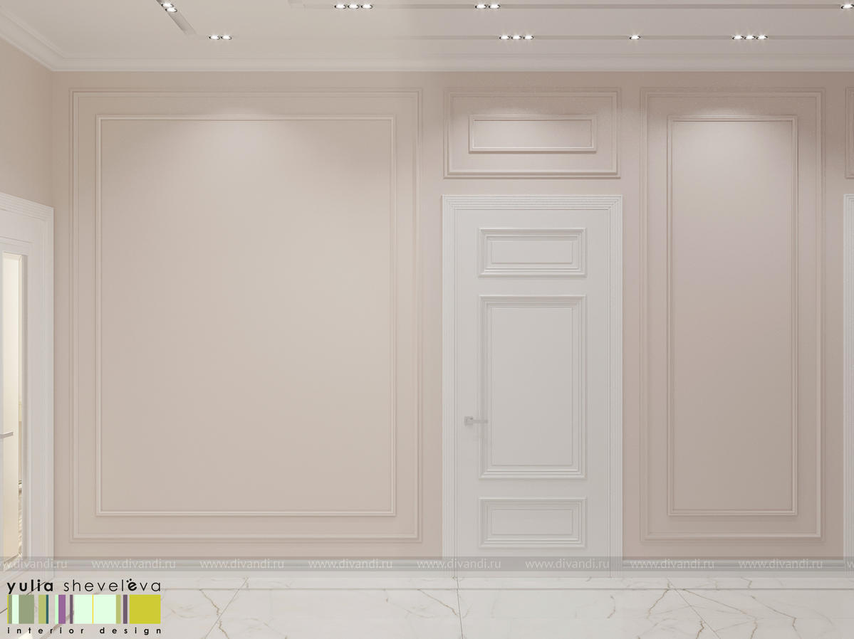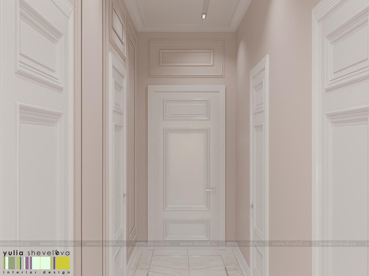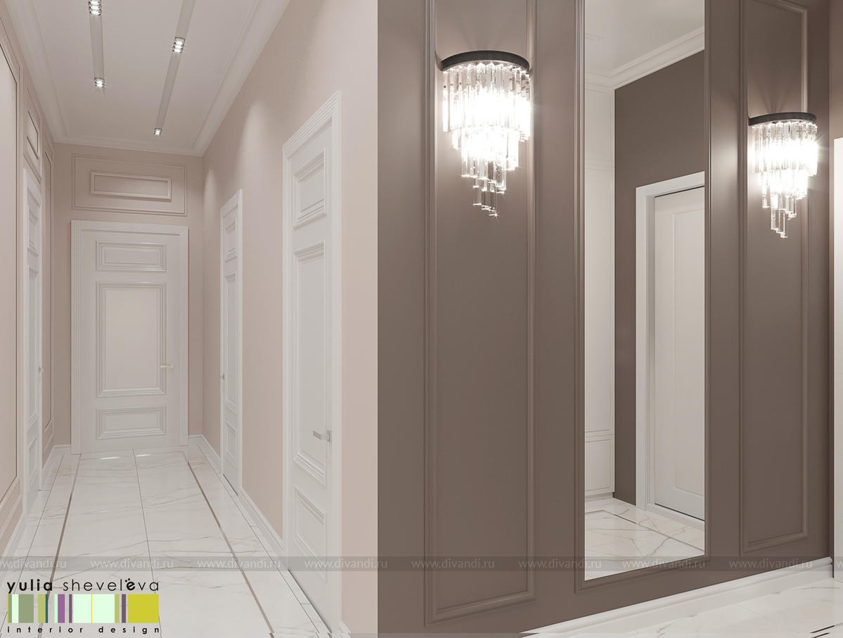 Холл продолжает общую стилистику интерьера. Спокойные оттенки шоколада и белый - основные цвета данного помещения. на полу плитка под мрамор. Высокое зеркало в рамочке из молдинга визуально расширяет небольшое пространство при входе в квартиру. По бокам от него шикарные классические бра, а на потолке встраиваемая трековая система освещения. межкомнатные двери выполнены в белом цвете с фигурной обналичкой.