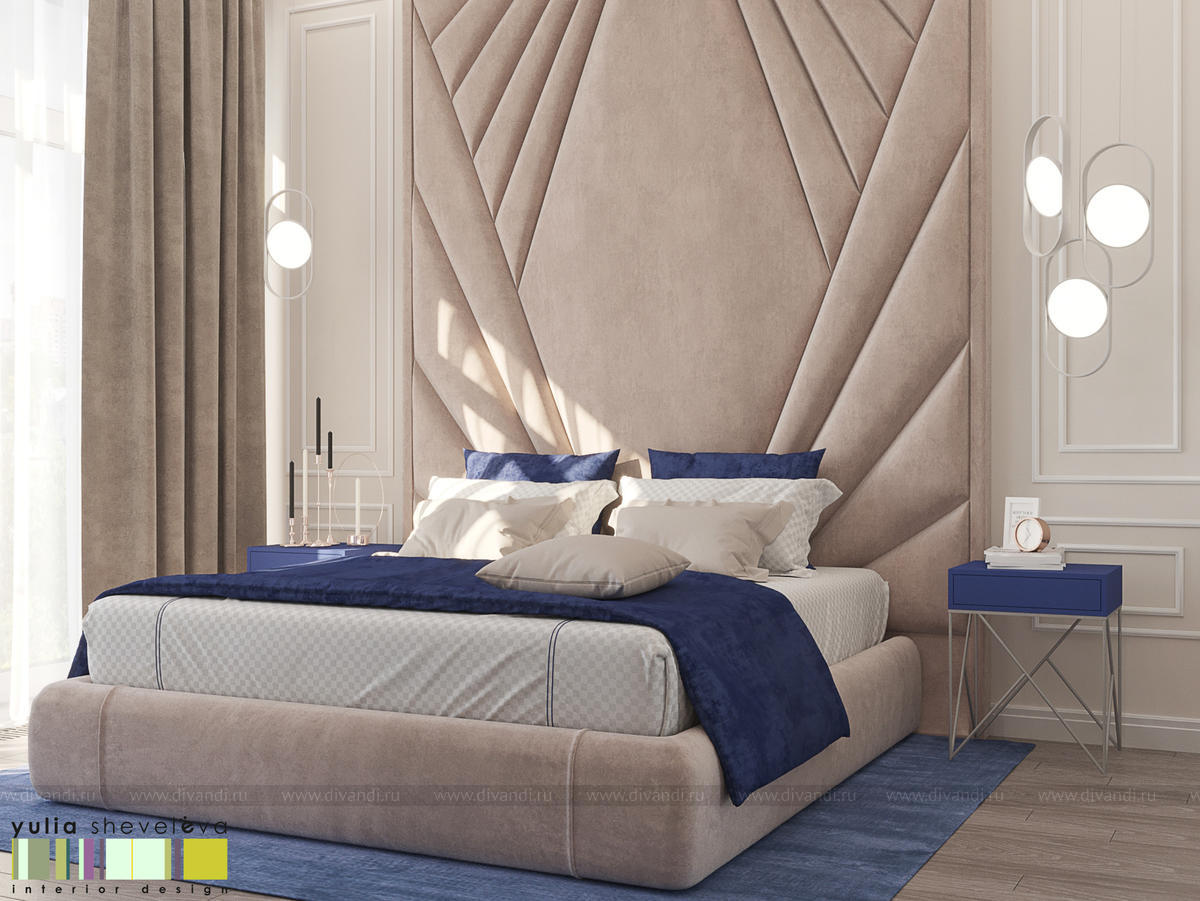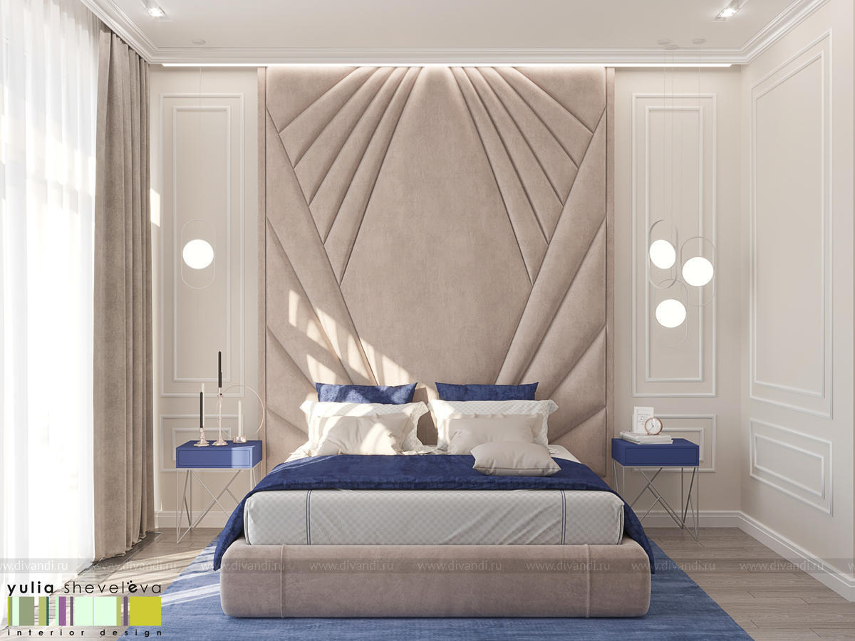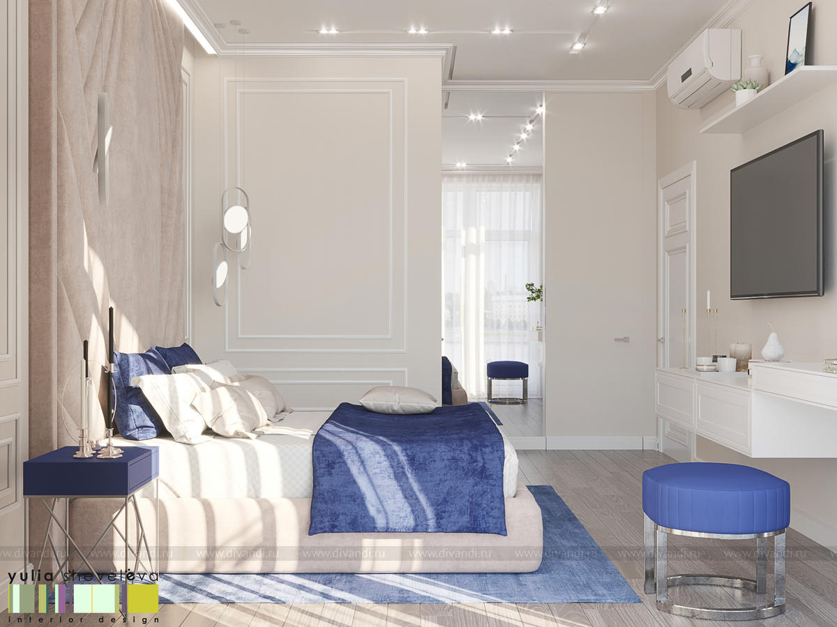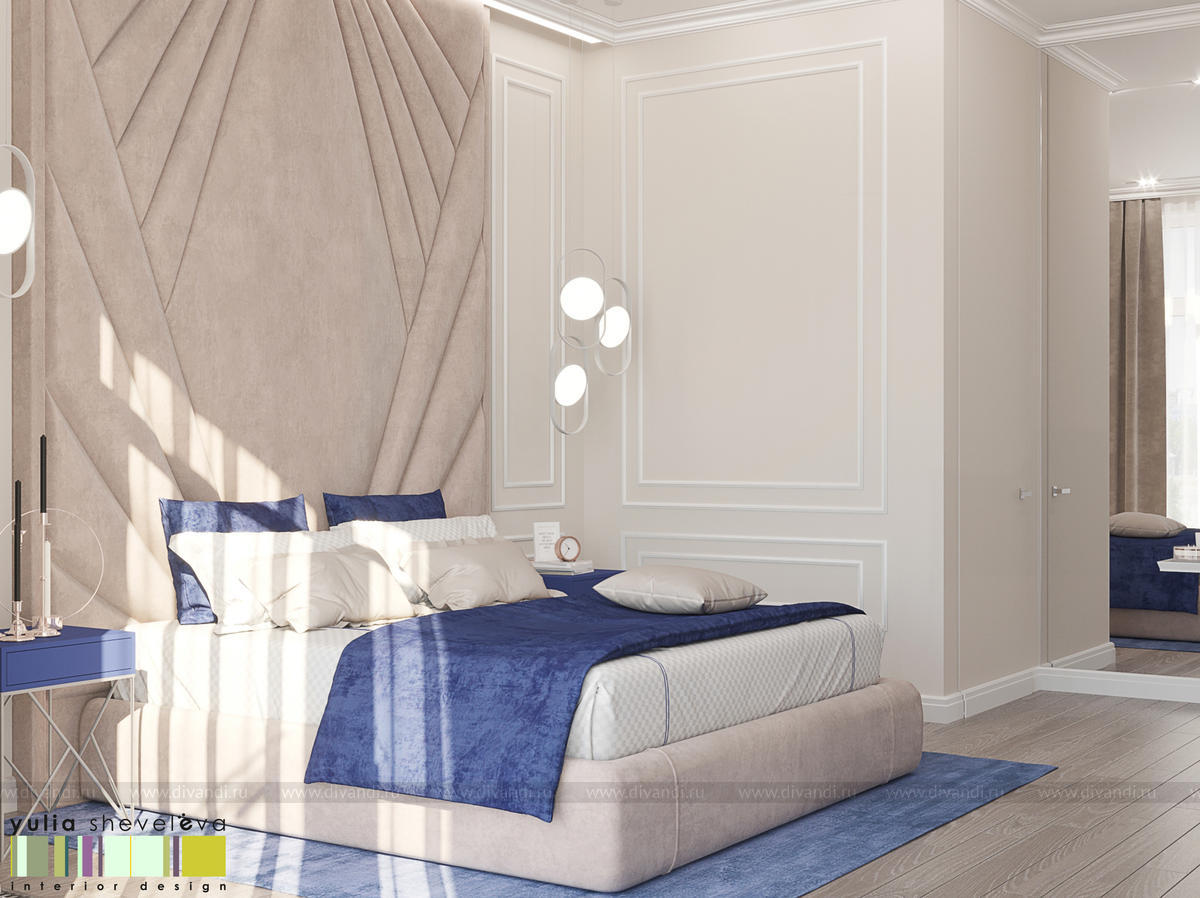 Спальня получилась очень нежной и воздушной. Высокое мягкое изголовье и основание кровати, а также текстиль, наполняют спальню теплом и уютом. В качестве ярких акцентов в интерьере использован синий оттенок. Стильные консоли, прикроватные столики, яркий пуф, современные светильники, зеркала. Каждая эта деталь собирается в единый пазл идеального интерьера. В спальне, за дверями со скрытой коробкой, располагаются отдельная гардеробная и ванная комната.