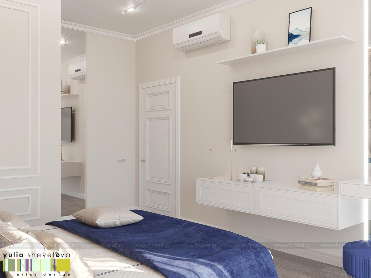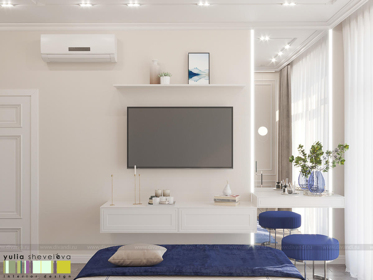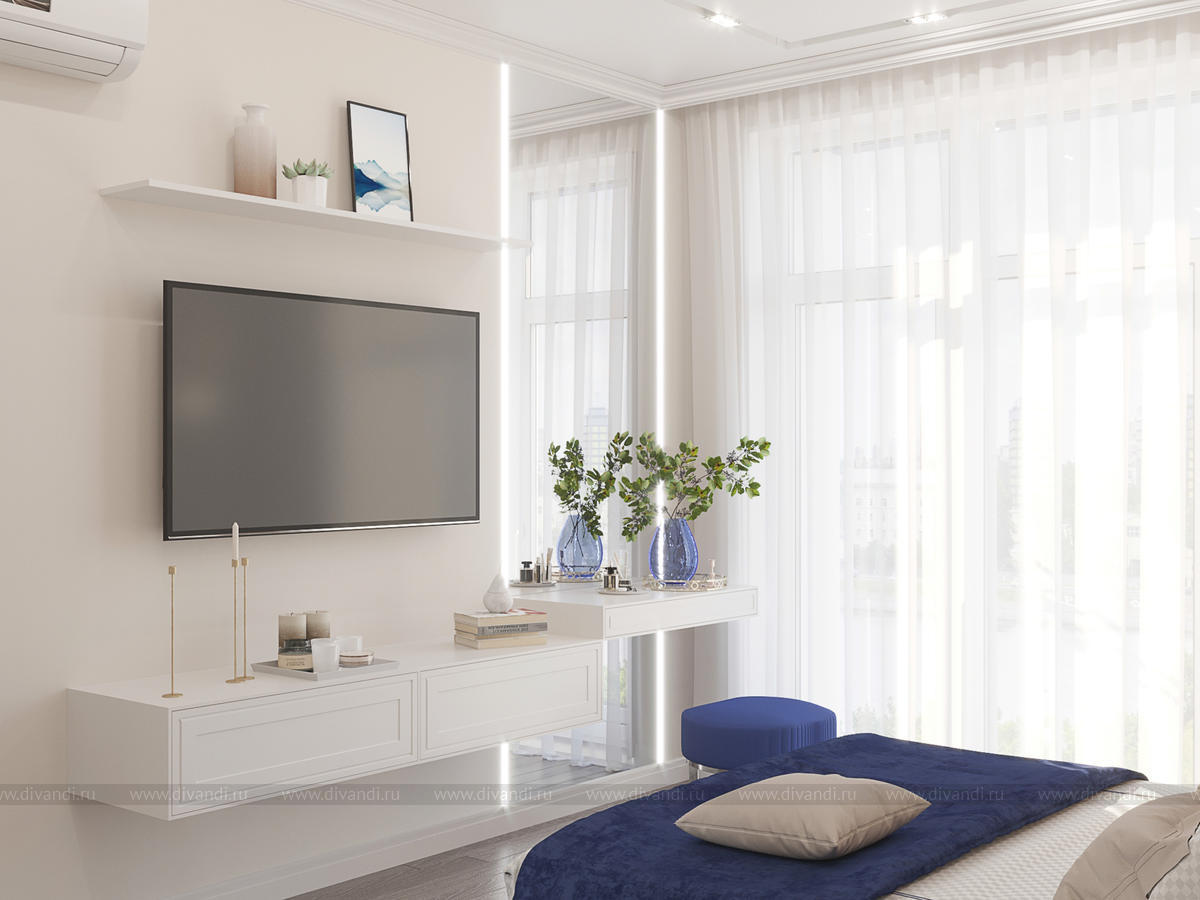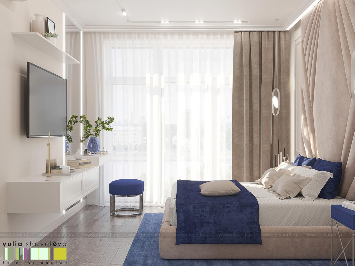 Спальня получилась очень нежной и воздушной. Высокое мягкое изголовье и основание кровати, а также текстиль, наполняют спальню теплом и уютом. В качестве ярких акцентов в интерьере использован синий оттенок. Стильные консоли, прикроватные столики, яркий пуф, современные светильники, зеркала. Каждая эта деталь собирается в единый пазл идеального интерьера. В спальне, за дверями со скрытой коробкой, располагаются отдельная гардеробная и ванная комната.