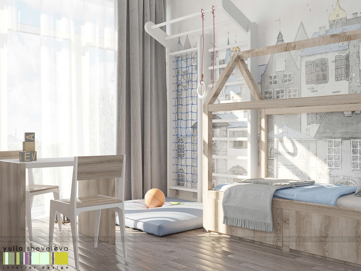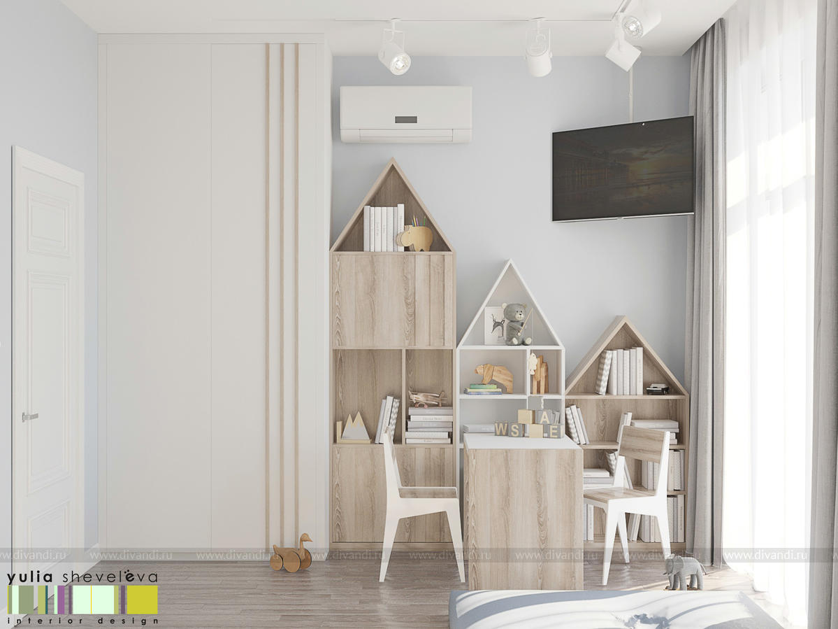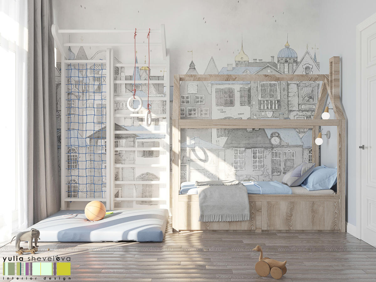 В детской для малыша создана настоящая сказка. Интерьер проработан до мелочей. В комнате есть зона для сна и отдыха, зона для спорта и игр, рабочая зона и системы хранения. Главным акцентом в интерьере детской стали авторские обои ANDERSEN. Эти обои перенесут вас на страницы детских сказок. Кровать и шкафчики продолжают тему сказочных домиков в интерьере.