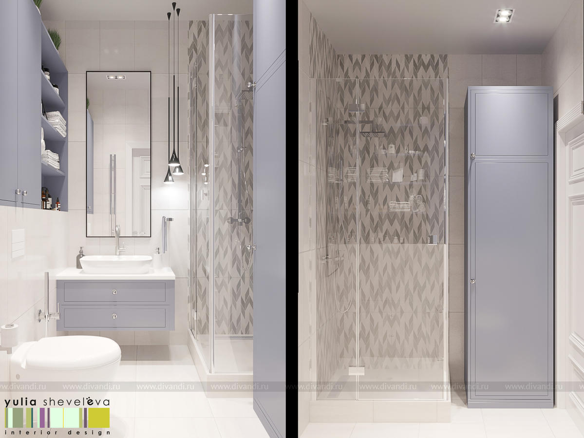 Ванные комнаты решены в нейтральной, с легкими акцентами. Одна выполнена в теплой гамме, а вторая более строгая, в серо-голубой. В обеих ванных комнатах предусмотрены системы хранения, а у зеркал размещены стильные подвесные светильники.