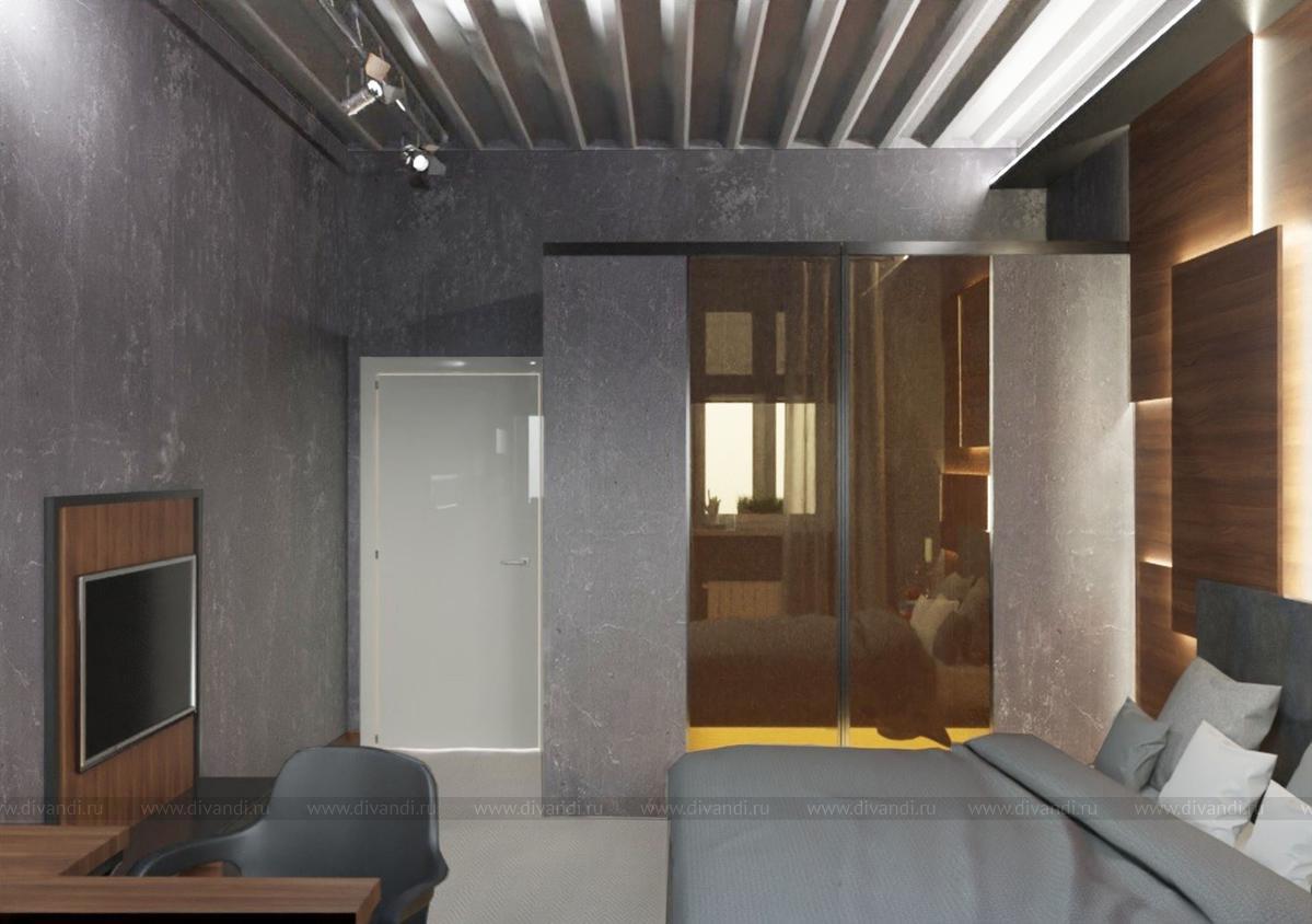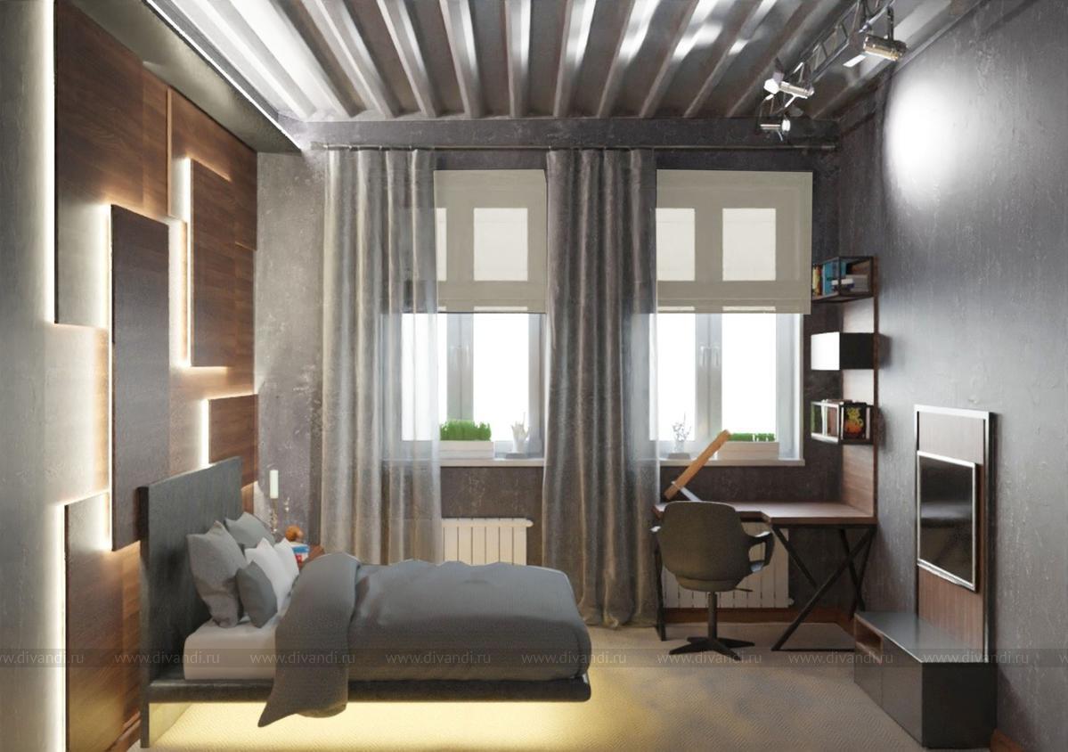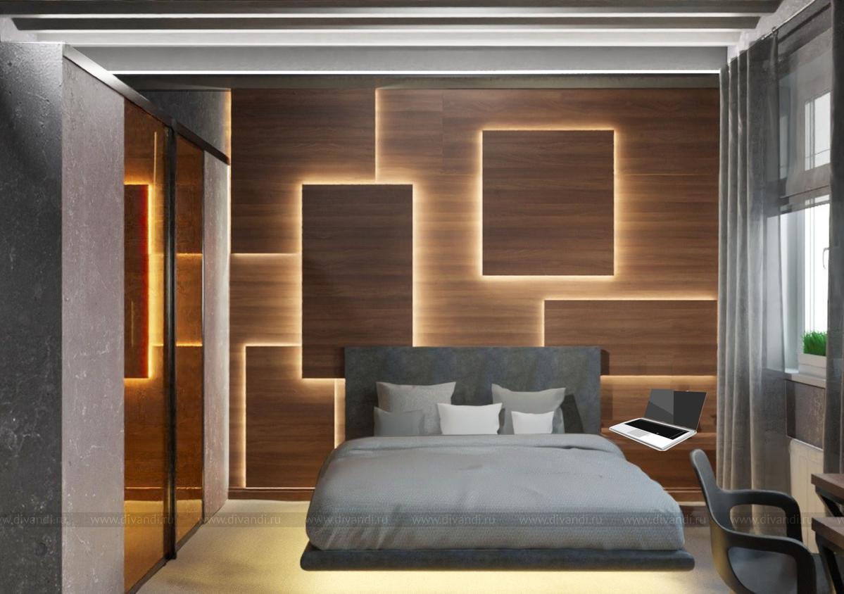 Молодой человек мечтал о мрачном сером оттенке, большой кровати и гардеробной со стеклянной дверью. Стена с изголовьем "подсмотрена" им же в оформлении ресторана. Так что: Мечты сбываются! Клиент доволен-это главное)