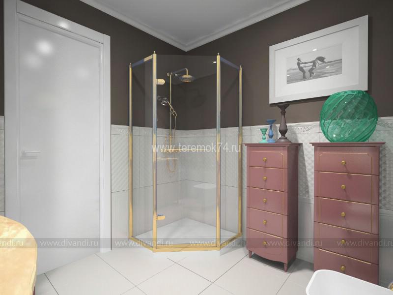 Санузел для этой большой квартиры выполнен в теплой контрастной гамме. Для этого нижний уровень стен облицевали новинкой от Kerama Marazzi из коллекции Лондон, верхний выкрасили в темный шоколадный цвет специальной водоустойчивой краской для ванных комнат. Мебель будет выполнена по разработанным эскизам в местной столярной, так как имеет индивидуальные размеры и окрас сложного кирпичного оттенка. Над инсталляцией удачно разместилась ниша для декоративных элементов, ее мы покрыли зеленым цветом с эффектом кракелюра, тем самым создав особую атмосферу уюта.