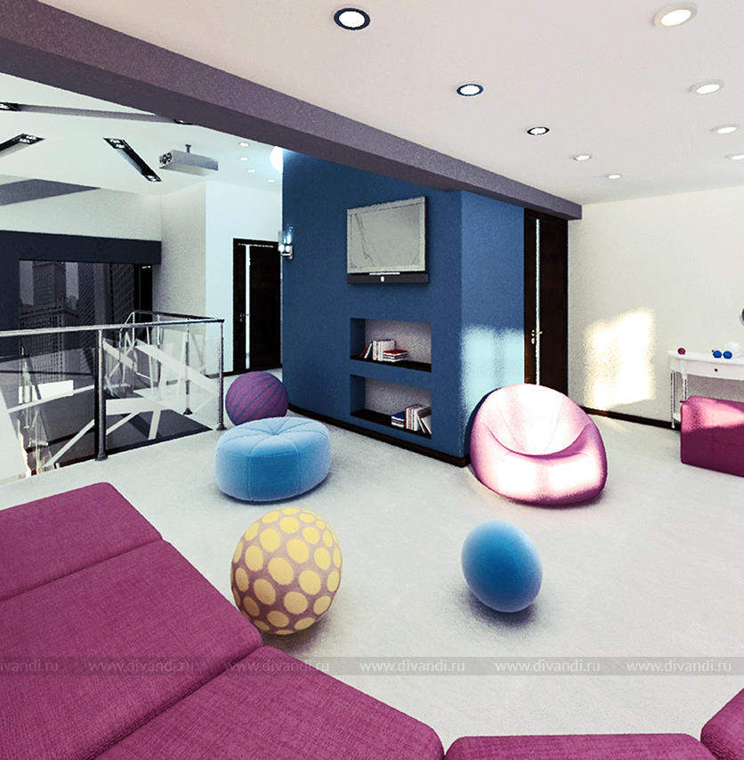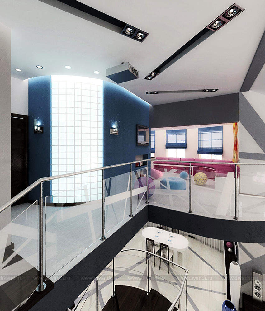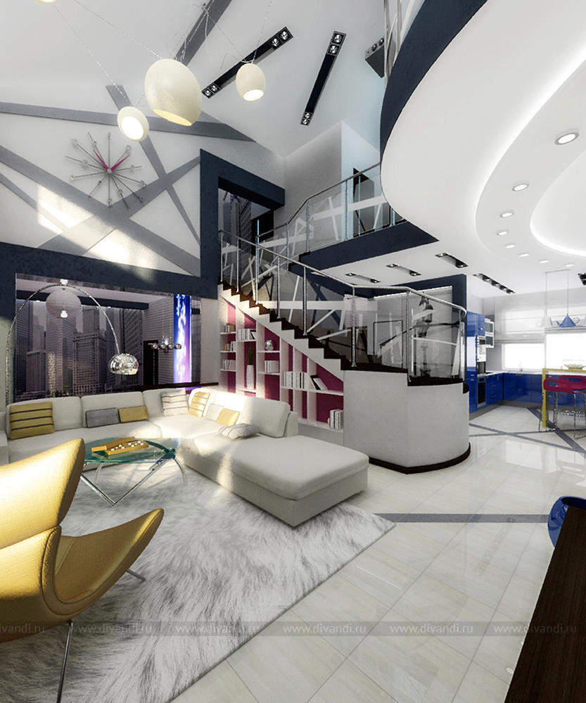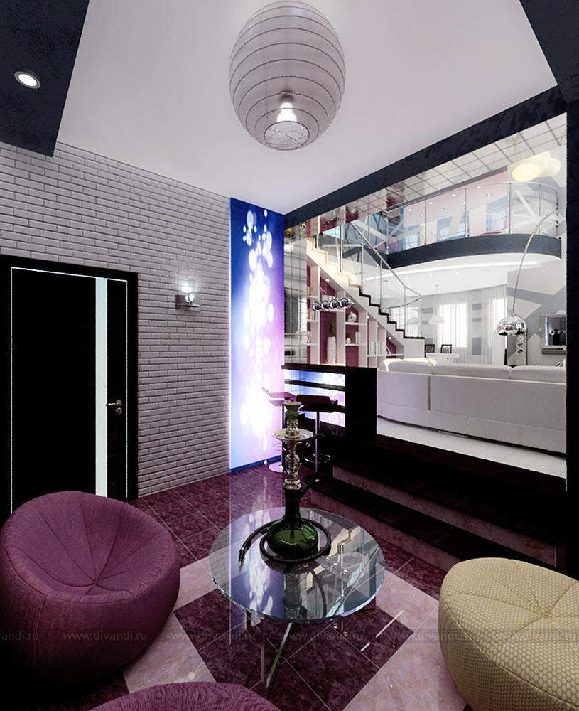Молодые люди решили оставить двухсветное пространство над зоной гостиной с камином и на стене предусмотреть большой экран , для просмотра фильмов. Смежно с гостиной располагается кальянная, отделенная барной стойкой.