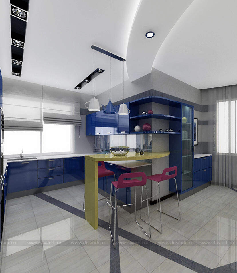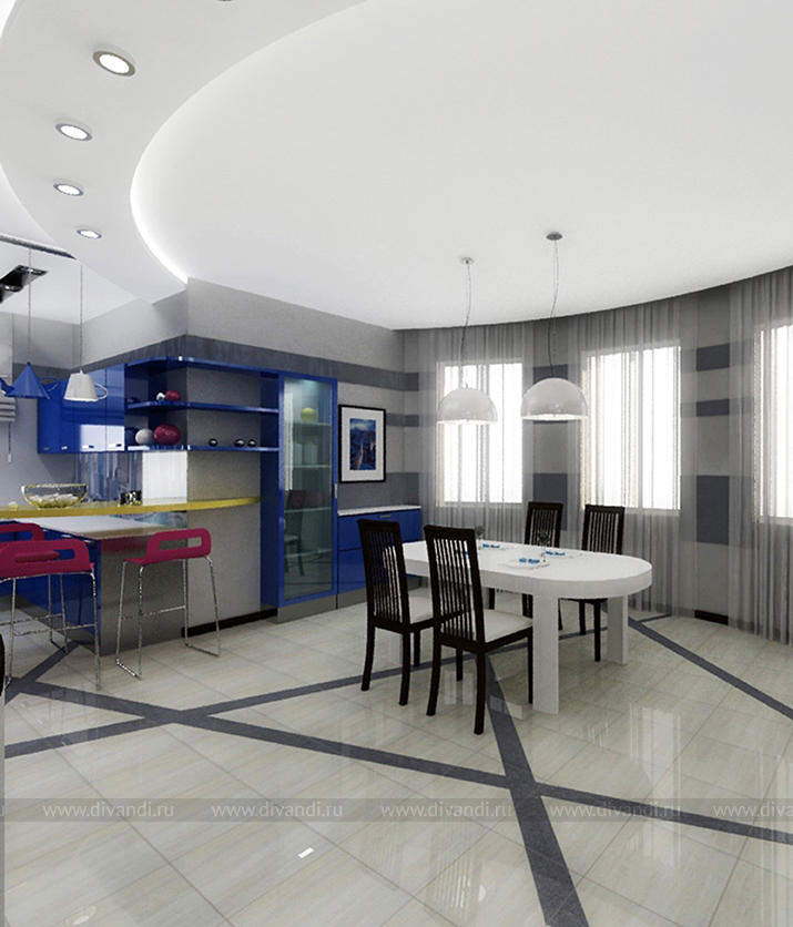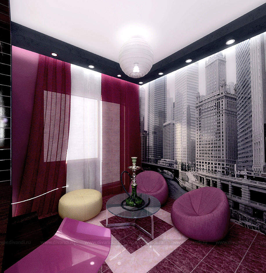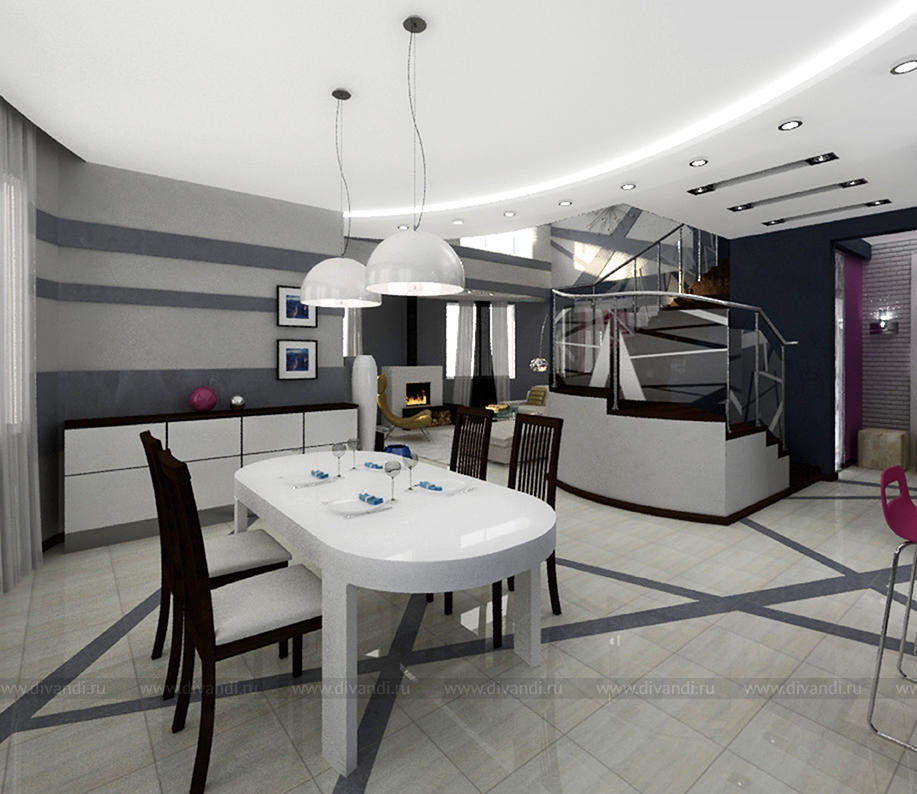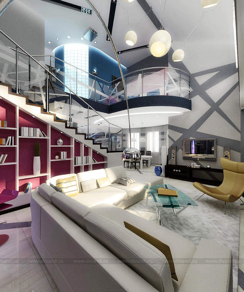 Молодые люди решили оставить двухсветное пространство над зоной гостиной с камином и на стене предусмотреть большой экран , для просмотра фильмов. Смежно с гостиной располагается кальянная, отделенная барной стойкой.