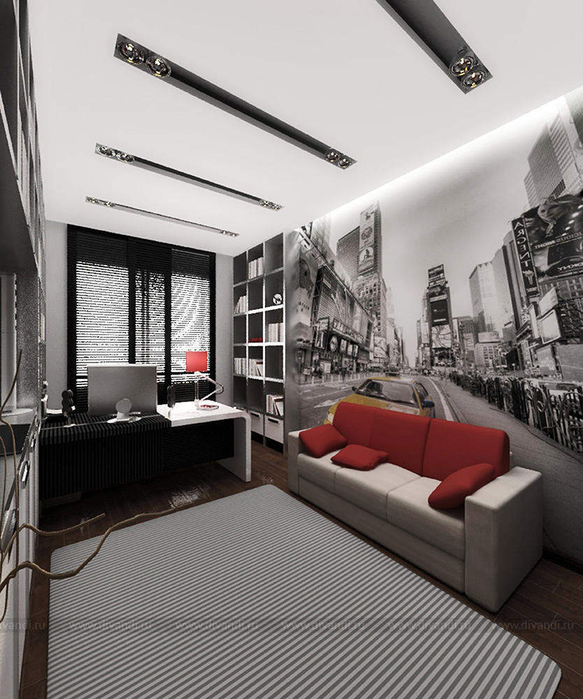 Стиль современный молодежный, много света и пространства. В отделке применены недорогие легкие отделочные материалы- керамогранит, декоративная штукатурка, 3Д панели, постеры, ковровое покрытие, стеклоблоки.