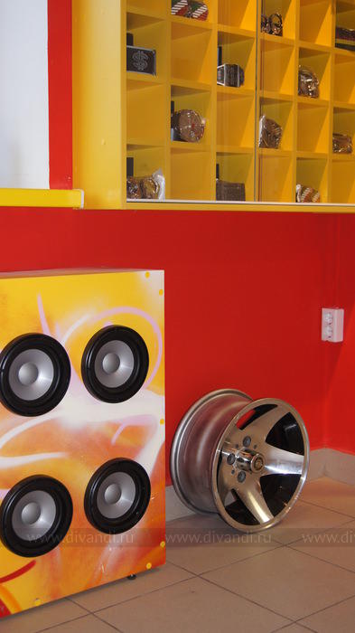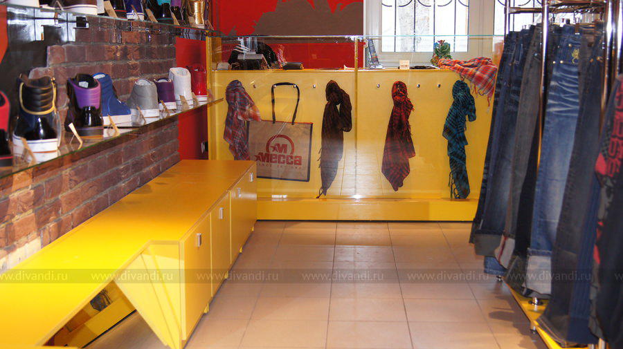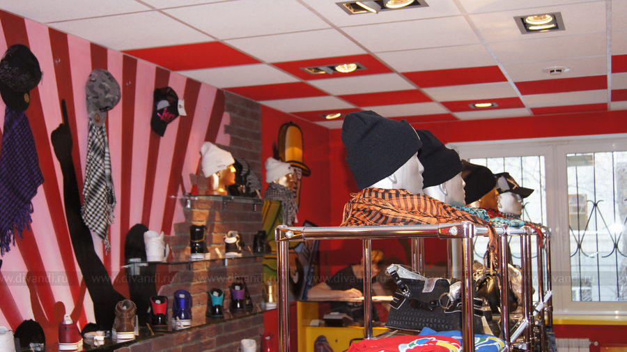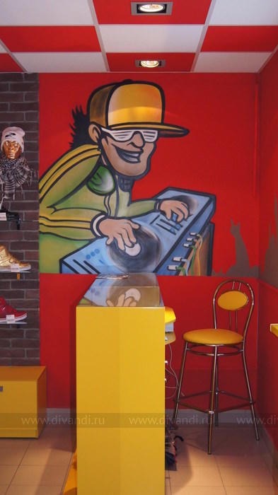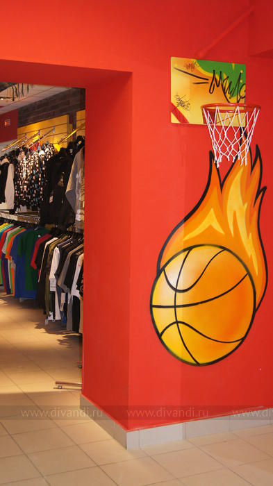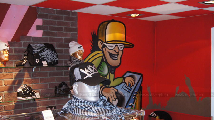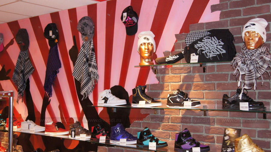 Сама одежда, которая продается в этом магазине, ориентирована на хип-хоп молодежь. В основном это американские бренды, поэтому дух соединенных штатов нашел свое отражение и в интерьере самого магазина - кирпич, граффити, яркие кислотные цвета. Был изготовлен авторский элемент декора - колонка возле кассовой зоны, которая также имеет и функциональное значение - аккустическое сопровождение шоппинга. Она выполнена из обычного разукрашенного дсп и автомобильных колонок.