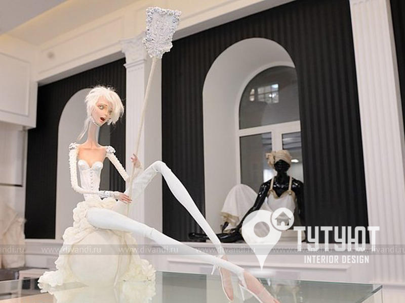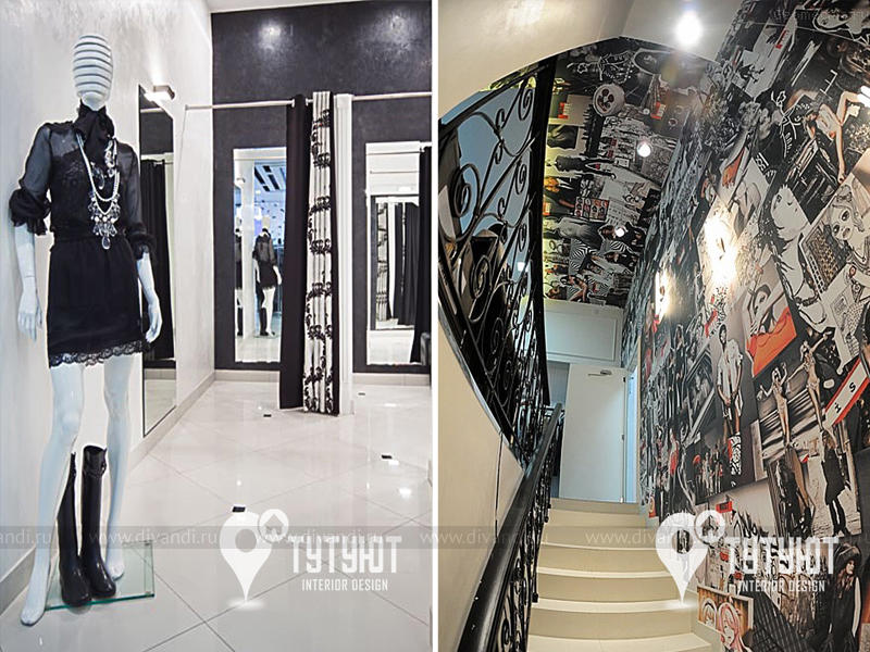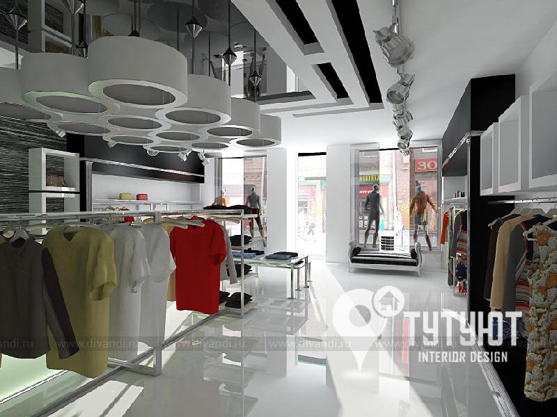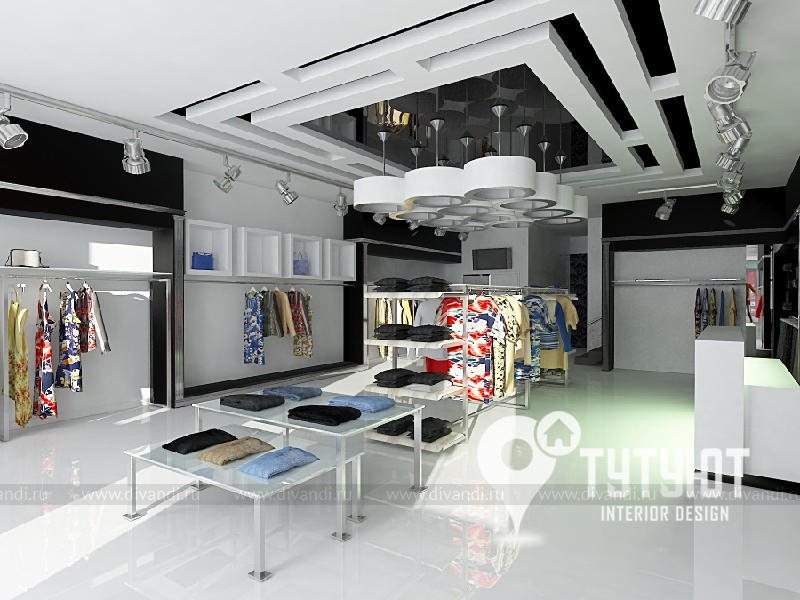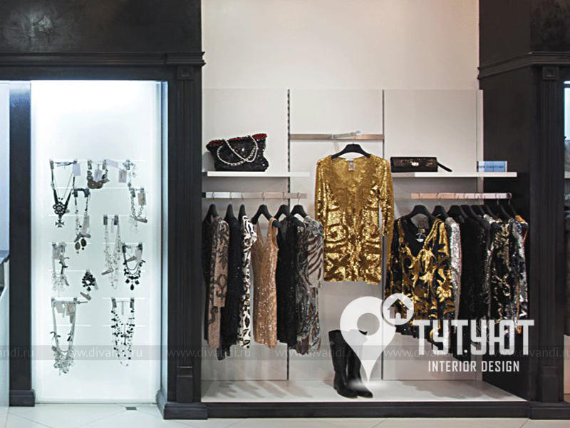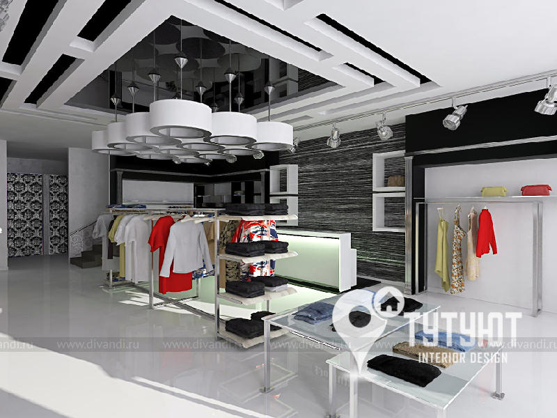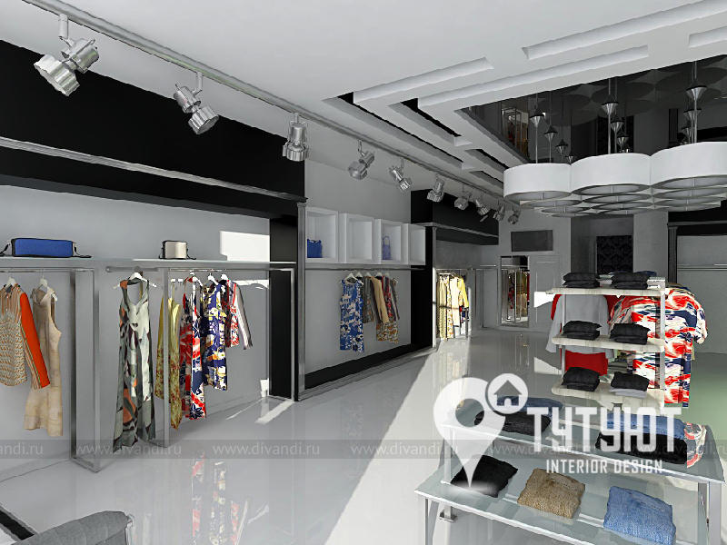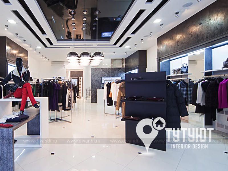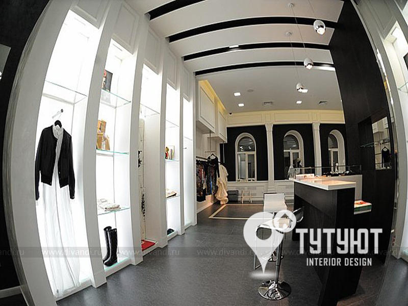 Интерьер мультибрендового бутика построен на строгой контрастной цветовой гамме, что позволяет сконцентрировать внимание покупателя на продукте.