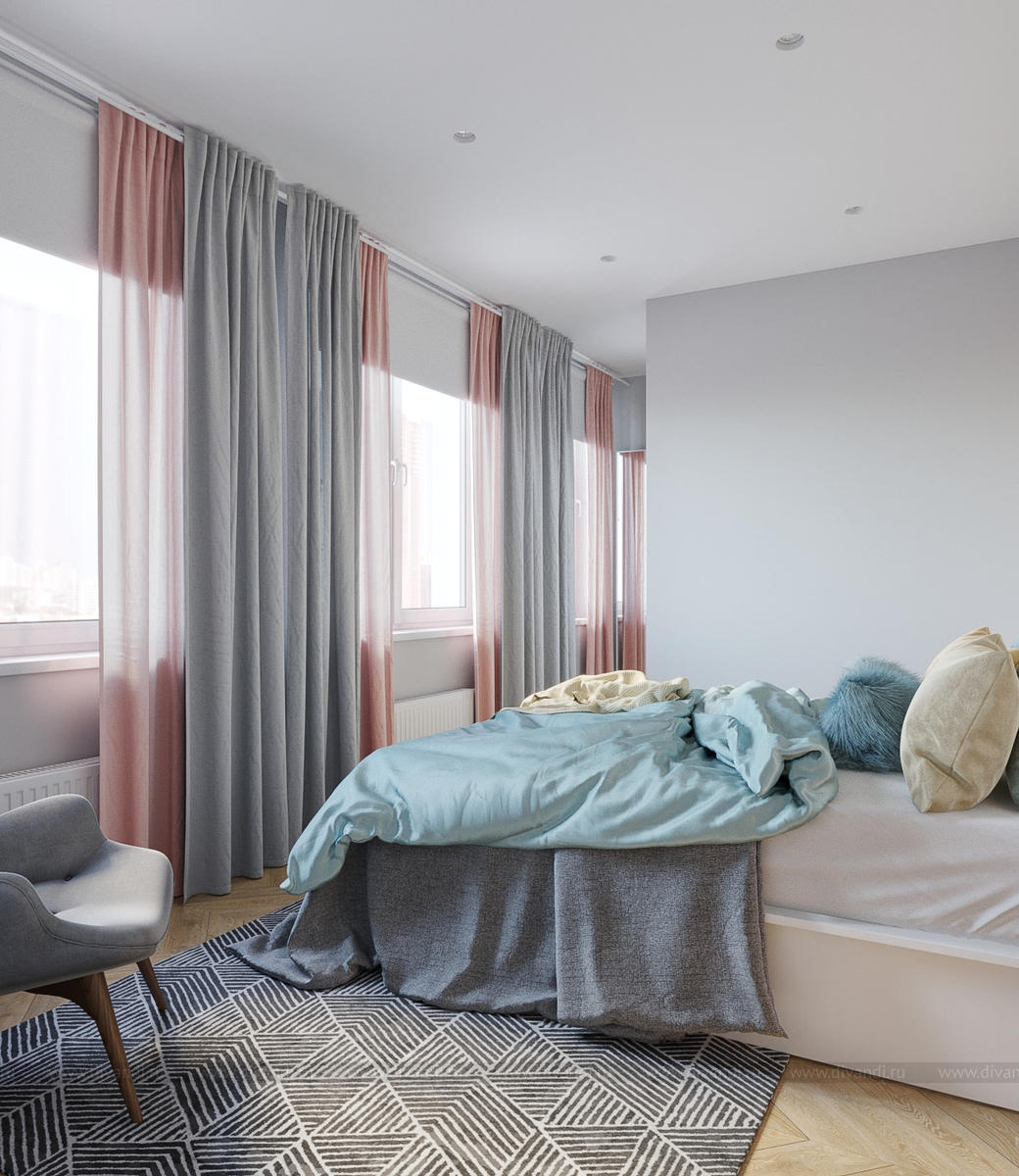 Заказчики рассказали, что мечтают в новой квартире пить утром кофе и любоваться видом на город из окон. Мы подумали о том, как здорово начинать день с наблюдения рассвета из окон своего дома, наблюдать, как из ночной пустоты вдруг появляются сначала бледные полосы света, а затем все разгорающиеся, яркие растяжки цвета от голубого к красному. Это зрелище никогда не надоедает, вдохновляет, настраивает на хороший день. Так возникла концепция «Магия рассвета».