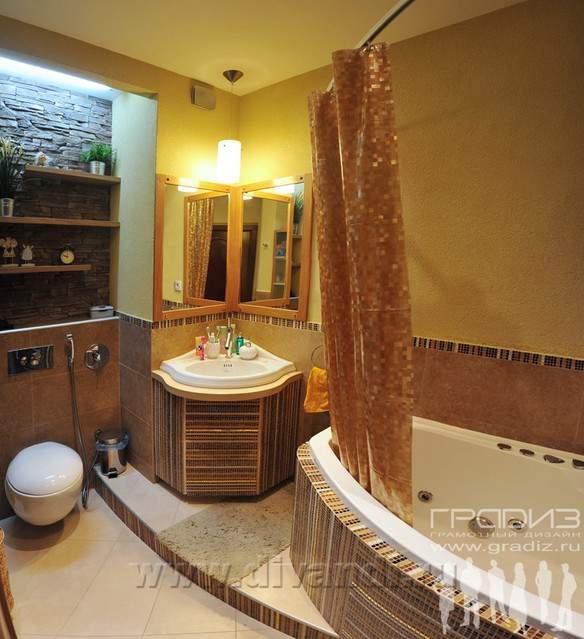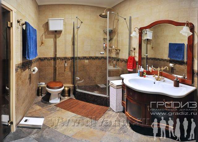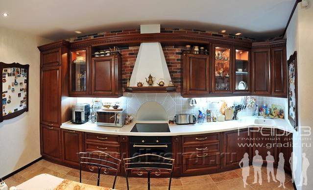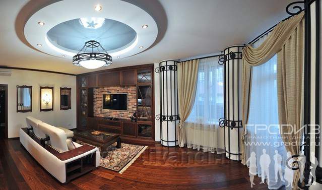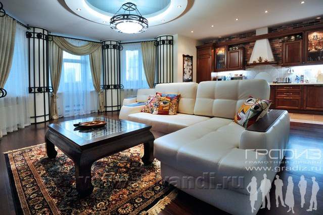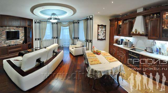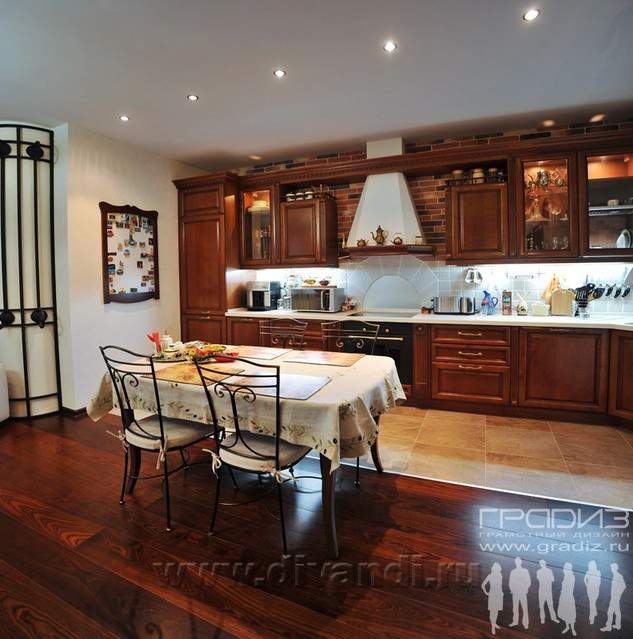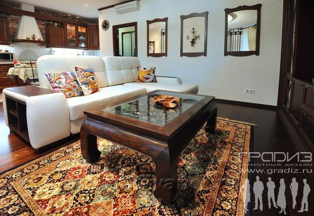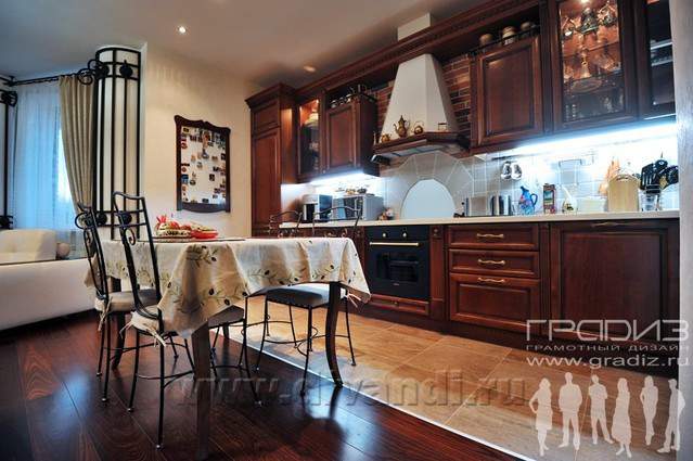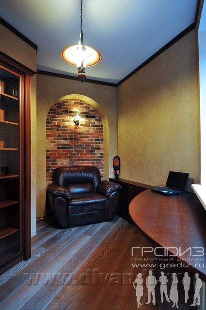В современном шумном городе начинаешь скучать по детству, по тихим маленьким улочкам, по солнцу, от которого хочется укрыться в тени деревьев. Поэтому квартиру, расположенную в самом центре города, хочется сделать максимально уютной и приближенной к природе, к очагу загородного домика. Дизайнерам «Градиз» удалось выполнить не простую задачу – мановением мысли и творчества в трехкомнатную квартиру, состоящую из гостиной, кухни и комнаты, удалось вписать и кабинет, и гардероб, и спальную комнату, и кладовку, и даже еще одну комнату для ребенка. Уже с порога квартиры создается ощущение, что попадаешь в другой мир. Здесь стираются границы между улицей и домом. В самую жаркую пору древние камни и кирпичные стены дадут свежесть в полутемном интерьере. А в гостиной-кухне будет приятно собрать друзей, угостить их чаем из самовара с пирогами, вынутыми из печи.