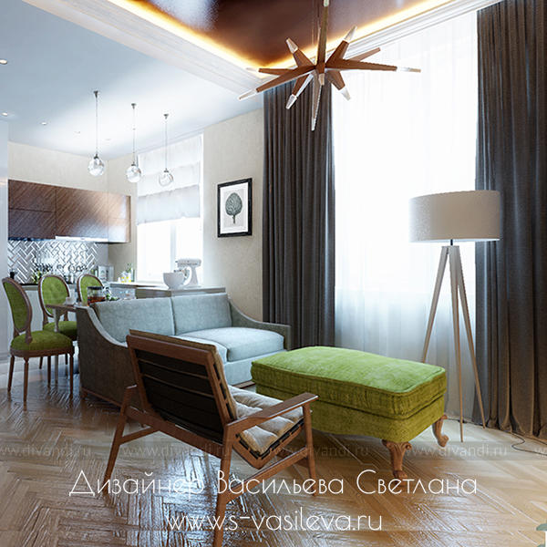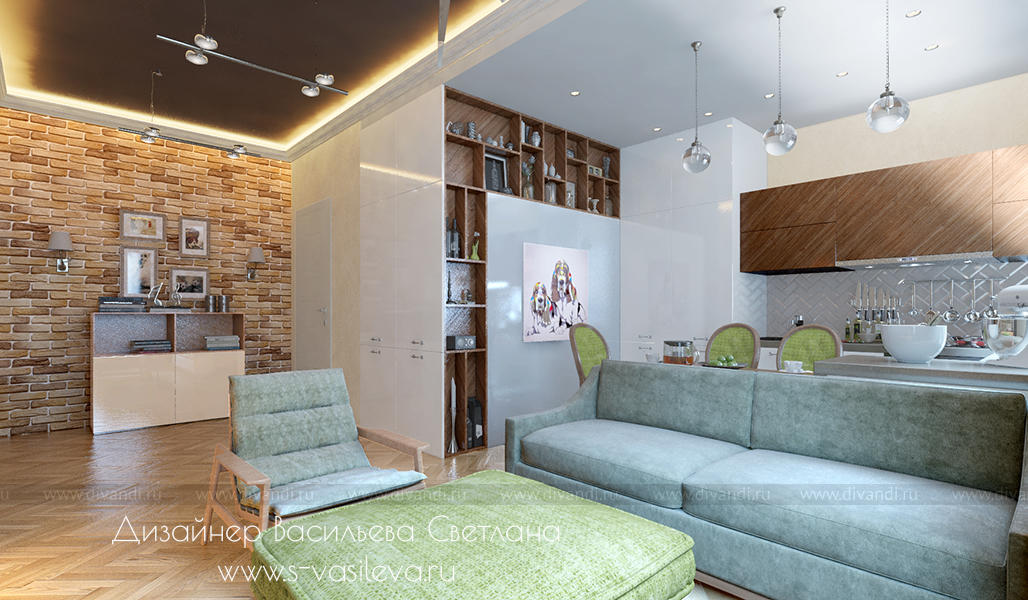 Проект двухкомнатной квартиры, где объединили кухню-гостиную и часть коридора, создав единое, многофункциональное пространство.