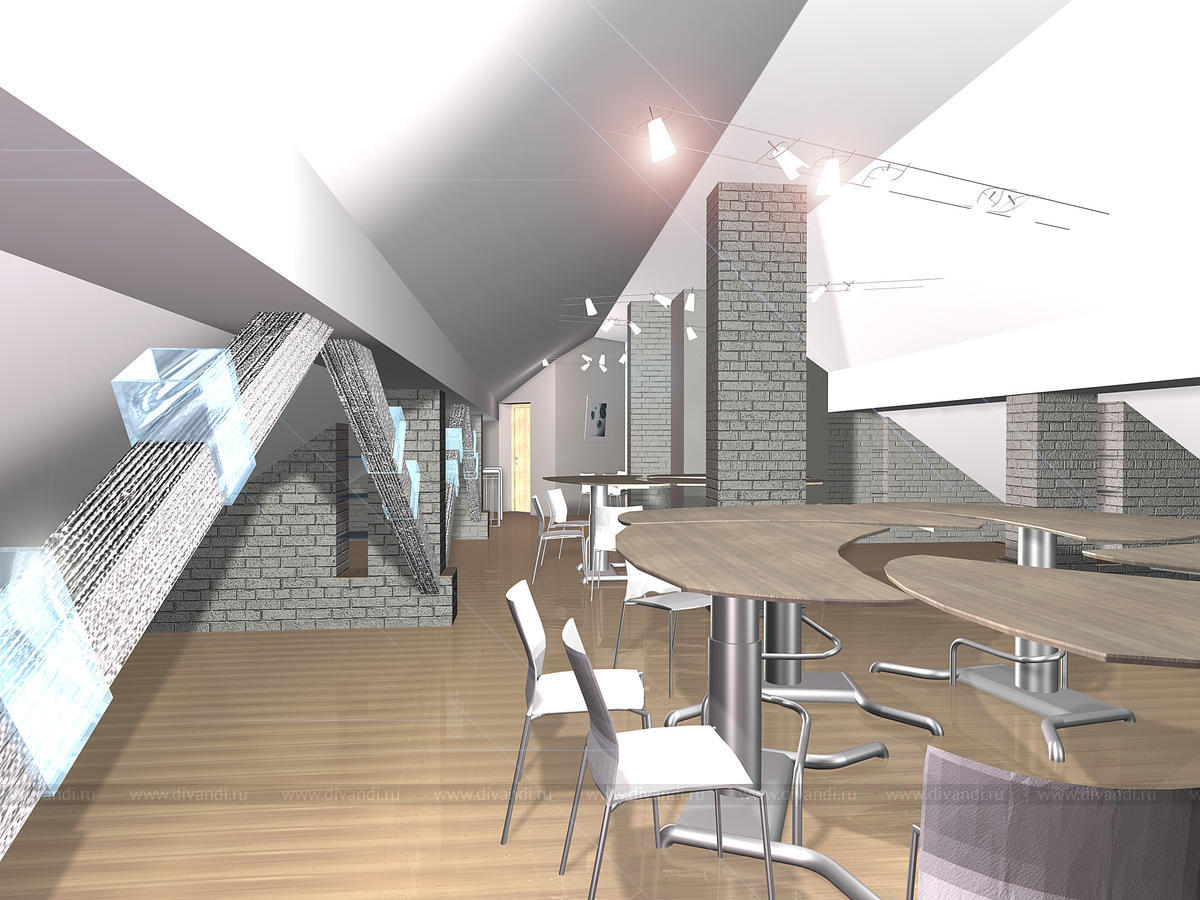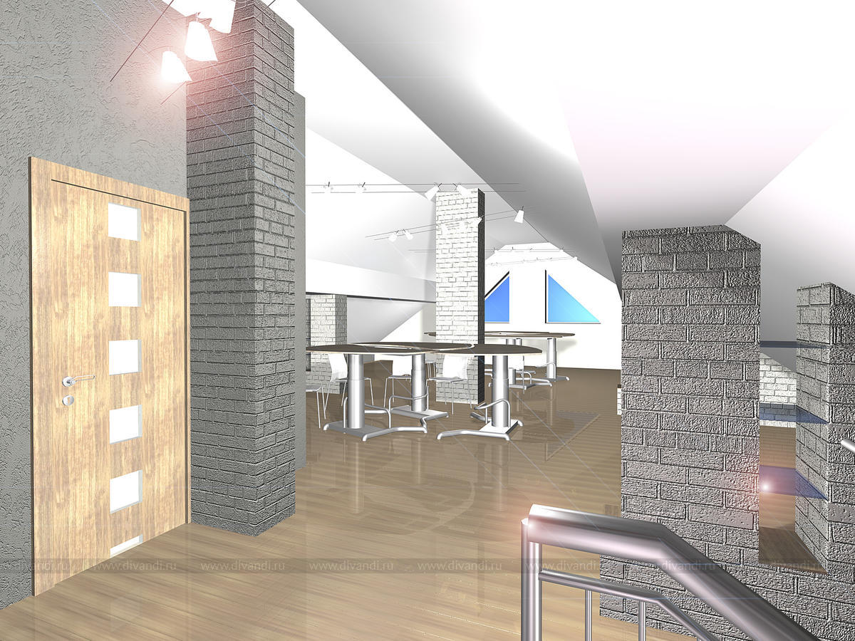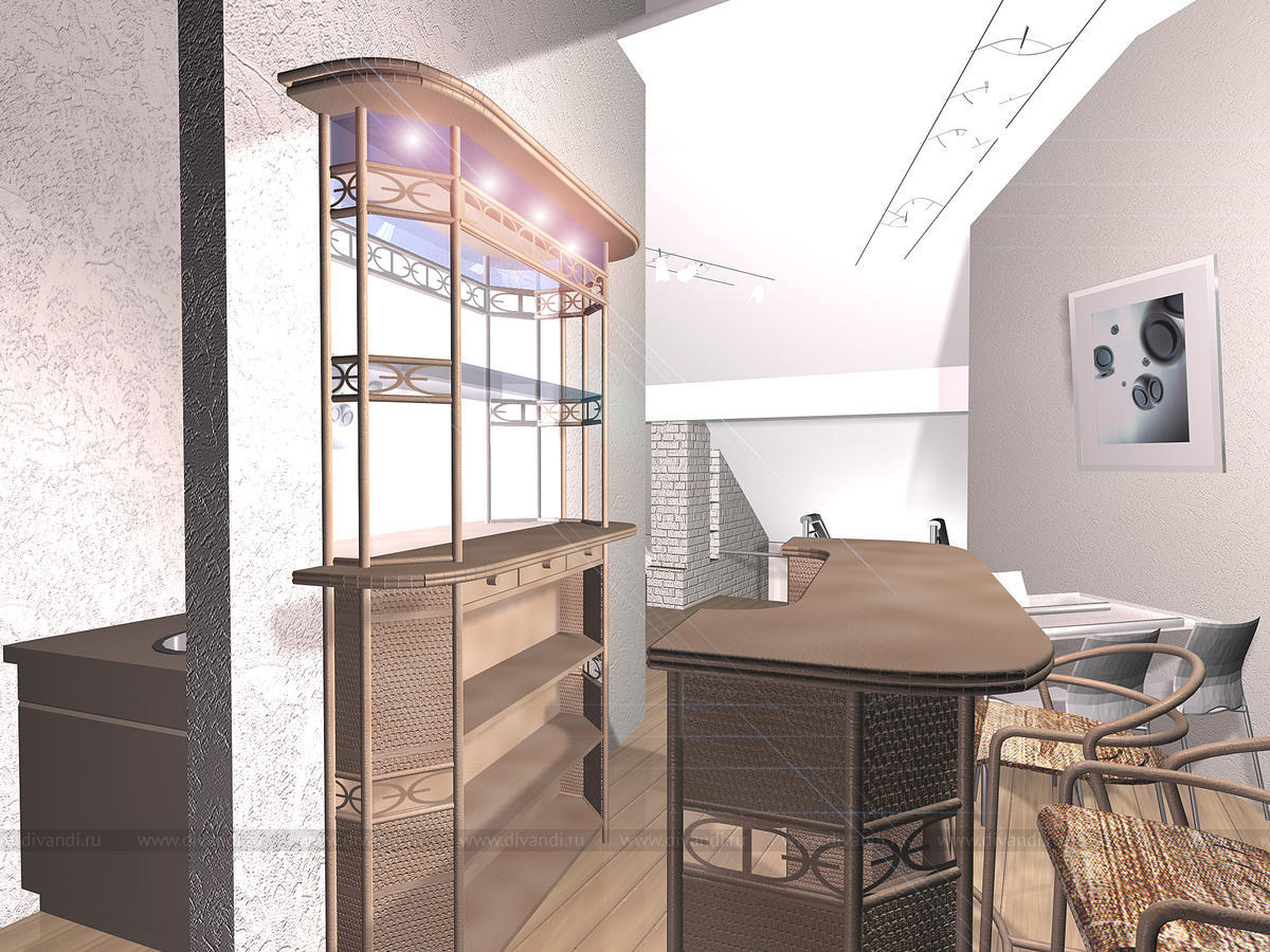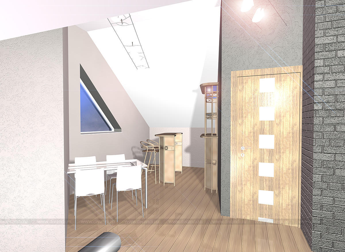 Сложное пространство мансарды объединят несколько функциональных зон: отдыха, зону для встреч, бара и небольшой кухни и сан.узел. Кирпичная кладка стен выкрашена в молочный оттенок, по желанию заказчика выбрана мебель из ротанга.