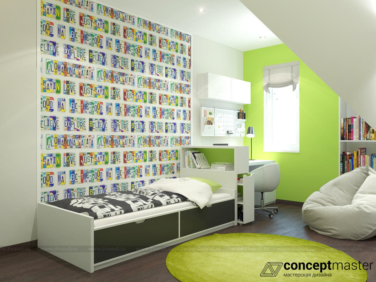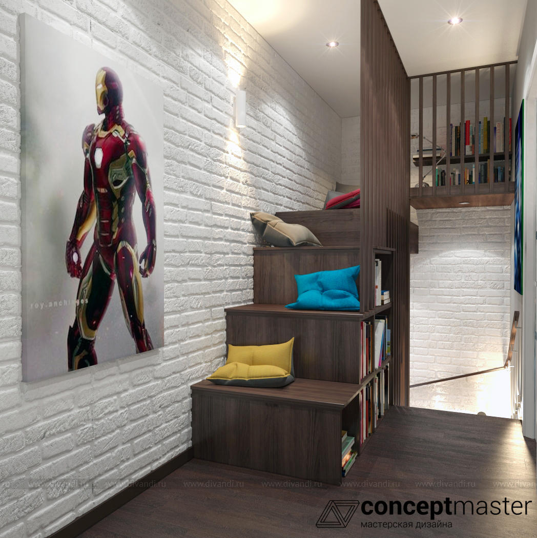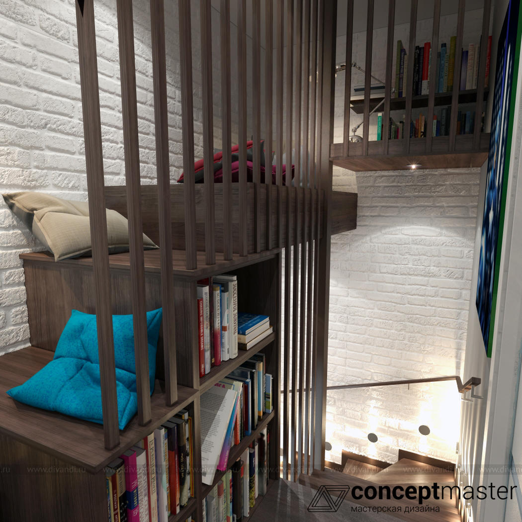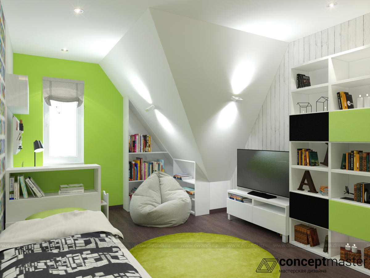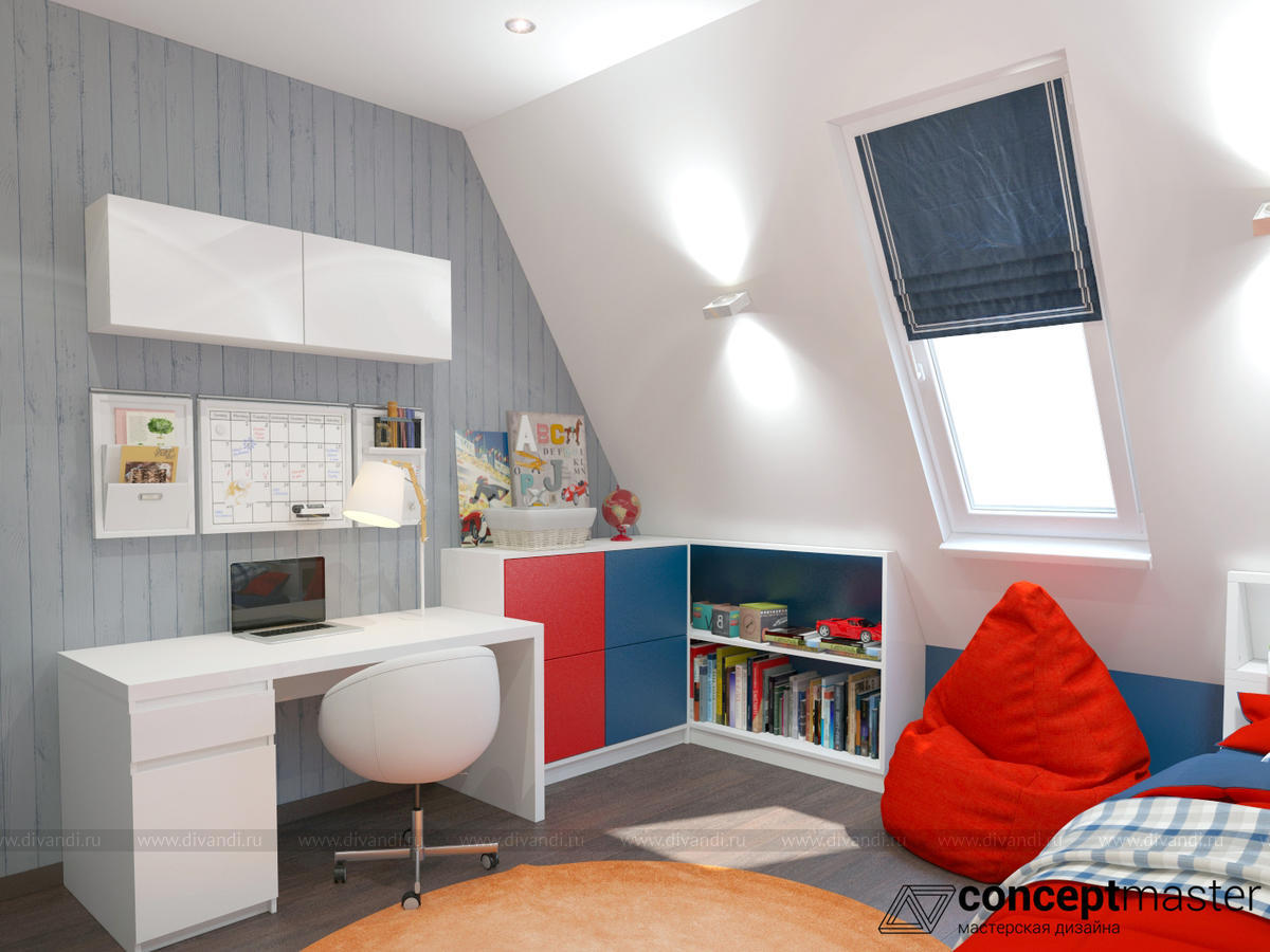 Мансардный этаж с двумя детскими в таунхаусе. На данном этаже было принято решение расположить 2 детские для мальчиков. В холле перед детскими, мы постарались максимально использовать пространство холла. Поэтому решено было сделать второй уровень над лестницей, где расположилось место для чтения и отдыха.