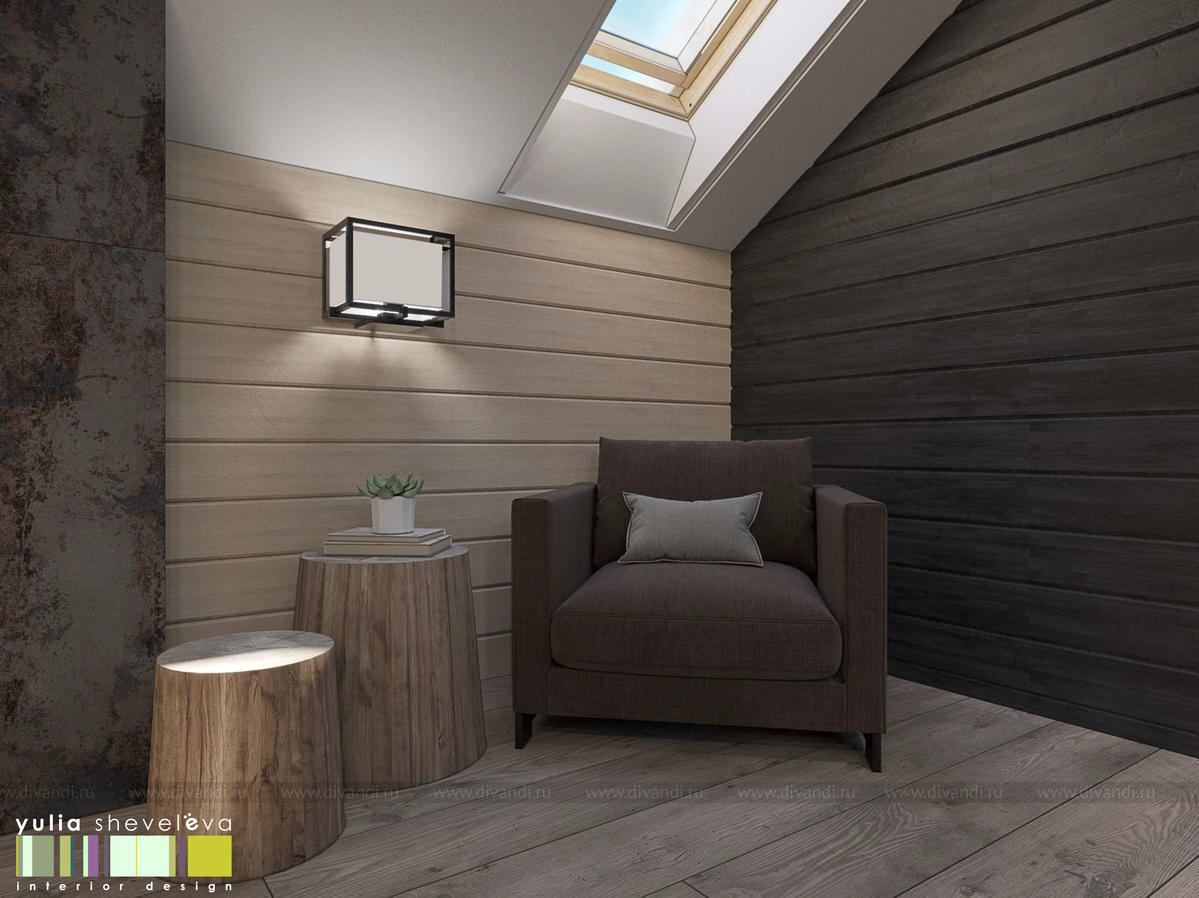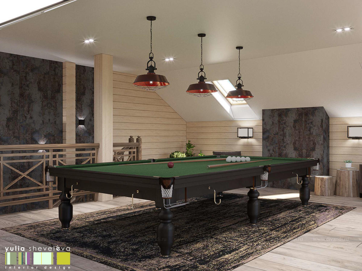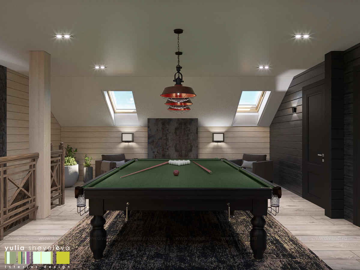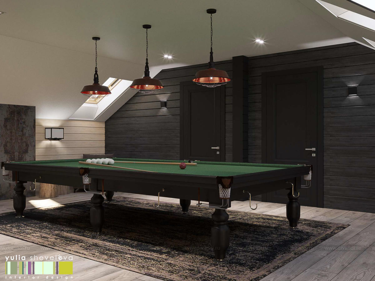 На втором этаже размещена бильярдная зона и две спальни. В качестве источника естественного света в интерьере выступают мансардные окна. Дополнительное освещение – точечные светильники и стильные подвесные светильники над столом. Сочетание светлых и темных поверхностей придают особый стиль и атмосферу помещению.