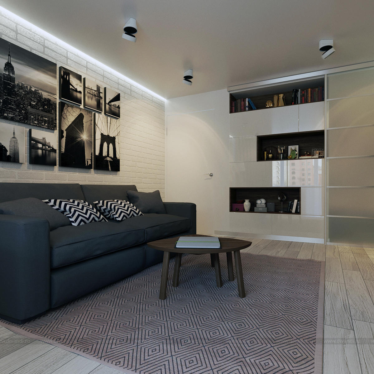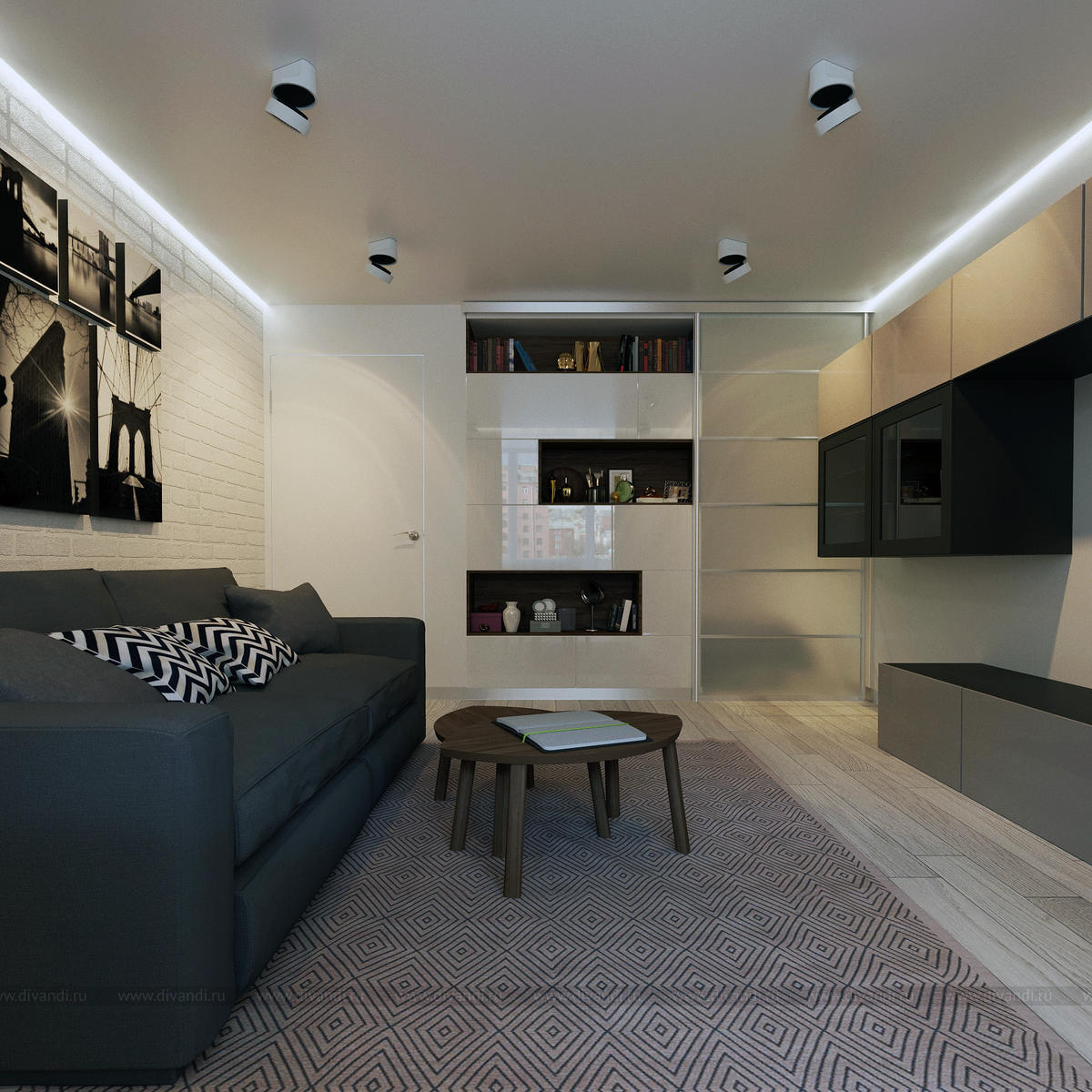 Гостиная, совмещенная со спальней, где обустроены места для хранения.