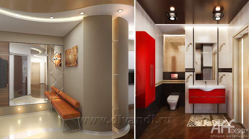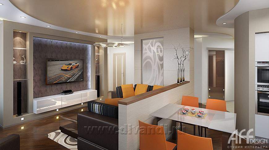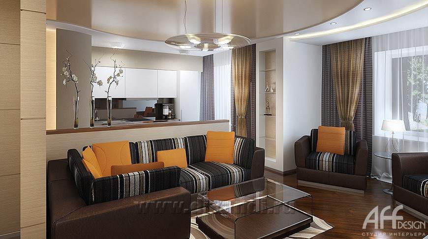 Двухкомнатная квартира, оборудованная под мини отель. Зона кухни и гостиная объединены. Материалы - обои под покраску и готовые фабричные обои. Пол - сочетание натяжного и гипсокартона. Цветовое решение интерьера - кофейный в сочетании с глубоким оранжевым. Санузел - беж с ярко красными аксессуарами.