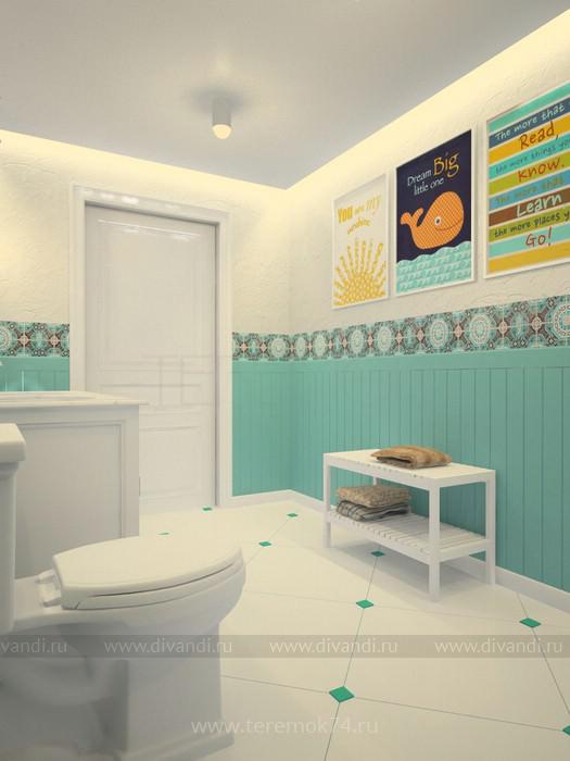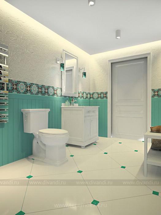 Санузел в эклектичном стиле сочетает в себе черты прованса и мароканские мотивы, в использованных материалах.