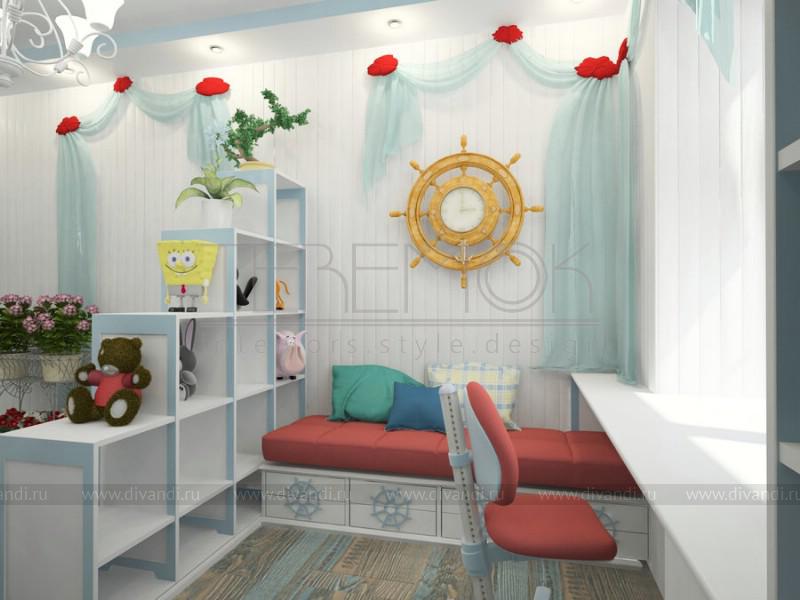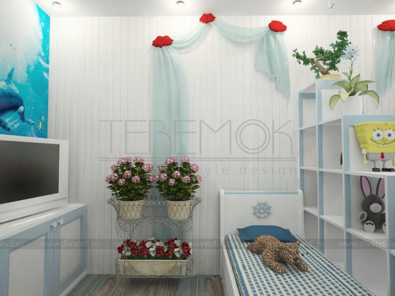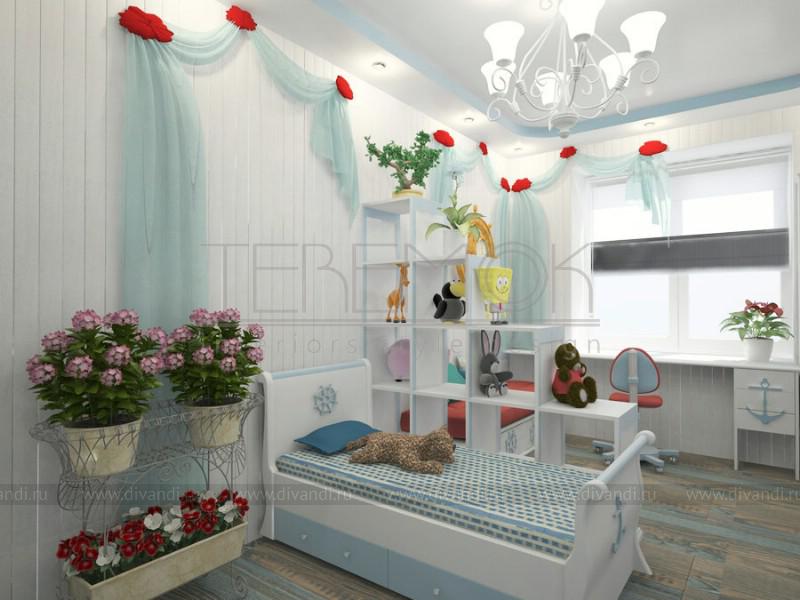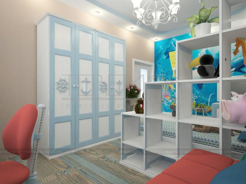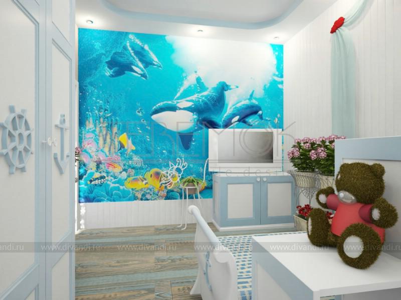 Интерьер для этой детской для девочки восьми лет выполнен в морской тематике, так мы использовали светлые тона для оформления стен, на которую разместили деревянную вагонку, вся мебель выполнена в светлых тонах, для декора использовали бирюзовый текстиль с яркими акцентами в виде цветов. На основной стене задающей настроение всему интерьеру разместили художественную роспись с подводным миром. Детали декора, также подобраны для создания общего морского впечатления.